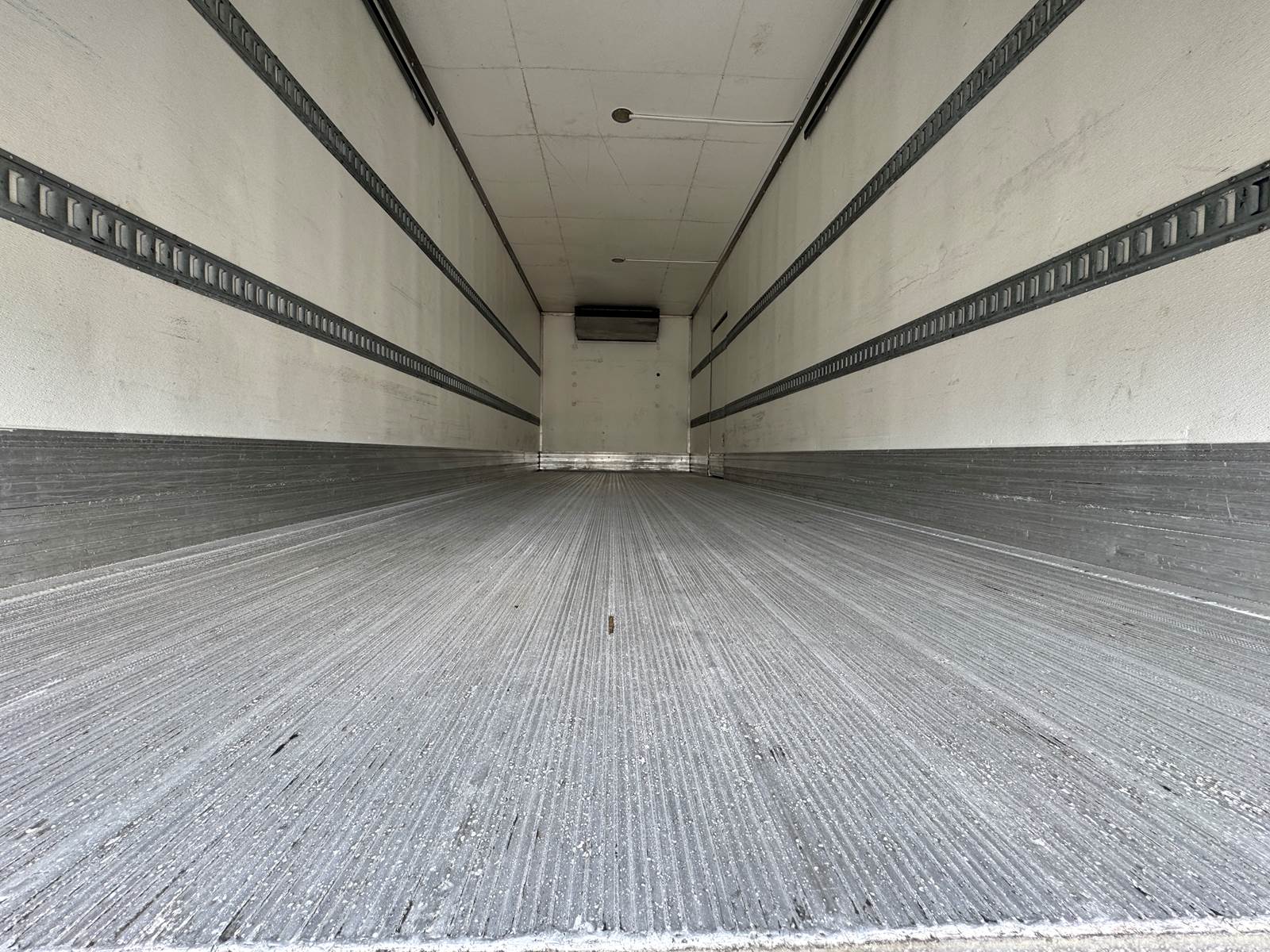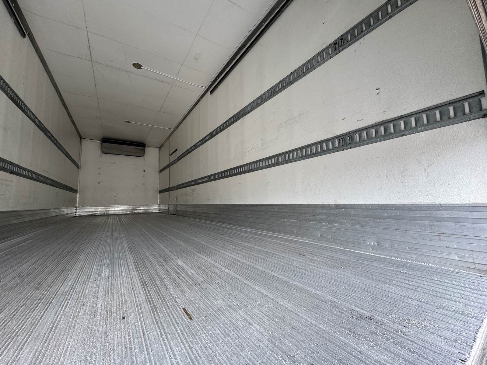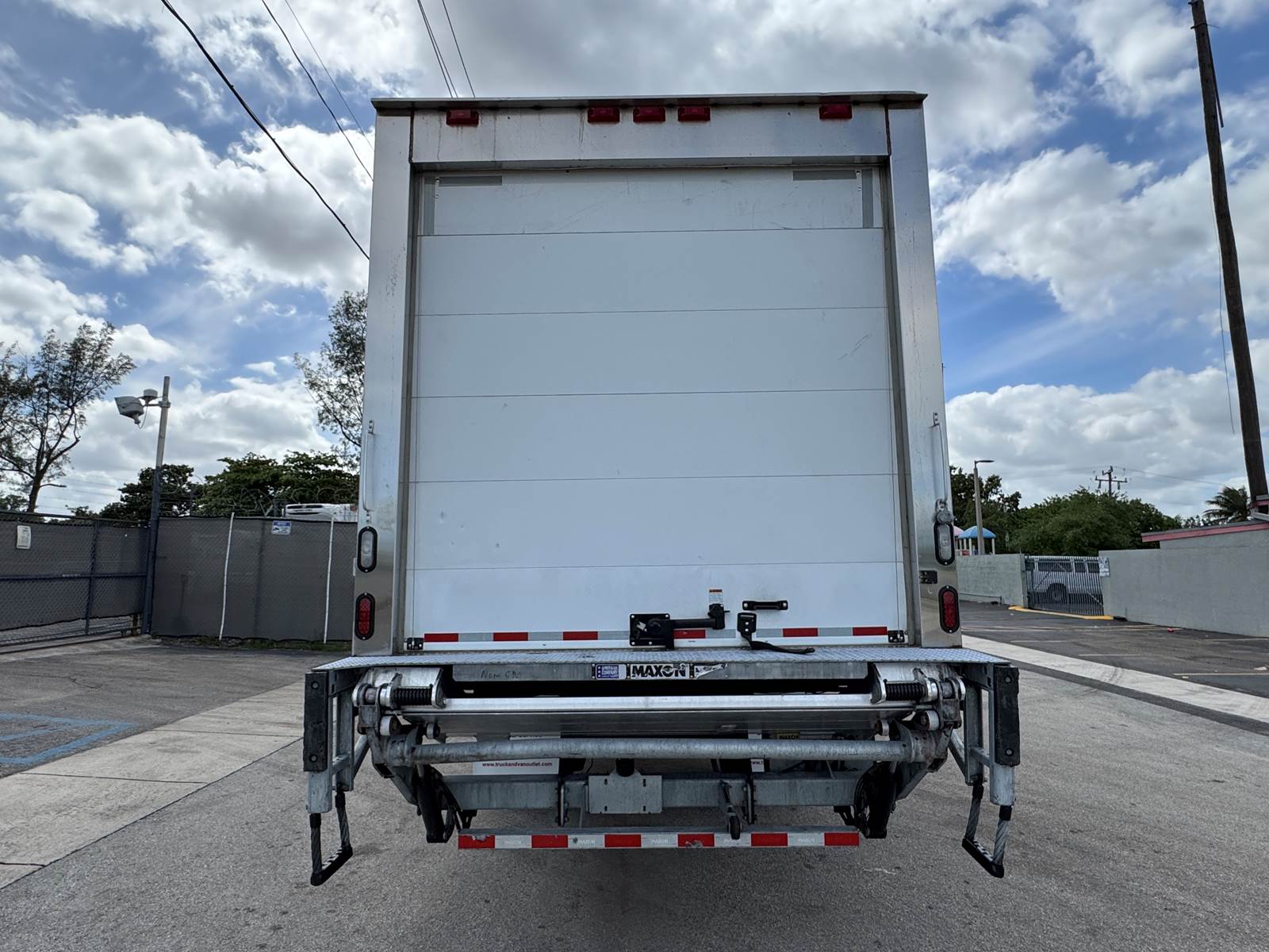 The refrigerated body is manufactured by Morgan (Model GVSR10326102) and measures 26 feet in length, 102 inches in width, and 103 inches in interior height. The cargo area is fully insulated and finished with Kemlite lining, aluminum construction, and two rows of aluminum E-track for load securement. The unit features a roll-up rear door and a curbside access door for convenient loading and unloading. The Thermo King T-880R-50 standalone refrigeration system includes electric standby capability and shows 7,123 reefer hours. Cargo handling is enhanced with a Maxon GTP-3000 tuck-under liftgate rated at 3,000 lbs capacity.