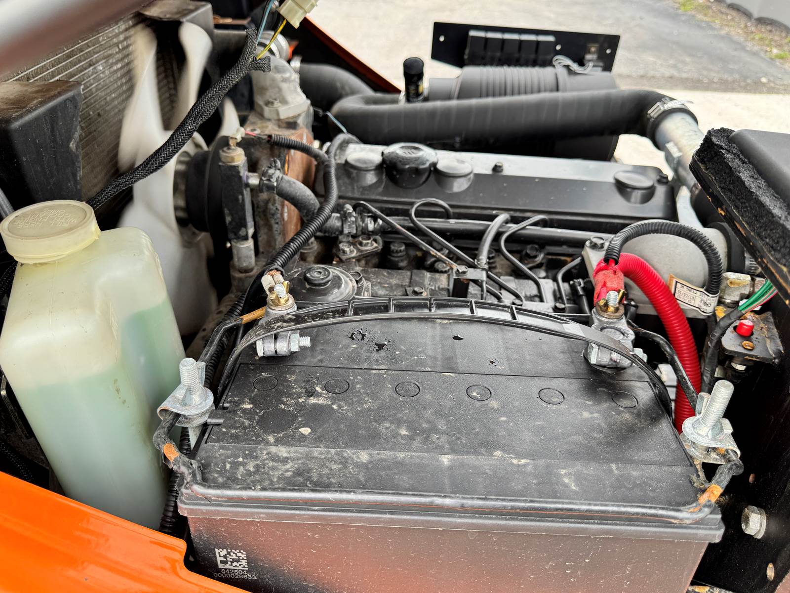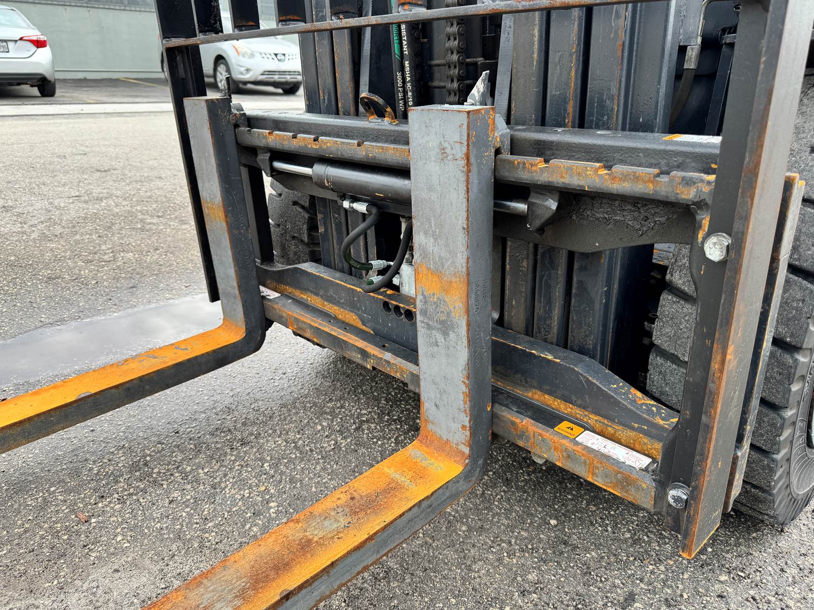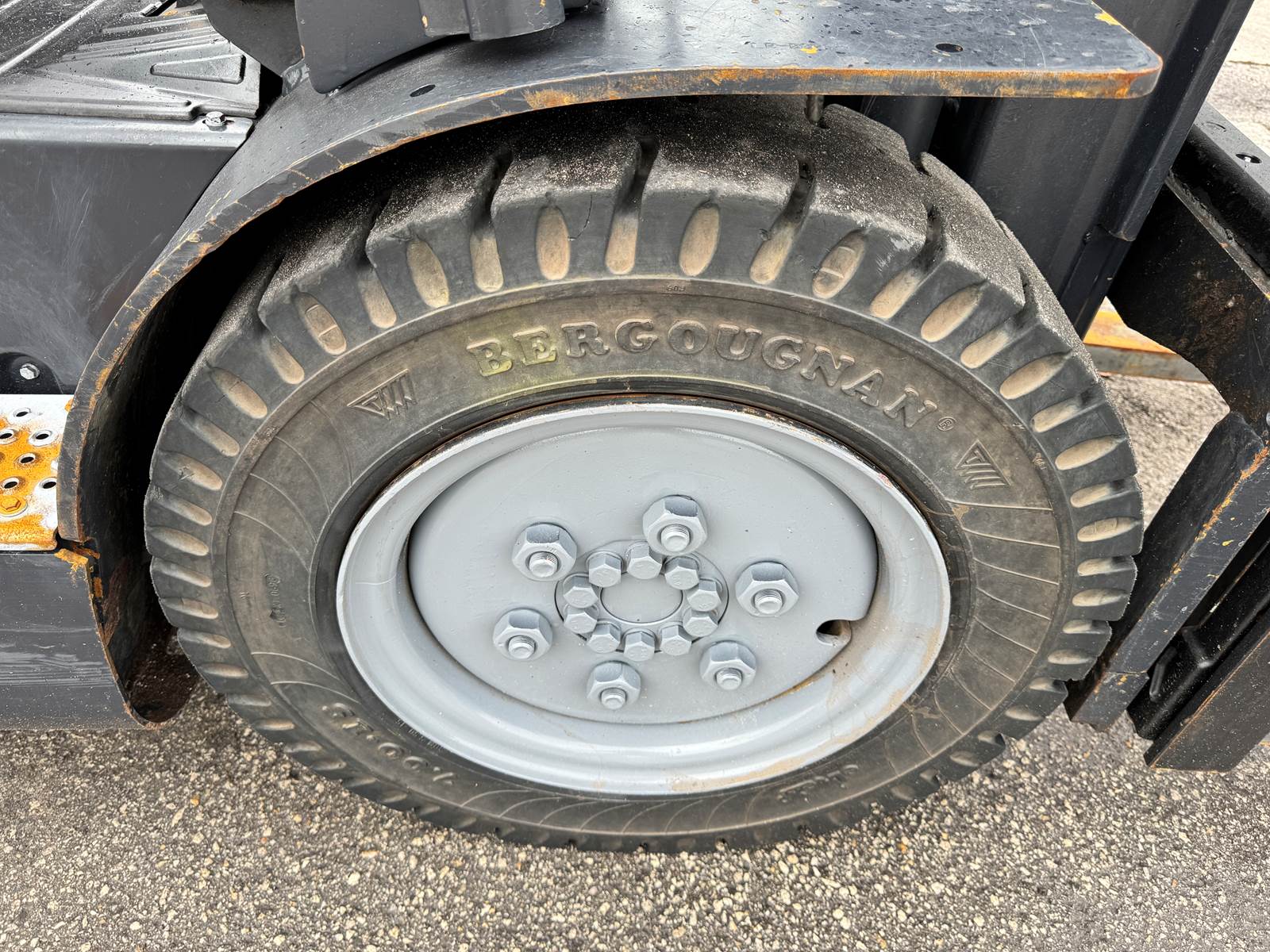 The forklift features a 4,600-pound lifting capacity, 60-inch forks, and a 3-stage mast providing excellent lift height and flexibility. It is equipped with pneumatic tires for improved traction on rough surfaces and includes a hydraulic side shift for easier, more precise load placement.