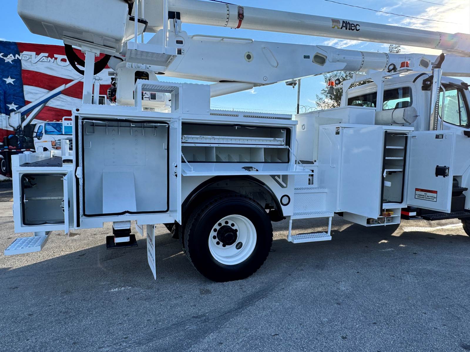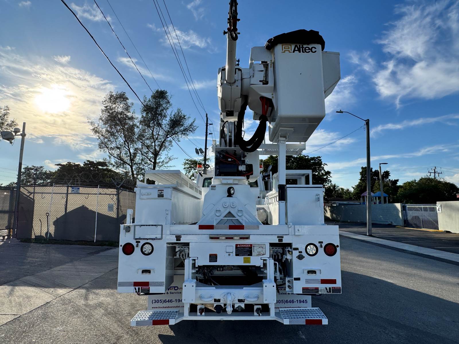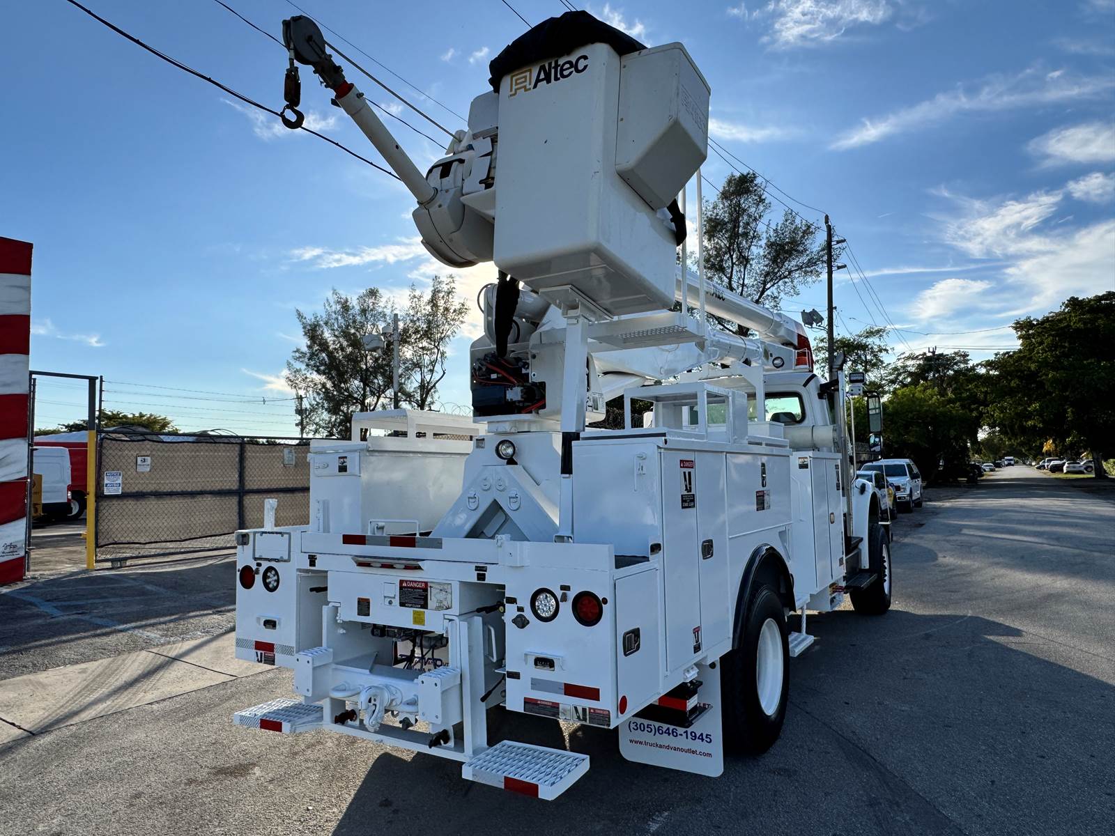 The Altec AA755 articulating boom provides a 60.6-foot working height, 55.6 feet to the bottom of the platform, and a 38-foot side reach. It includes a single-man, side-mounted insulated platform rated for 400 lbs and offers smooth proportional control through the Altec ISO-Grip system. The aerial unit is fully insulated to Category “C” standards and features a material-handling jib rated for 1,500 lbs, four A-frame outriggers for stability, upper boom compensation, and dual hydraulic tool circuits at the platform.