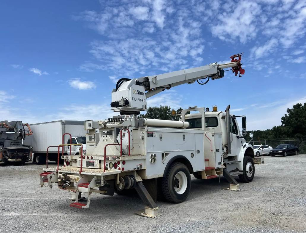 The 2015 Freightliner M2 106 equipped with an Altec DL45B digger derrick is a heavy-duty utility and construction truck built for pole setting, line installation, and power infrastructure operations. Powered by a Cummins ISL 8.9L turbo diesel engine producing 270 horsepower and paired with an Allison 3500RDS automatic transmission, it delivers excellent torque and smooth, reliable performance ideal for demanding field conditions. With a 33,000 lb GVWR and Class 7 chassis, it provides outstanding stability, strength, and operational capability.