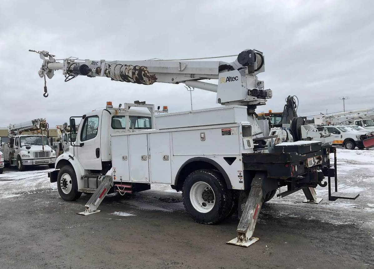 Offered for sale is a 2015 Freightliner M2-106 digger derrick truck equipped with an Altec DM47B-TR 3-section telescopic digger derrick, professionally configured for utility, pole setting, and line construction operations. This Class 7 heavy-duty truck is powered by a Cummins ISB 6.7L turbo diesel engine producing 250 horsepower, equipped with hydraulic engine brake and exhaust brake, and paired with an Allison 3500RDS 5-speed automatic transmission. The truck features a 4x2 drivetrain with differential lock, diesel fuel system with 50-gallon capacity, and rides on Freightliner spring suspension with air system components. It is equipped with air brakes and a single rear axle configuration. The unit carries a 33,000 lb GVWR, with a 13,220 lb front axle rating and 21,000 lb rear axle rating, supported by a 178-inch wheelbase and steel wheels.