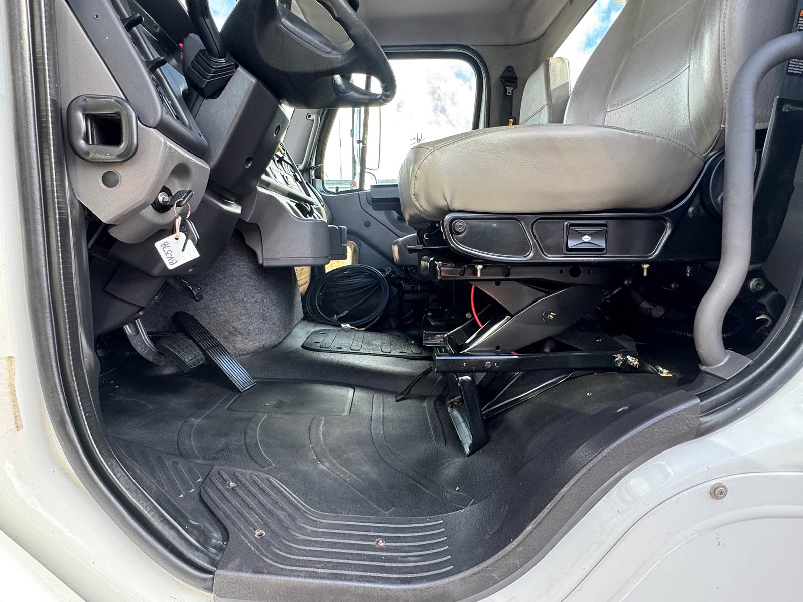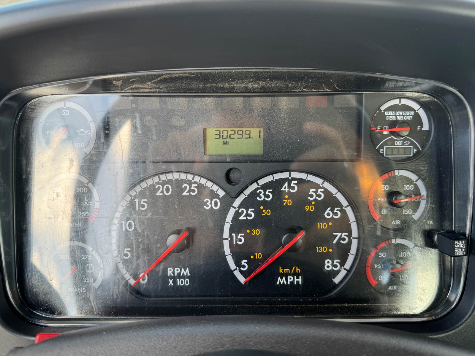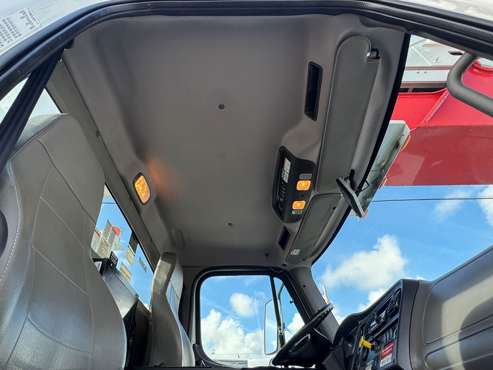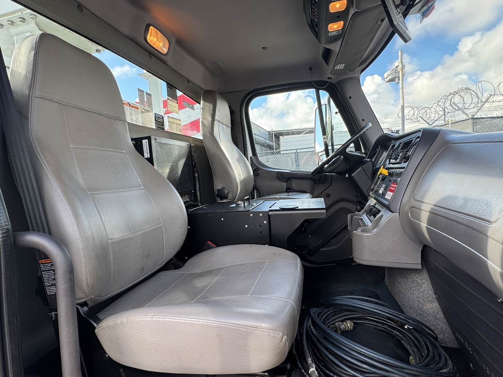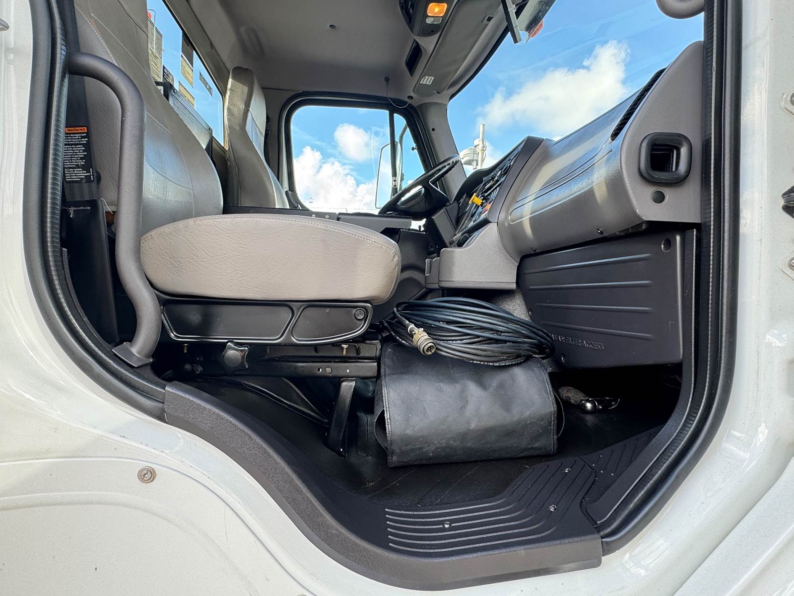The truck is equipped with automatic hydraulic platform leveling, a backup camera, and approximately 3,185 PTO hours. With only 30,297 miles and a dry weight of approximately 59,760 lbs, this unit is described as a one-owner truck with a clean CARFAX history. The interior features a gray regular cab configuration equipped with air conditioning, cruise control, power windows, and power locks, though it is not equipped with collision mitigation systems.