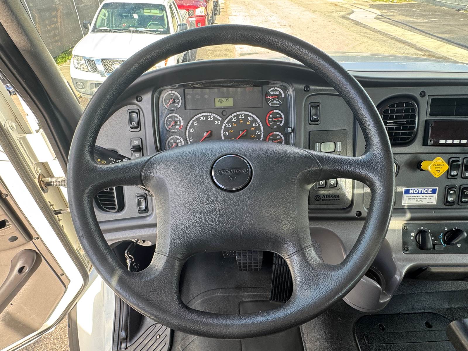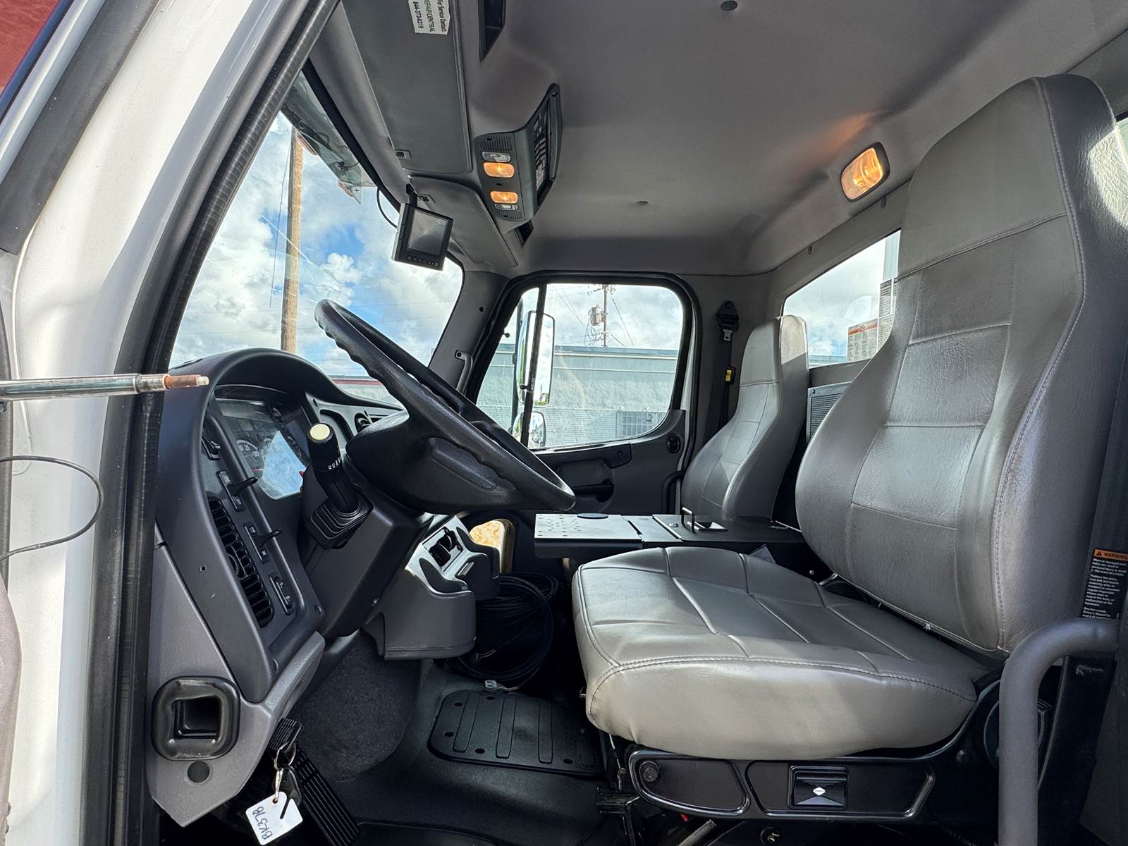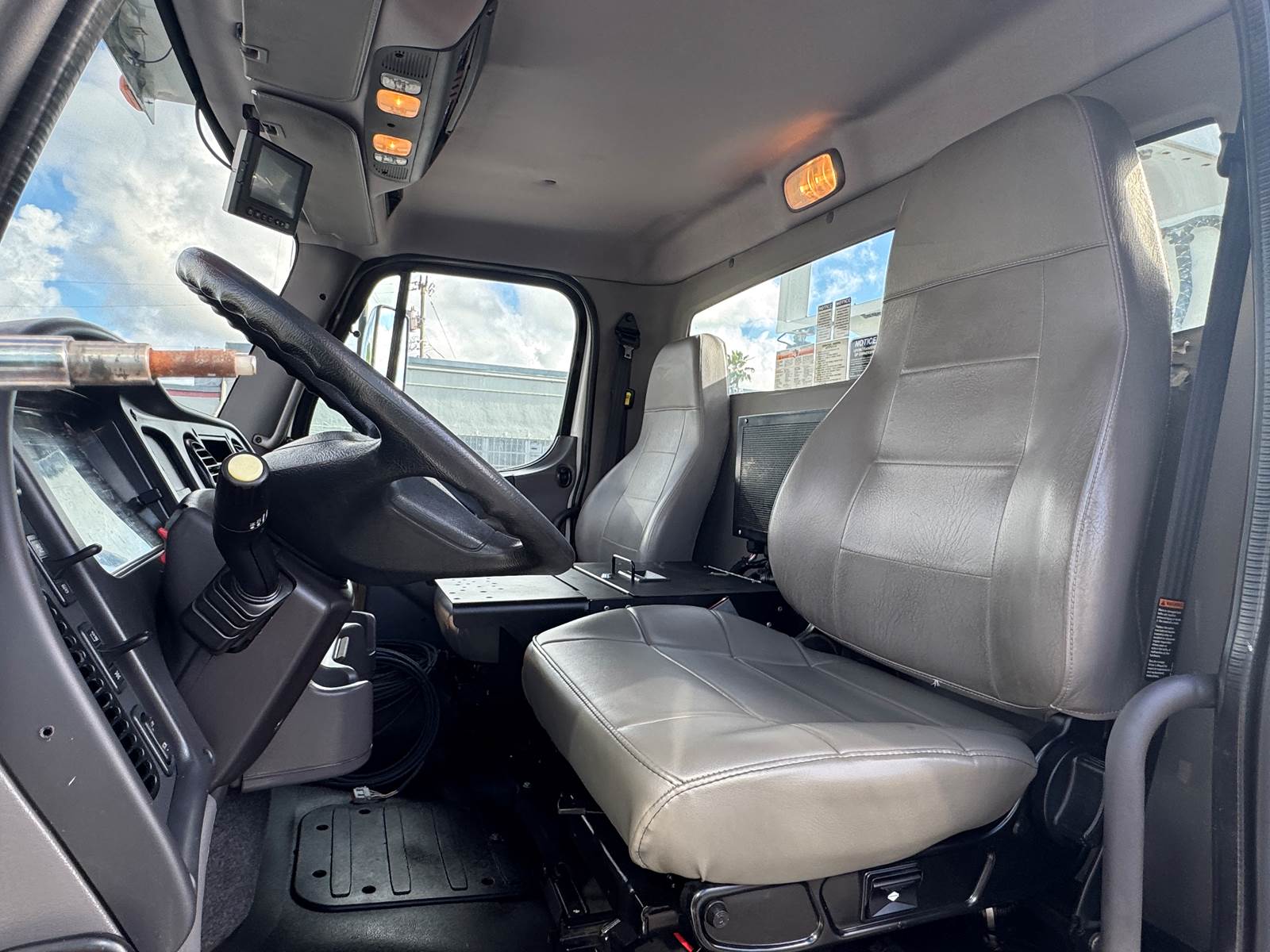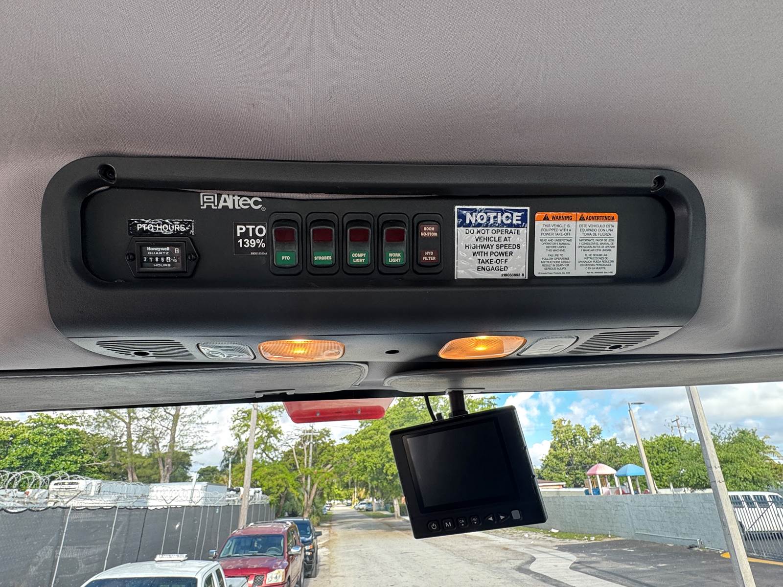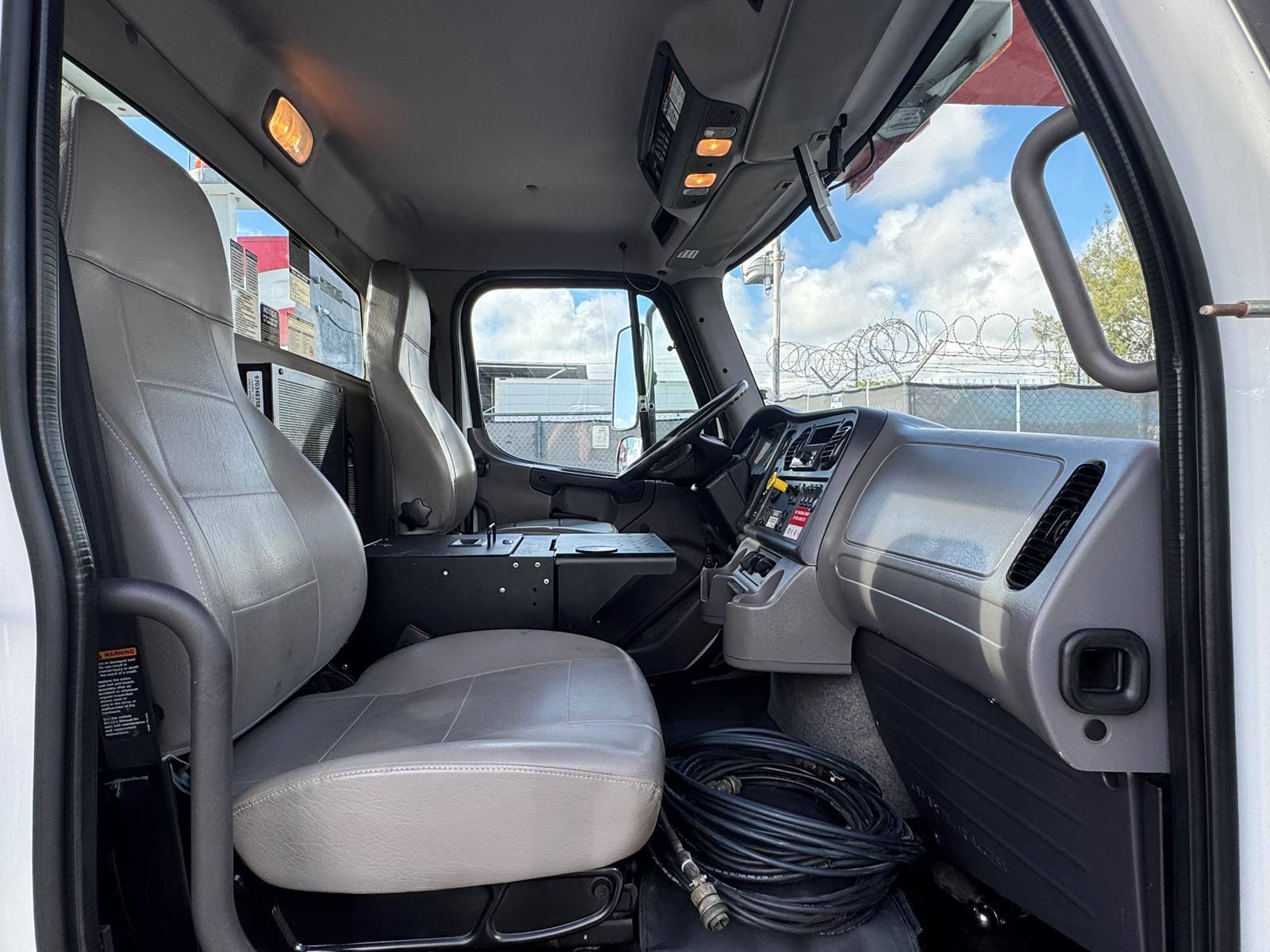 The truck is equipped with automatic hydraulic platform leveling, a backup camera, and approximately 3,185 PTO hours. With only 30,297 miles and a dry weight of approximately 59,760 lbs, this unit is described as a one-owner truck with a clean CARFAX history. The interior features a gray regular cab configuration equipped with air conditioning, cruise control, power windows, and power locks, though it is not equipped with collision mitigation systems.
