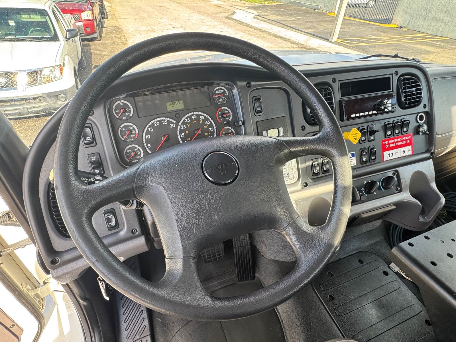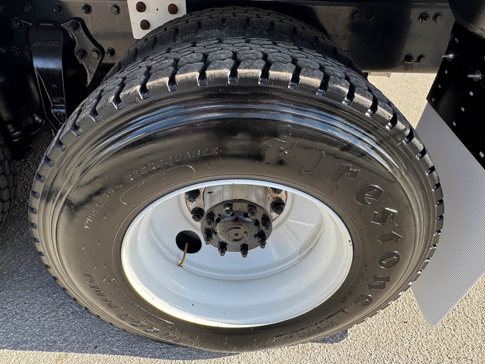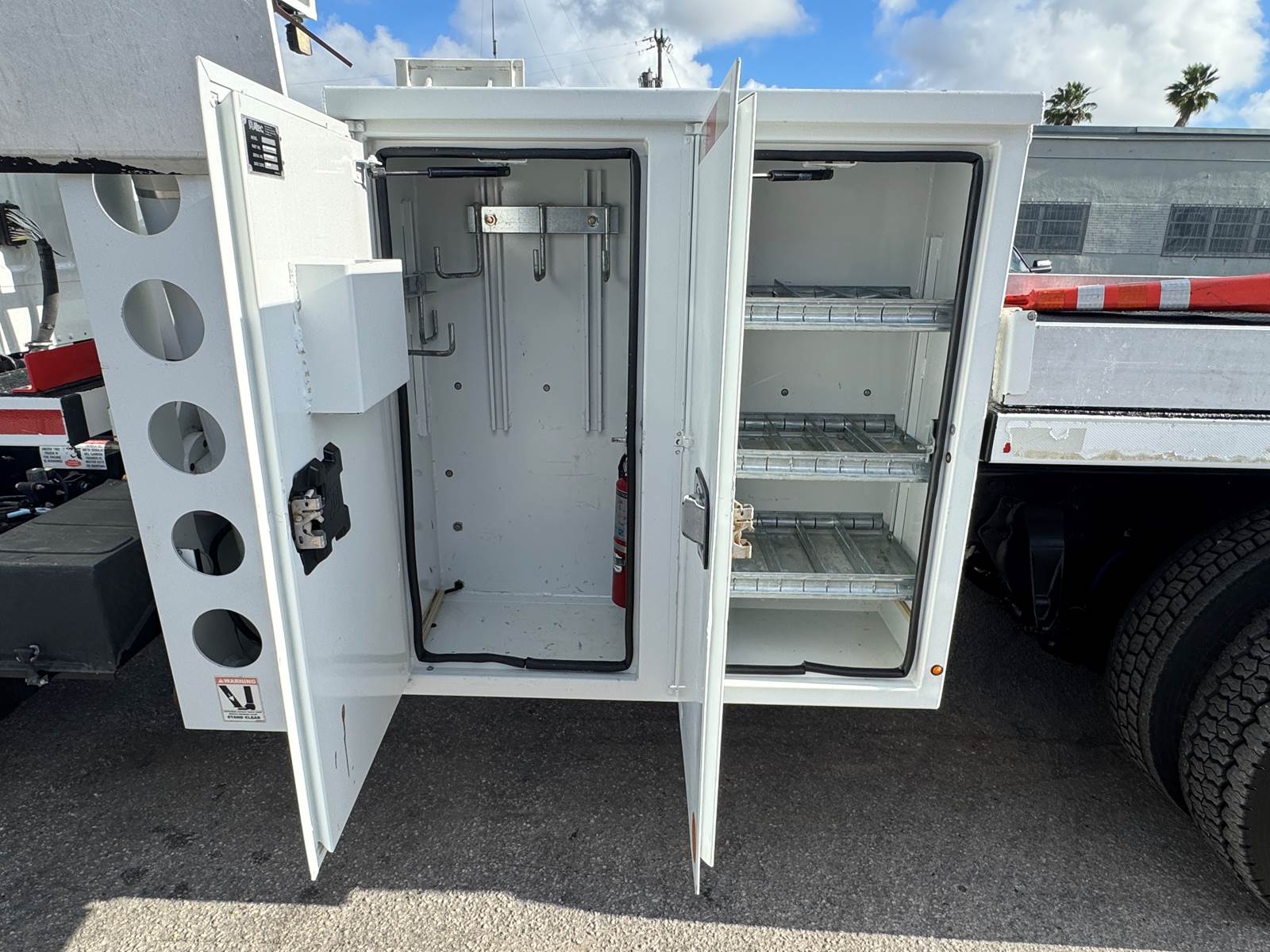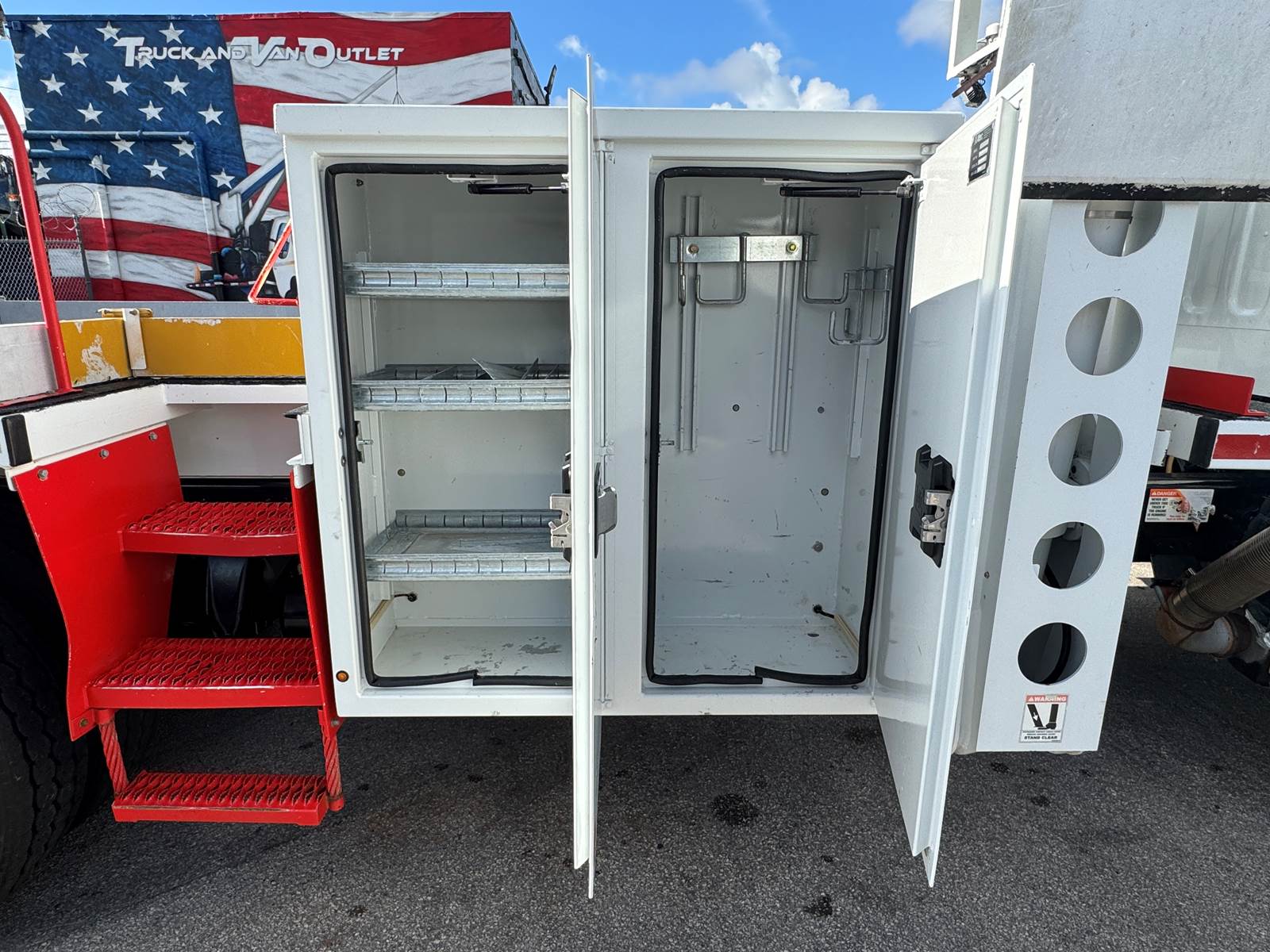 The truck is equipped with automatic hydraulic platform leveling, a backup camera, and approximately 3,185 PTO hours. With only 30,297 miles and a dry weight of approximately 59,760 lbs, this unit is described as a one-owner truck with a clean CARFAX history. The interior features a gray regular cab configuration equipped with air conditioning, cruise control, power windows, and power locks, though it is not equipped with collision mitigation systems.