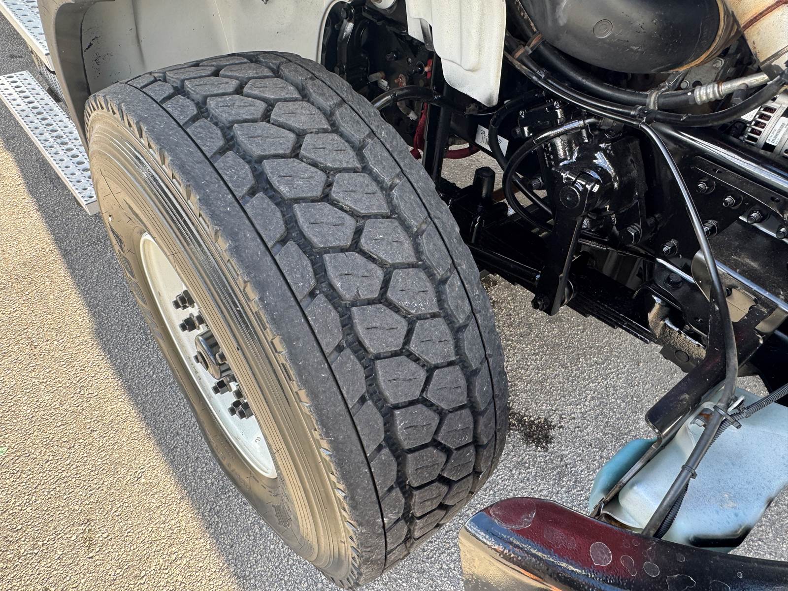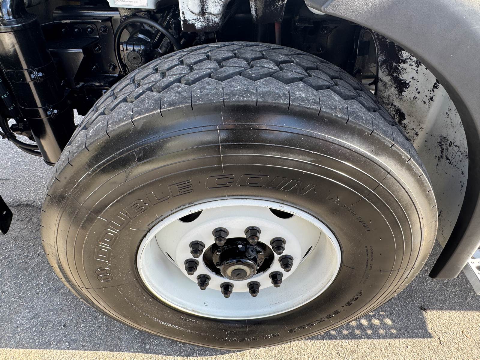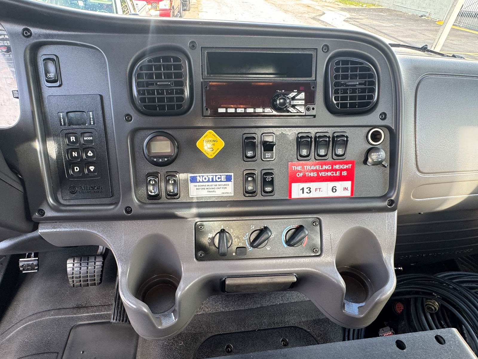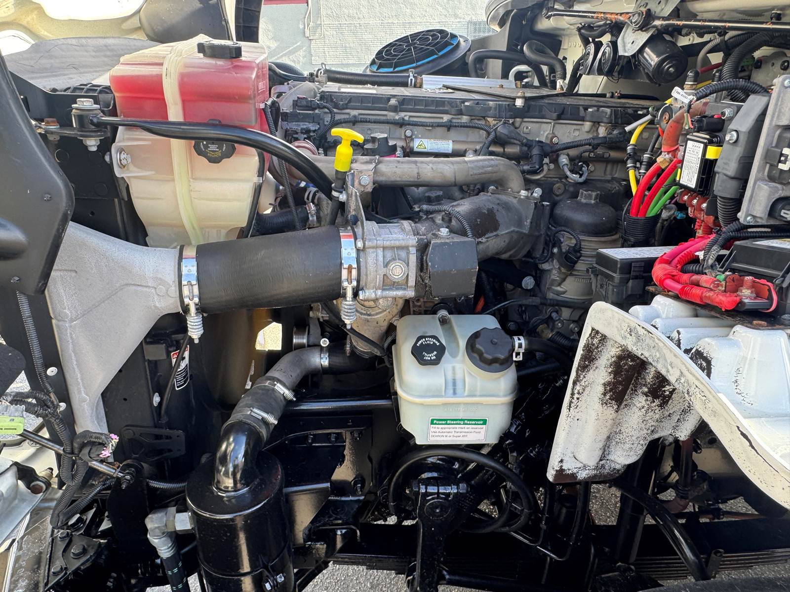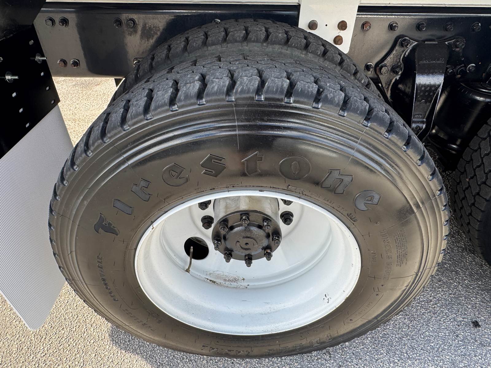 The truck is equipped with automatic hydraulic platform leveling, a backup camera, and approximately 3,185 PTO hours. With only 30,297 miles and a dry weight of approximately 59,760 lbs, this unit is described as a one-owner truck with a clean CARFAX history. The interior features a gray regular cab configuration equipped with air conditioning, cruise control, power windows, and power locks, though it is not equipped with collision mitigation systems.