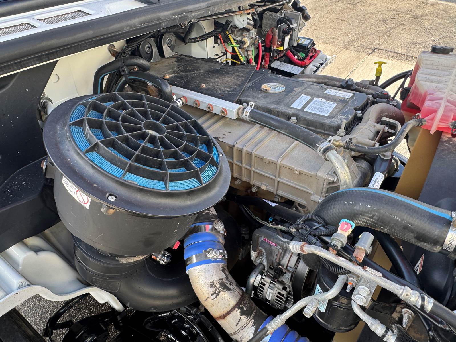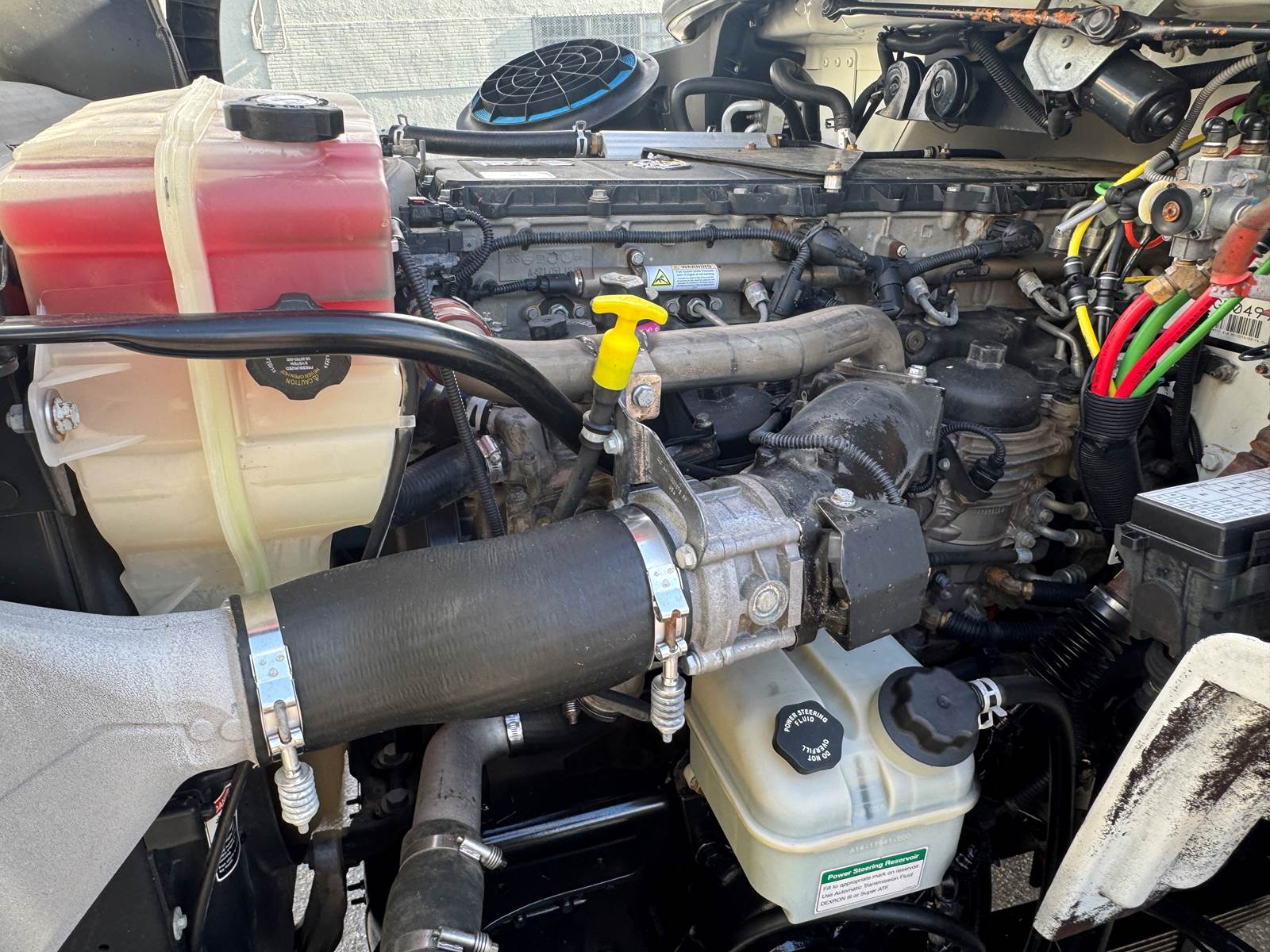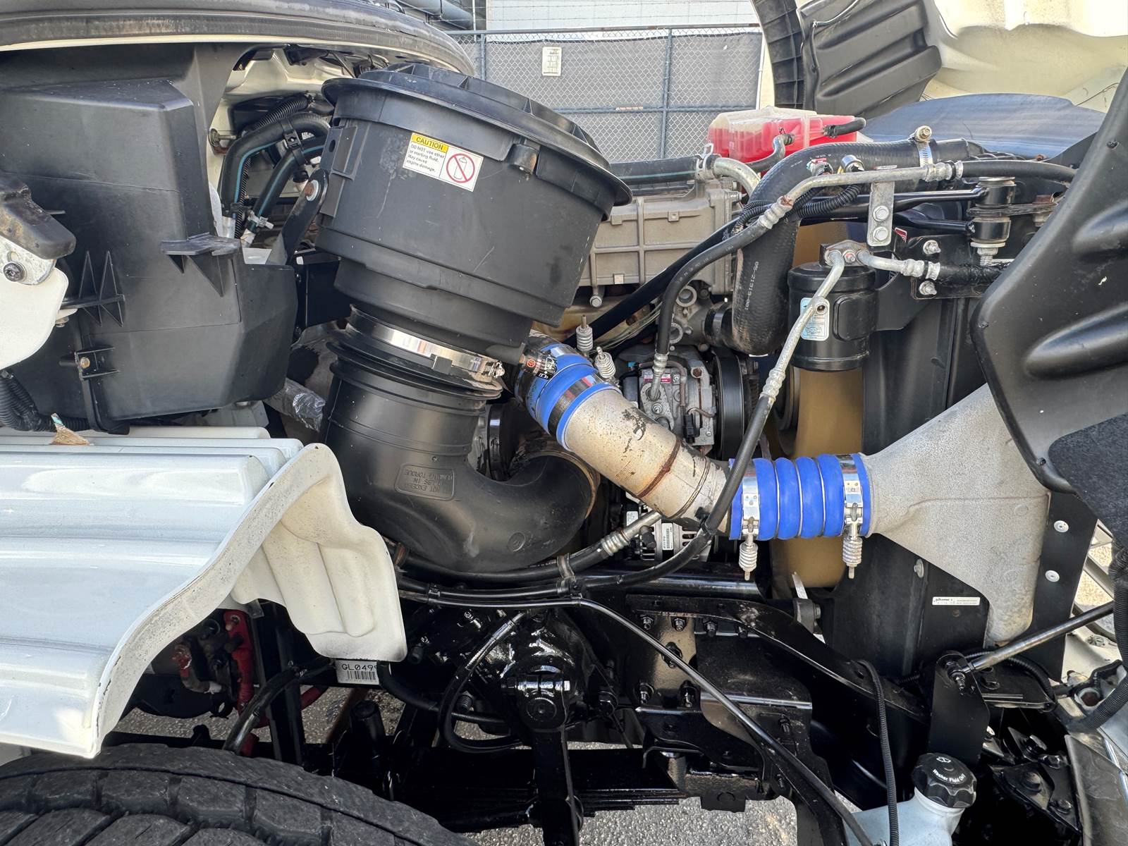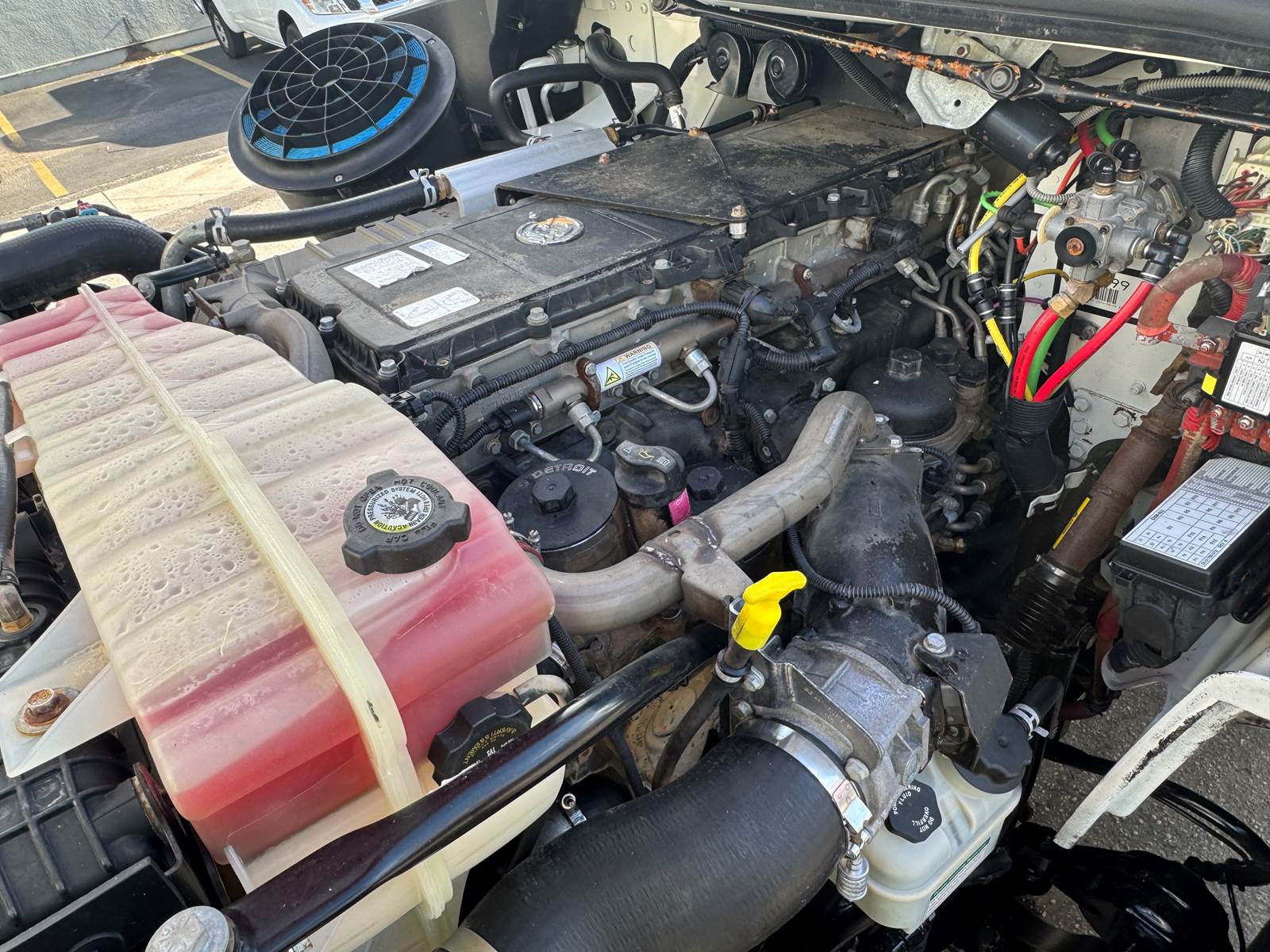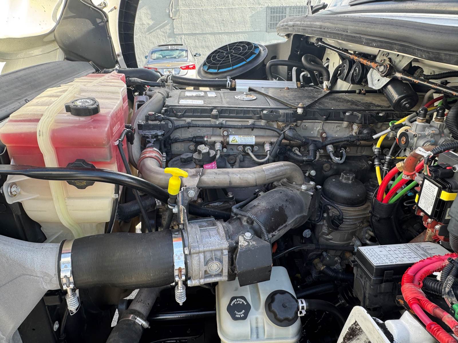 The truck is equipped with automatic hydraulic platform leveling, a backup camera, and approximately 3,185 PTO hours. With only 30,297 miles and a dry weight of approximately 59,760 lbs, this unit is described as a one-owner truck with a clean CARFAX history. The interior features a gray regular cab configuration equipped with air conditioning, cruise control, power windows, and power locks, though it is not equipped with collision mitigation systems.
