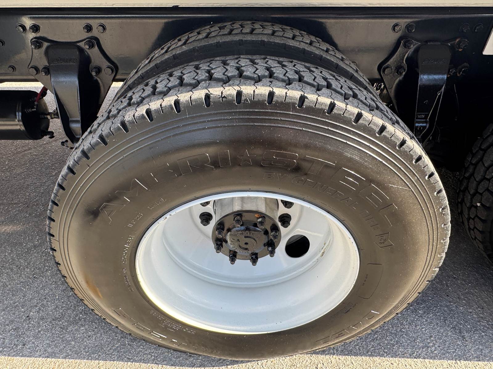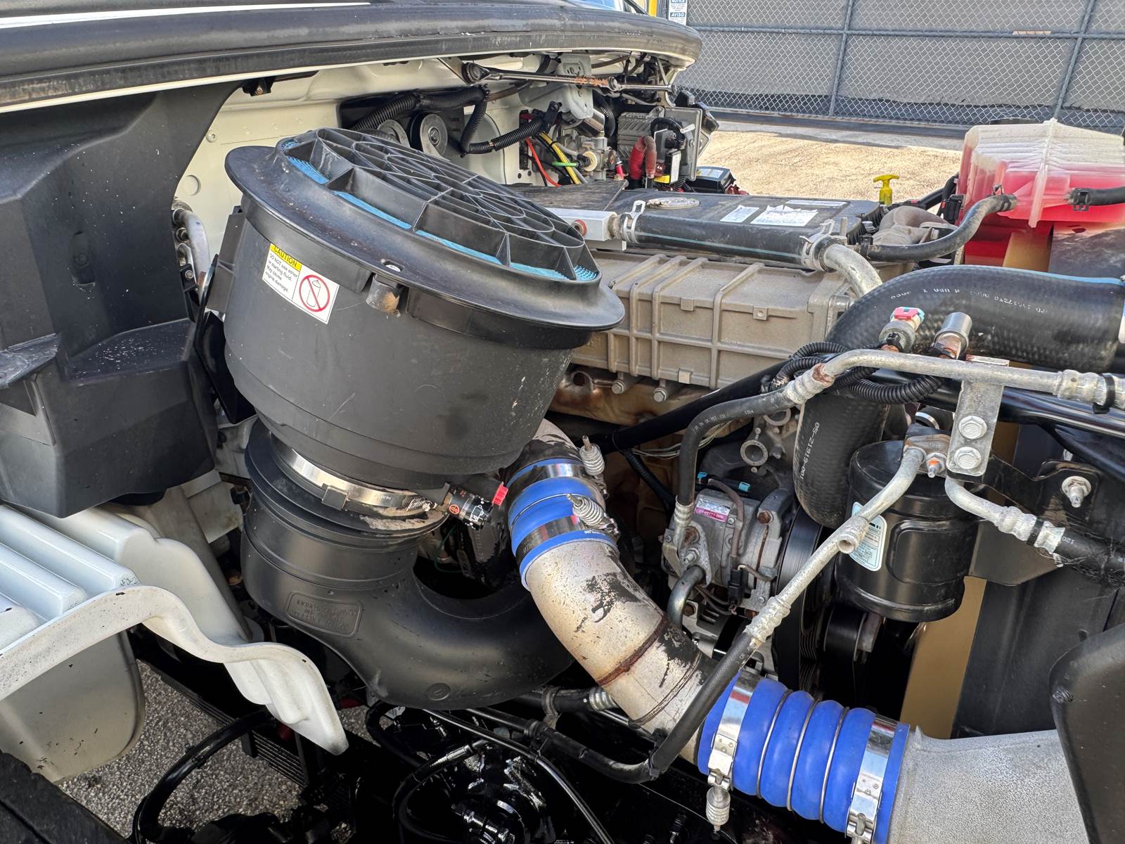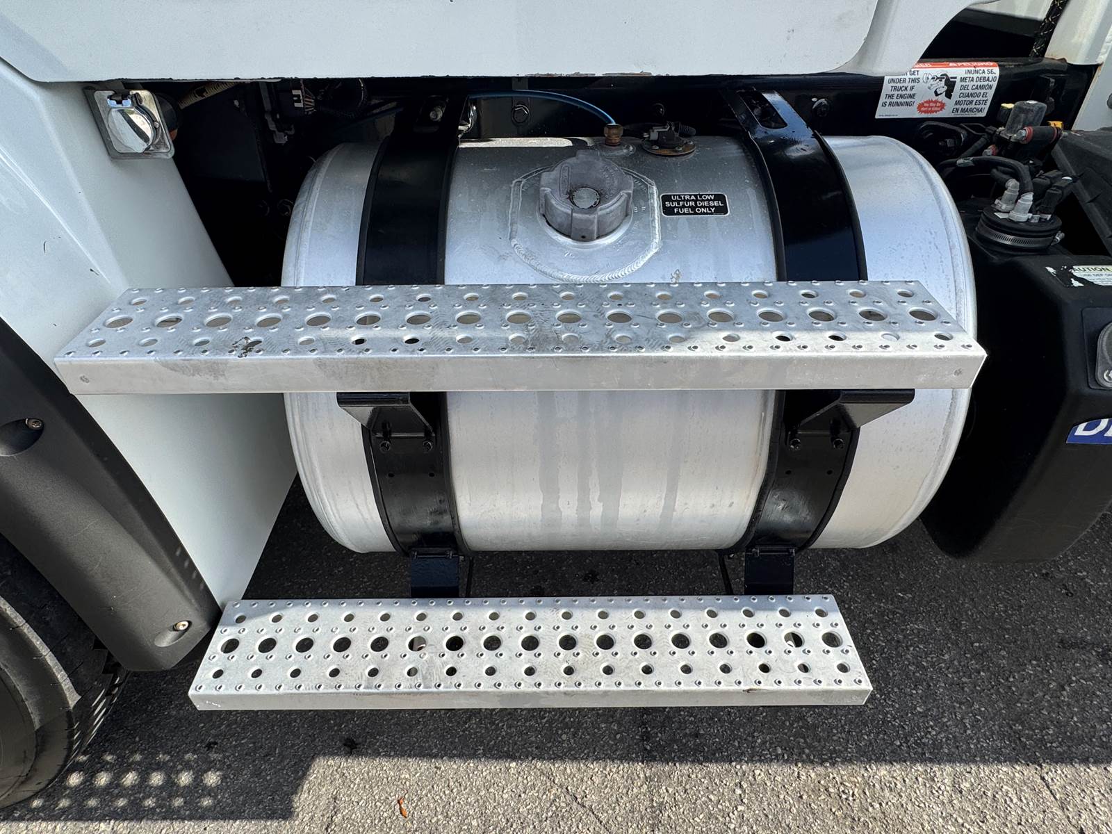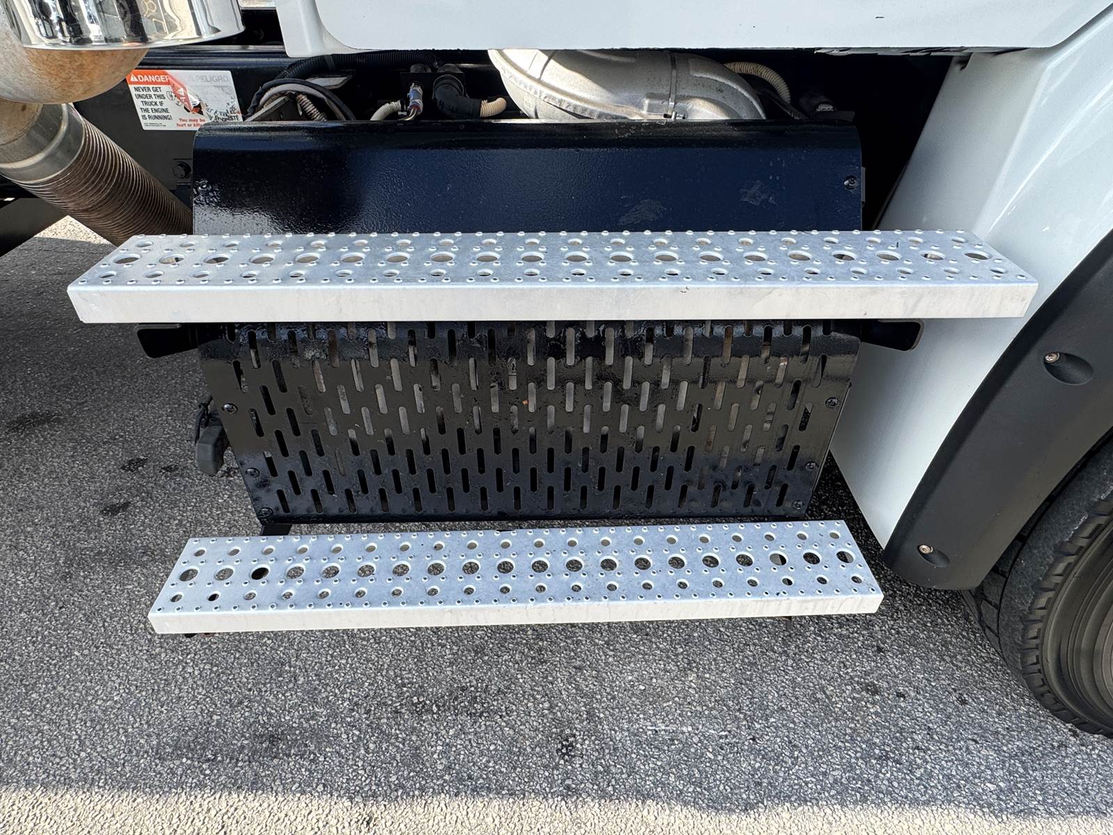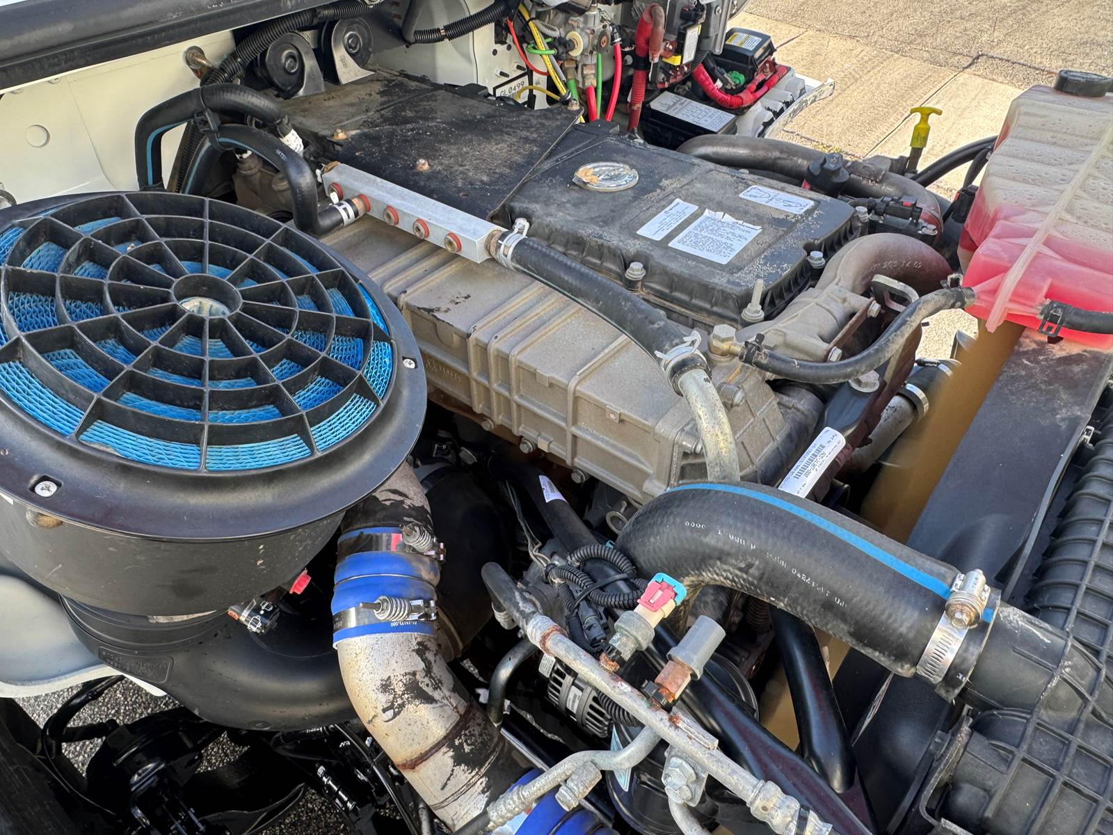 The truck is equipped with automatic hydraulic platform leveling, a backup camera, and approximately 3,185 PTO hours. With only 30,297 miles and a dry weight of approximately 59,760 lbs, this unit is described as a one-owner truck with a clean CARFAX history. The interior features a gray regular cab configuration equipped with air conditioning, cruise control, power windows, and power locks, though it is not equipped with collision mitigation systems.