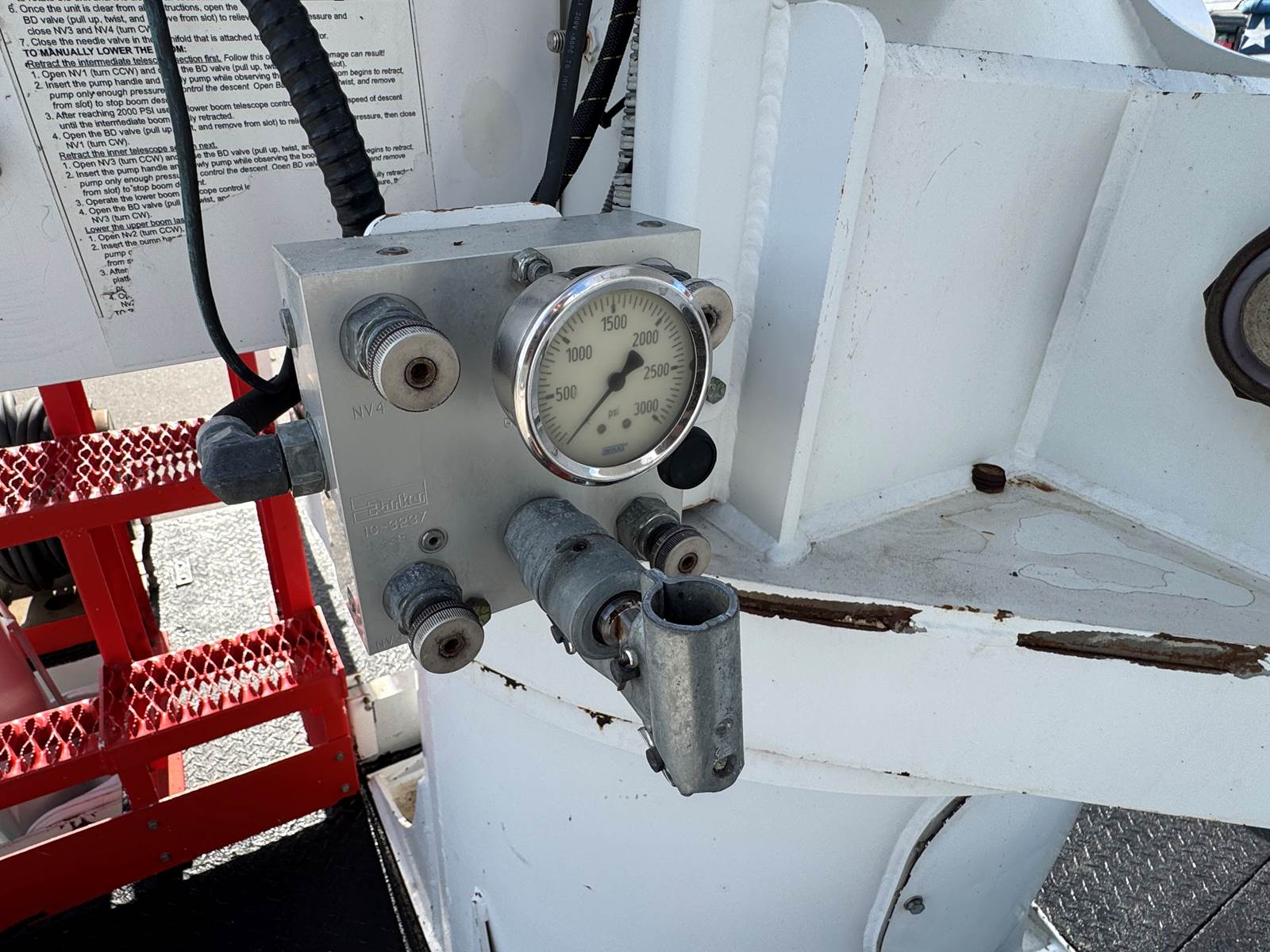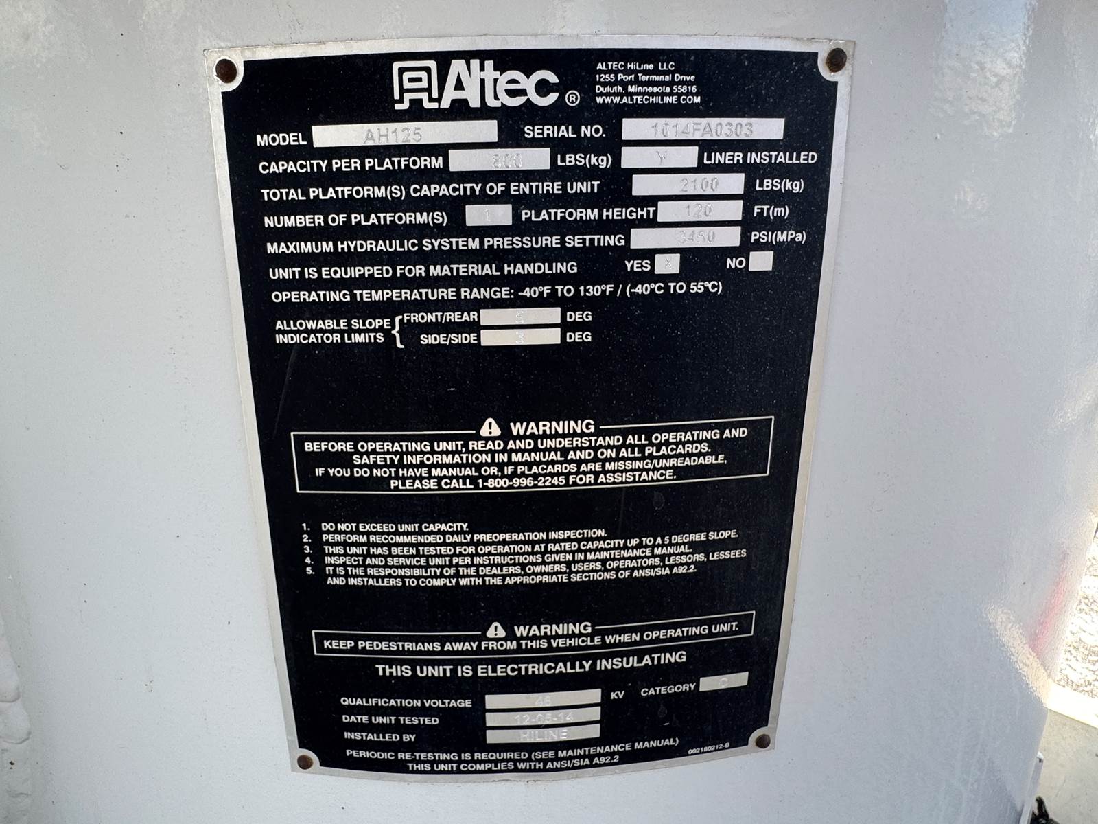 The aerial device is an Altec AH125 (Serial No. 1014FA0303), finished in white and mounted in an end-mount configuration with continuous rotation capability. This articulating and telescopic boom provides an impressive 125-foot working height with approximately 120 feet of side reach and a 50-foot 4-inch platform height. The two-man platform is rated at 800 lbs capacity and includes automatic hydraulic platform leveling for improved operator stability and safety. The boom is insulated to Category C (46 kV) and equipped with four outriggers for stability during operation. The unit also includes a 1,500 lb capacity hydraulic extendible material handling jib, hydraulic tool circuits both at the platform and at the lower controls, and single-handle control system for precise aerial maneuvering.