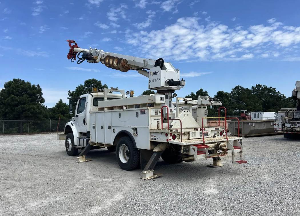 The Altec DM47B features a 47-foot sheave height and 37.3-foot horizontal reach, supported by a three-section hydraulic telescopic boom. Built for precision and power, it includes an 18-inch auger, hydraulic pole grabs, a 2-speed digger drive, and continuous rotation capability. The boom offers Category C (46kV) insulation for safe electrical utility work and includes hydraulic side-load protection, heel winch, and an Altec Opti-View control seat for enhanced visibility and operator control.