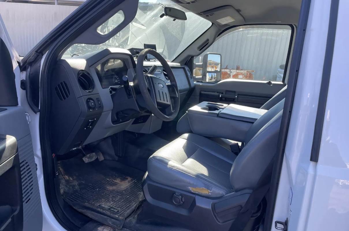 Finished in white, the truck features a white regular cab interior and steel wheels. With a GVWR of 19,500 lbs, a front axle rating of 6,500 lbs, a rear axle rating of 13,660 lbs, a 165-inch wheelbase, and a 40-gallon diesel fuel tank, this F-550 is well suited for demanding aerial and maintenance work.
