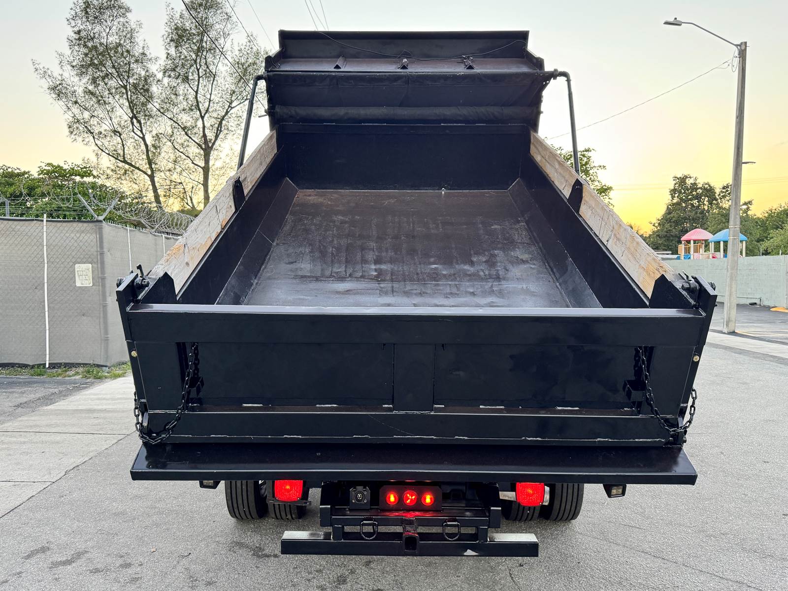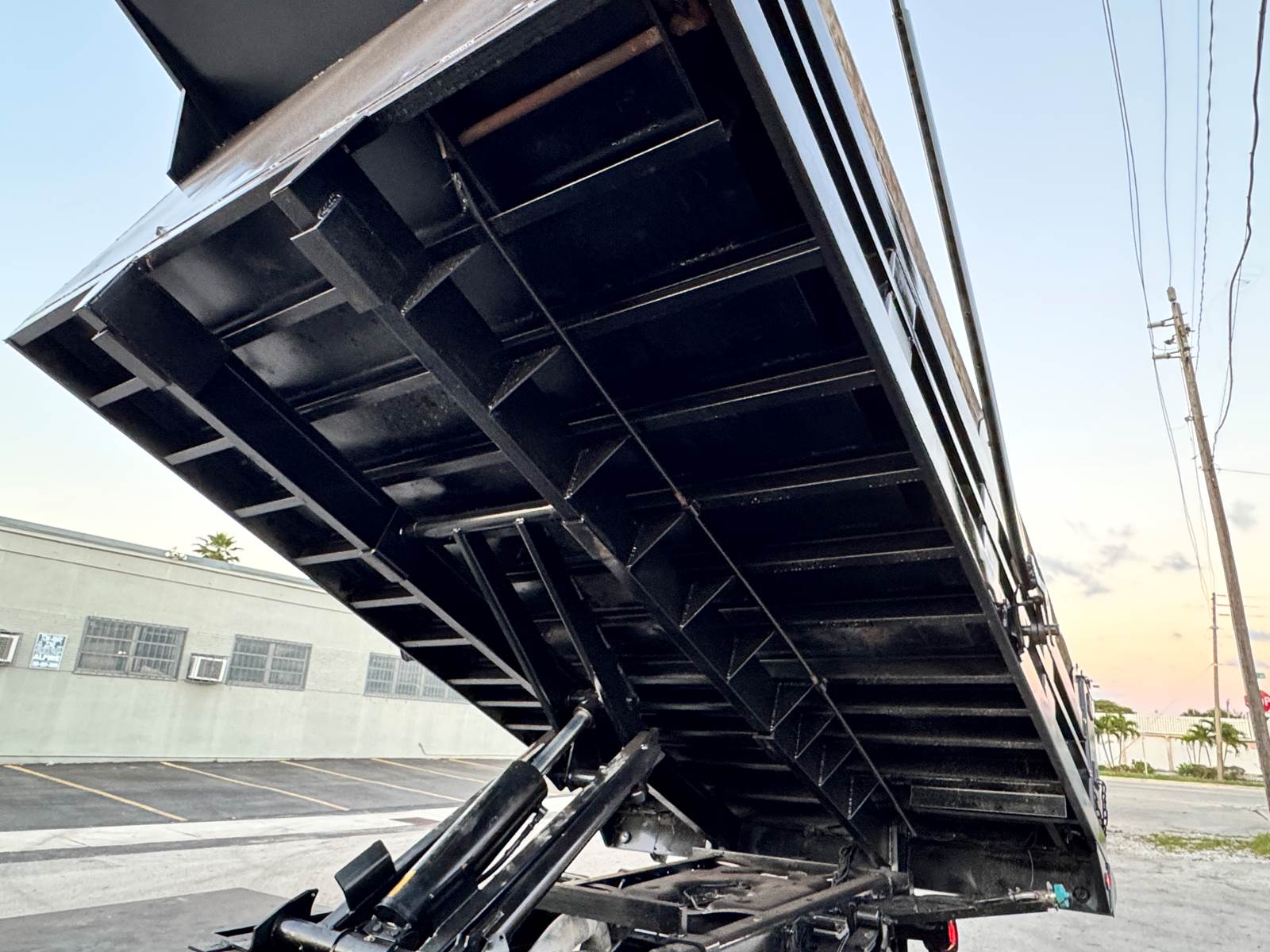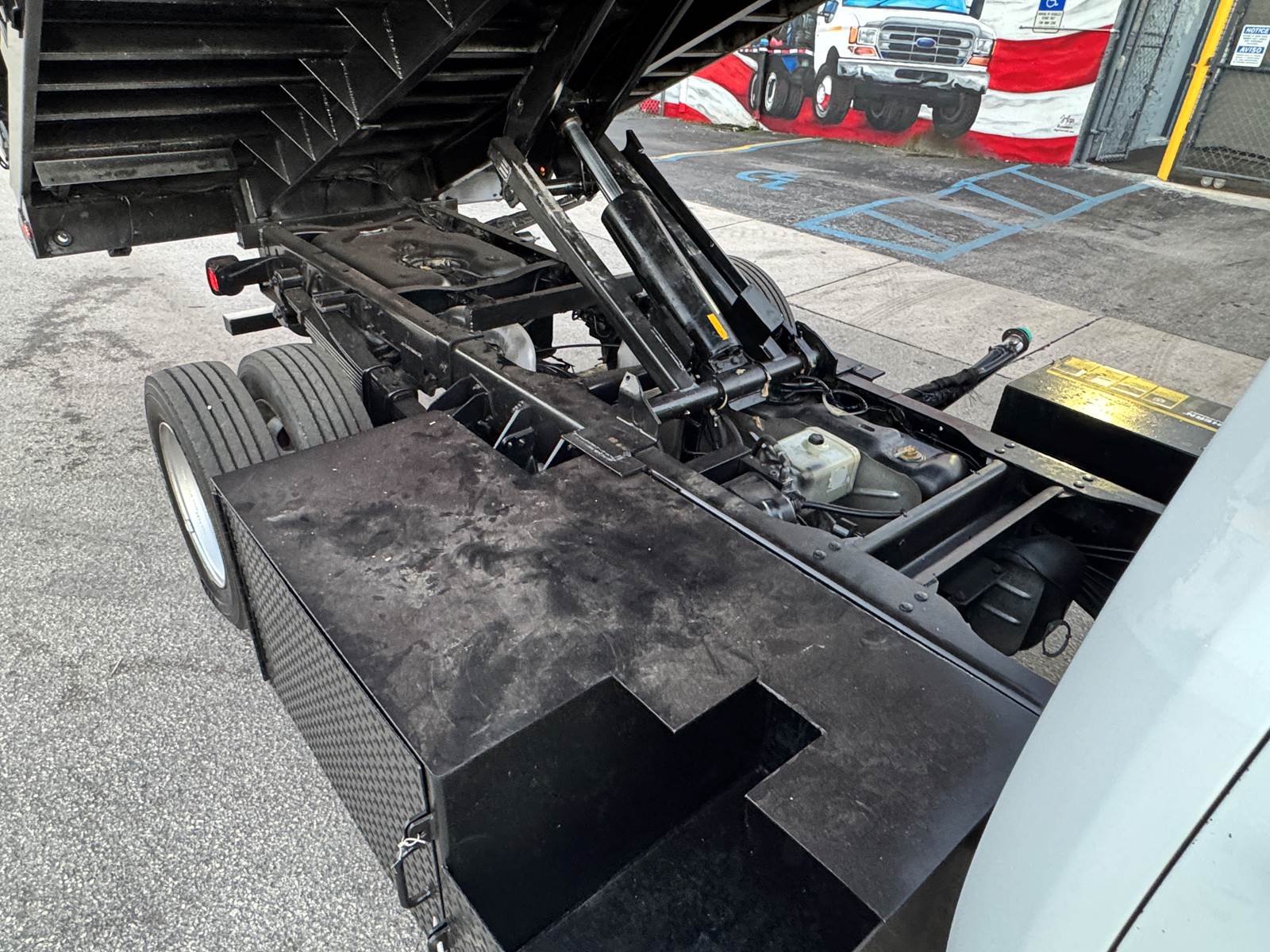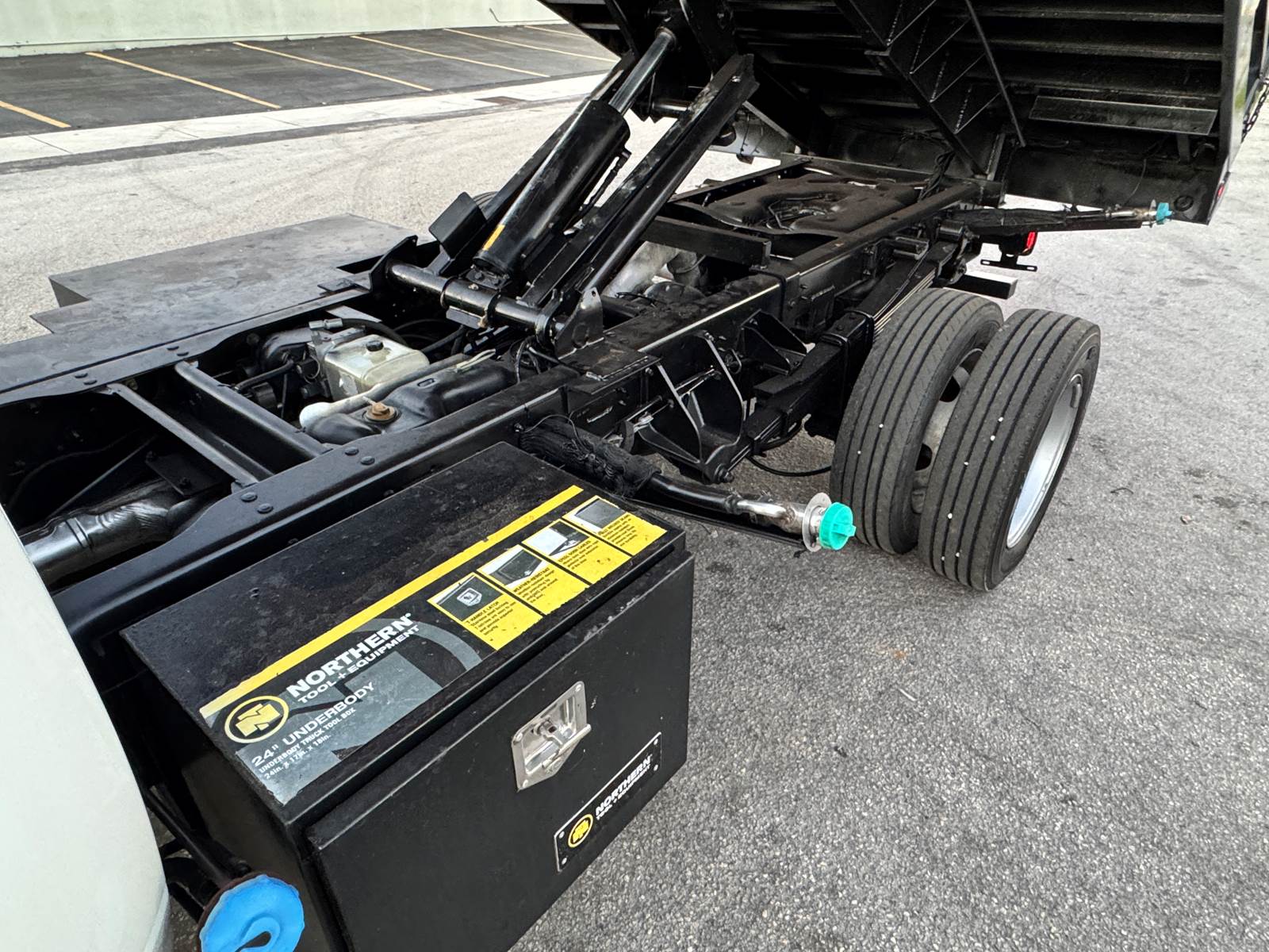 The dump body is manufactured by Marquez Brothers and measures approximately 12 feet in length, 96 inches in width, and 24 inches in height. It features a flat-bottom steel construction, electric-over-hydraulic hoist system, manual gate release, and integrated underbody toolboxes for added storage and functionality. The exterior is finished in white, matching the white Crew Cab interior, and rides on steel wheels.