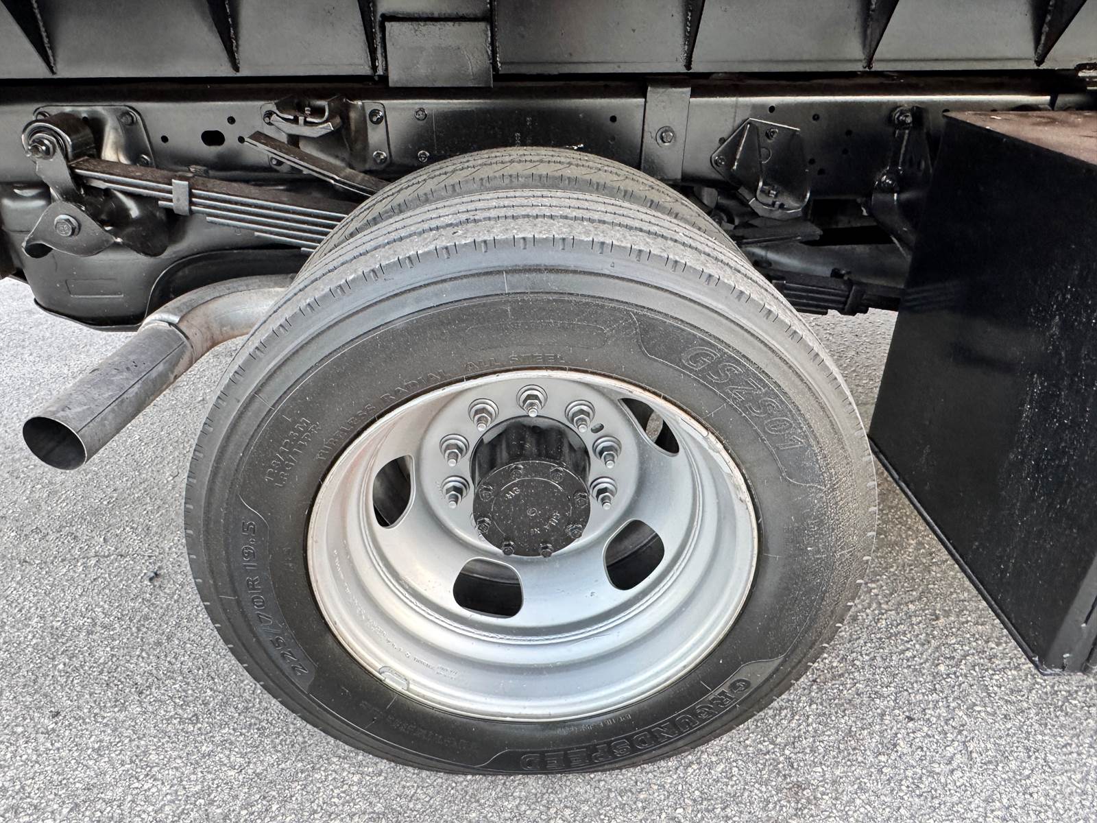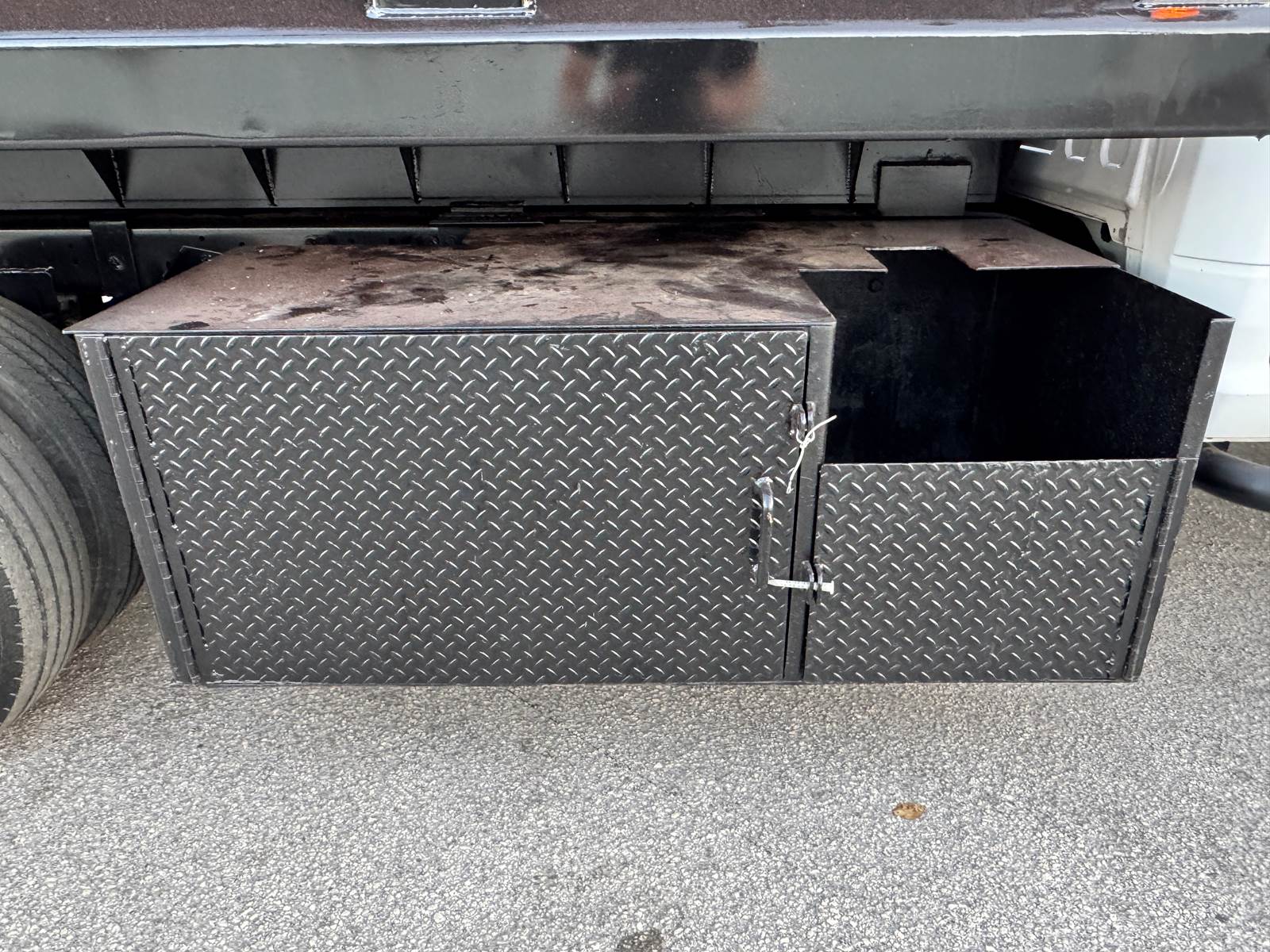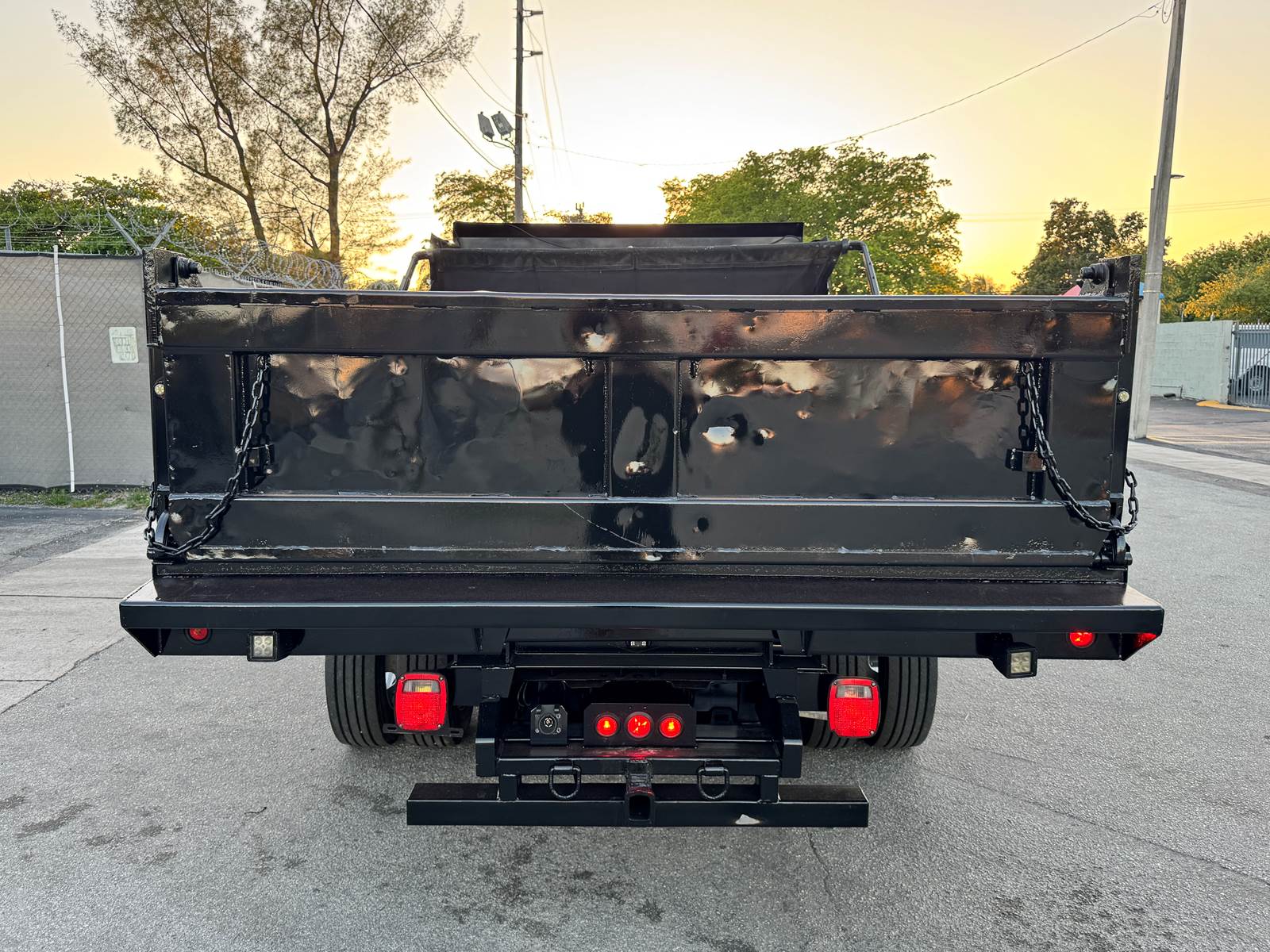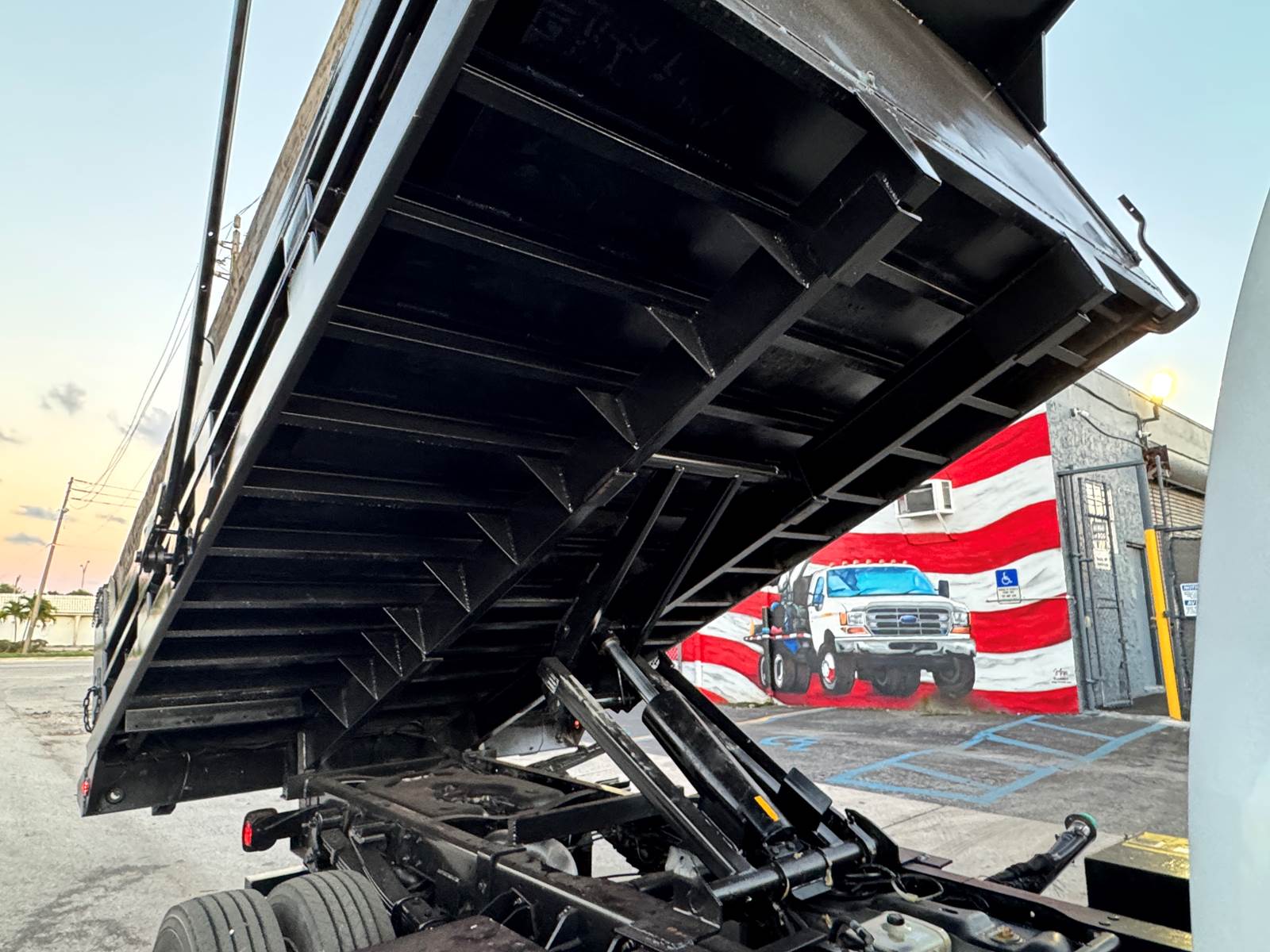 The dump body is manufactured by Marquez Brothers and measures approximately 12 feet in length, 96 inches in width, and 24 inches in height. It features a flat-bottom steel construction, electric-over-hydraulic hoist system, manual gate release, and integrated underbody toolboxes for added storage and functionality. The exterior is finished in white, matching the white Crew Cab interior, and rides on steel wheels.