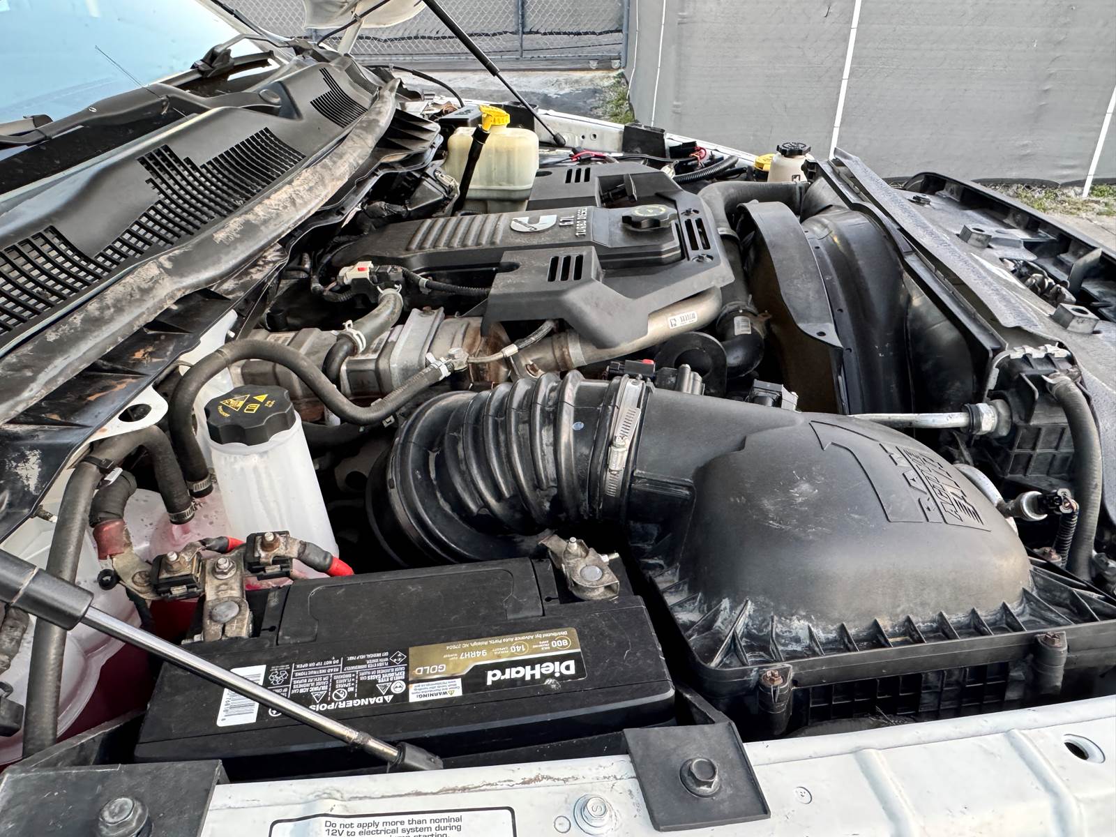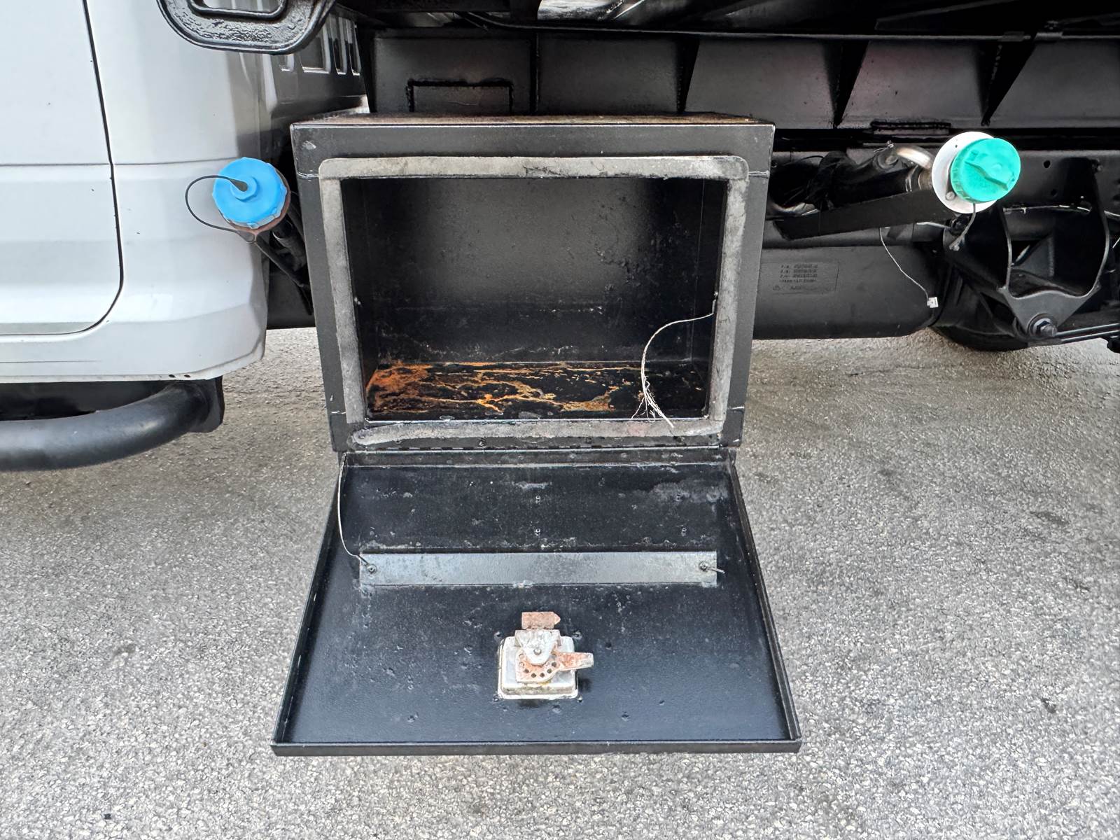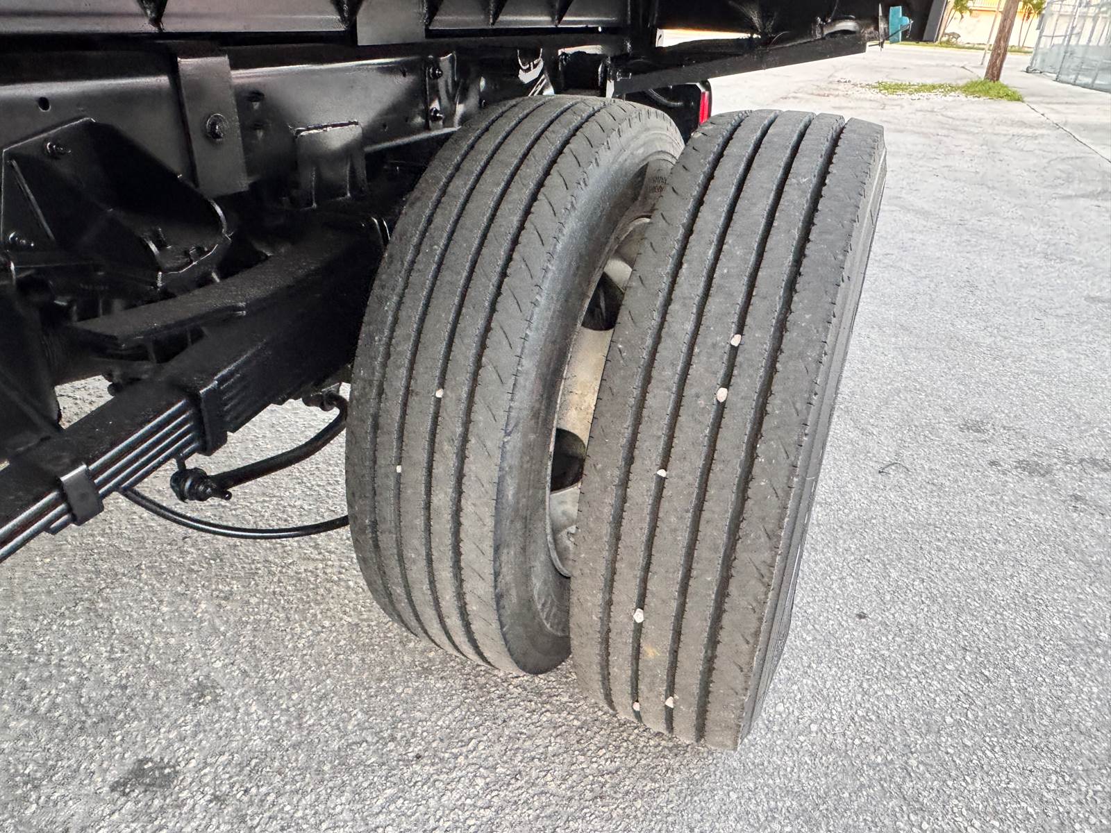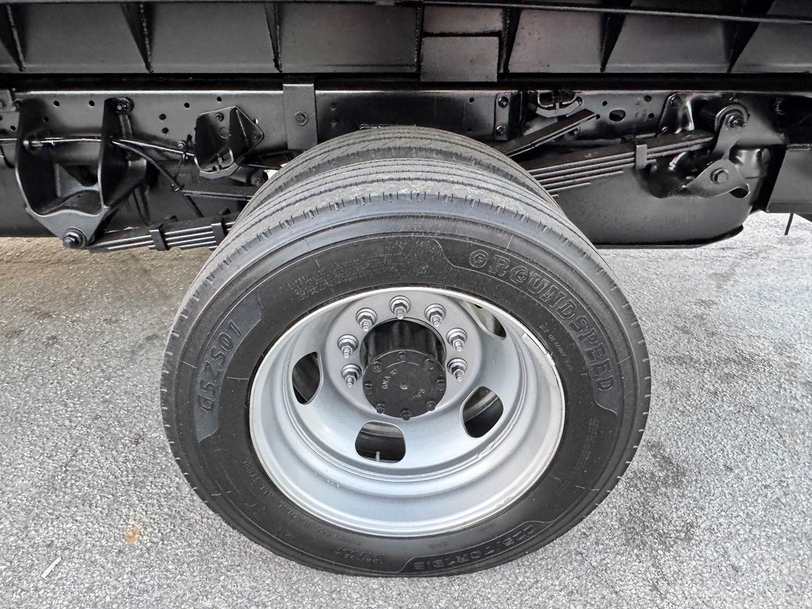 The dump body is manufactured by Marquez Brothers and measures approximately 12 feet in length, 96 inches in width, and 24 inches in height. It features a flat-bottom steel construction, electric-over-hydraulic hoist system, manual gate release, and integrated underbody toolboxes for added storage and functionality. The exterior is finished in white, matching the white Crew Cab interior, and rides on steel wheels.
