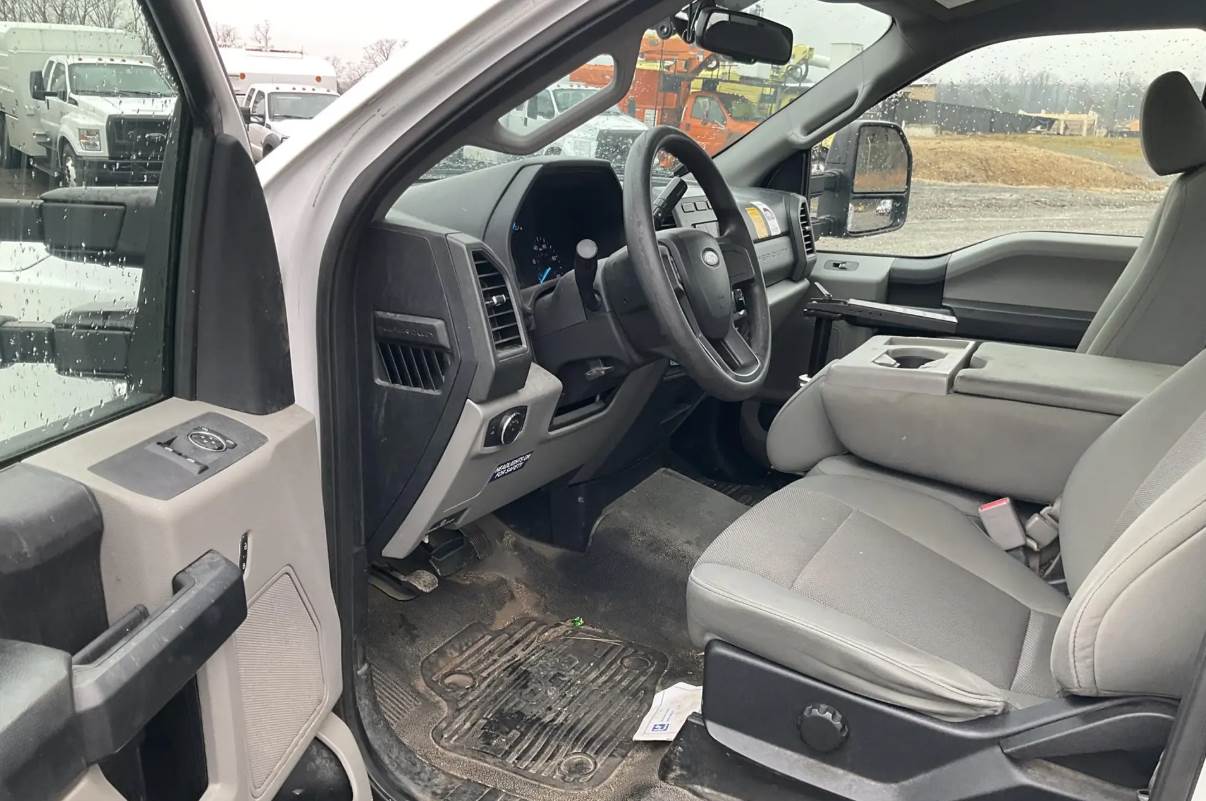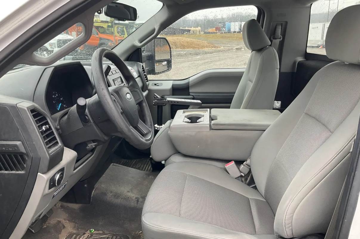 Finished in white with a gray regular cab interior, the truck is equipped with air conditioning, cruise control, power windows, and power door locks, providing comfort and convenience for daily operation. Additional equipment includes a towing package, rearview camera, power equipment group, platform running boards, and rear stability bar, enhancing both functionality and drivability.