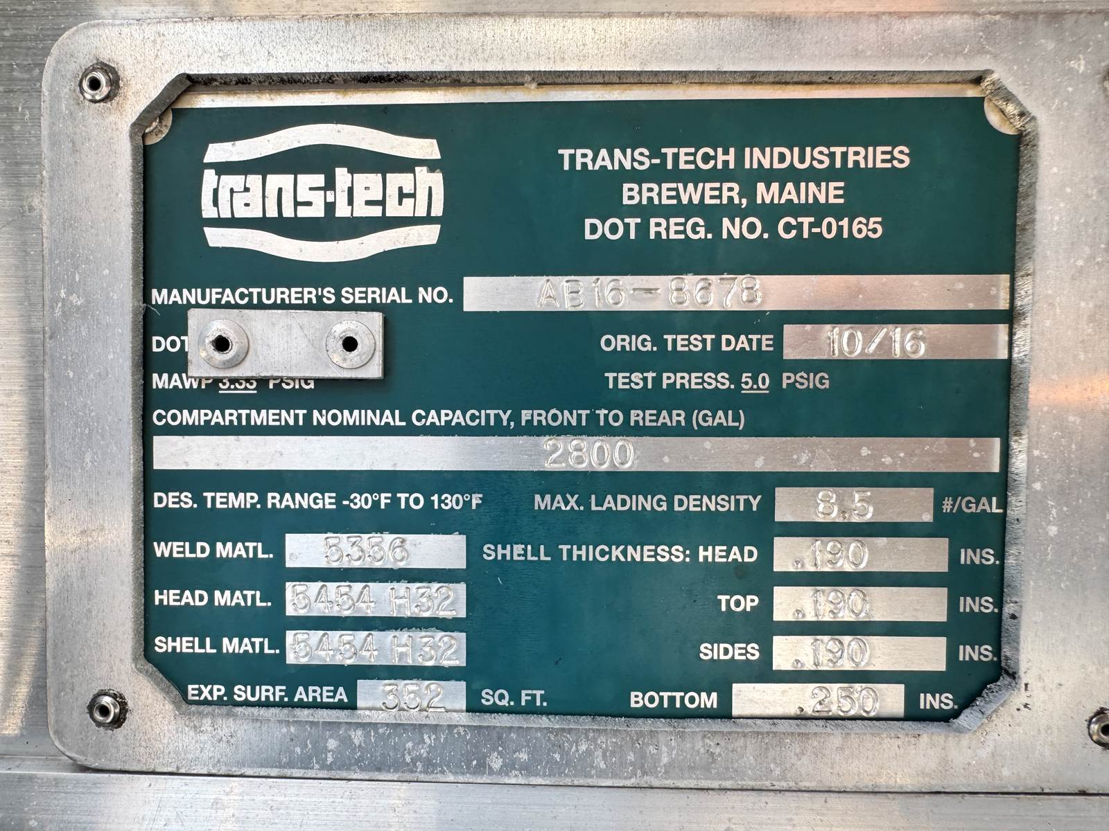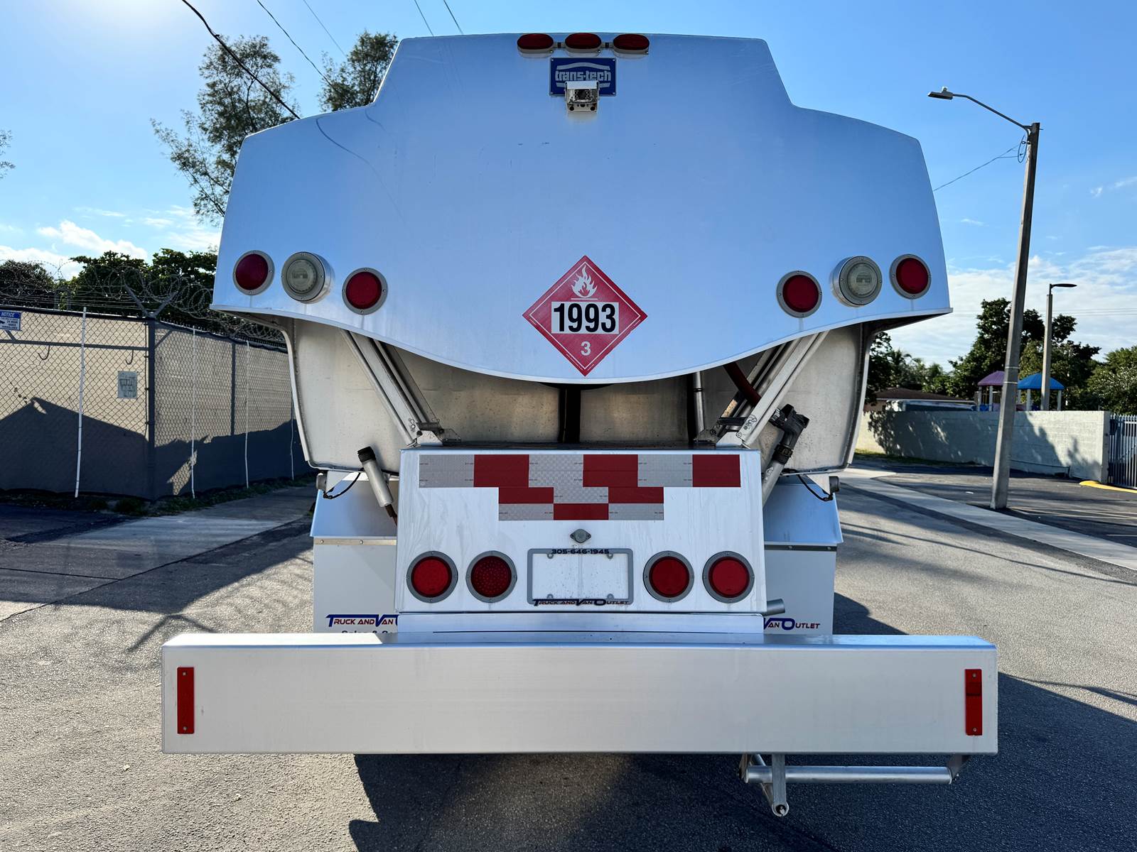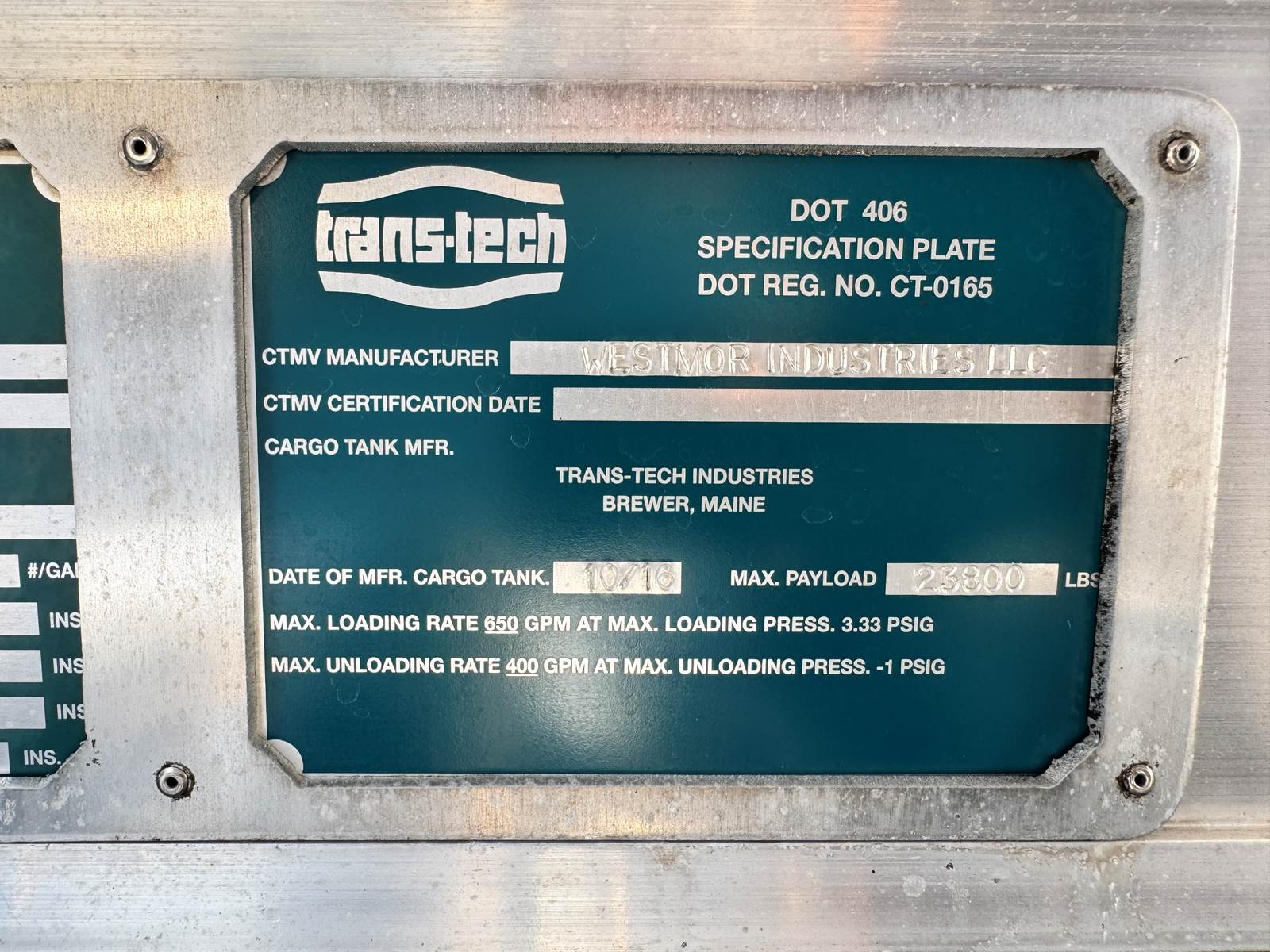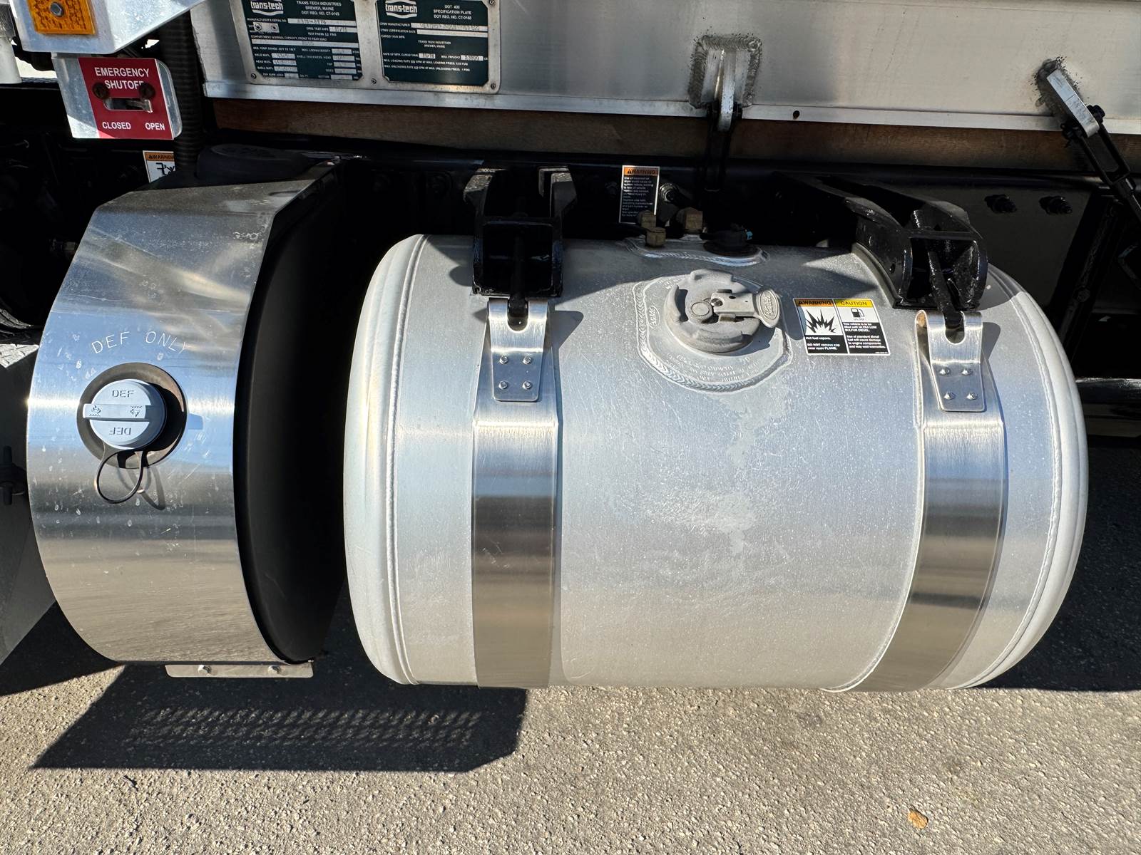 The truck is fitted with a Trans-Tech AB16-8678 aluminum tank body rated at 2,800 gallons and constructed to DOT 406 specifications. The single-compartment design is equipped with an M7 meter system, SCUL flow nozzle, and integrated liquid control system for precise fueling and fluid delivery. The tank features top access, a 19.2-inch steel frame, and air spring suspension for a smooth, stable ride even when fully loaded.