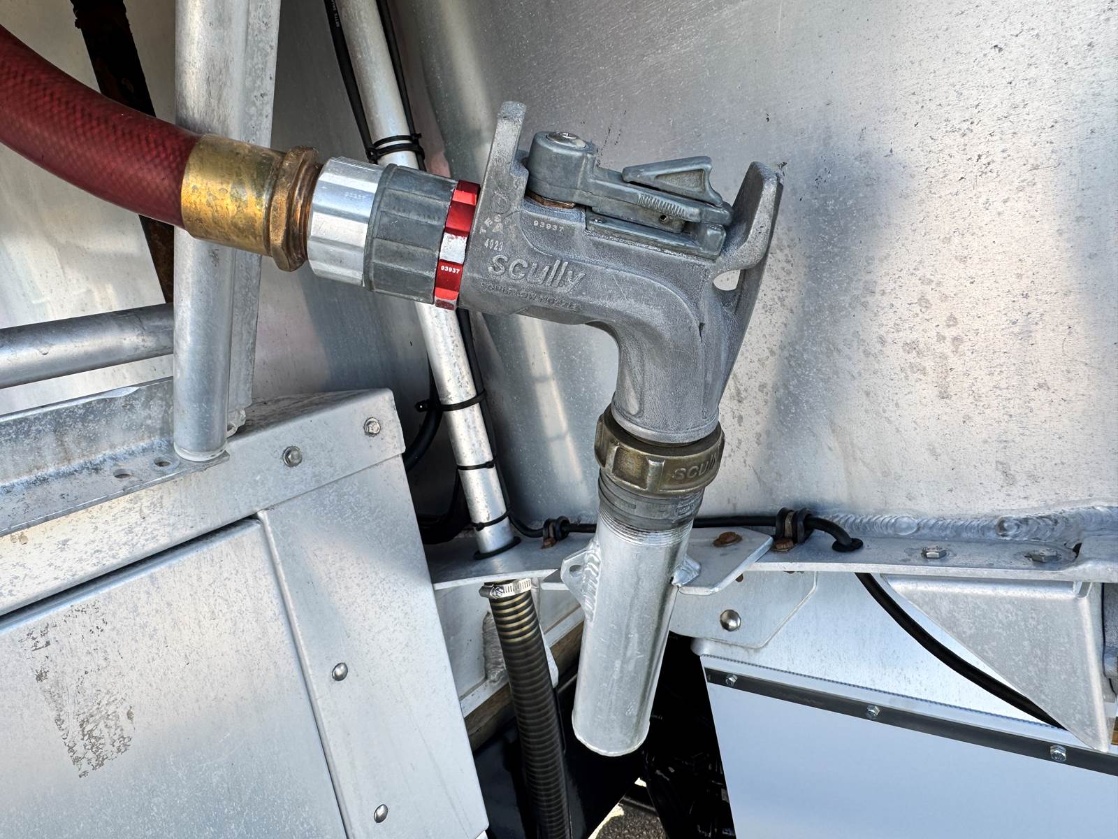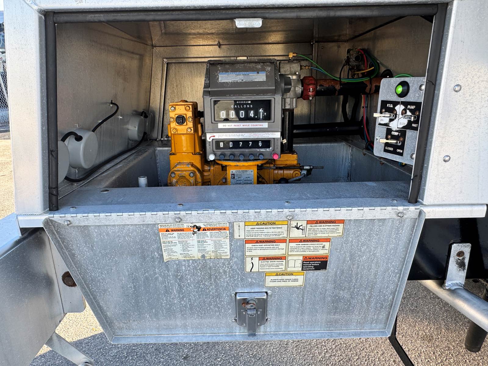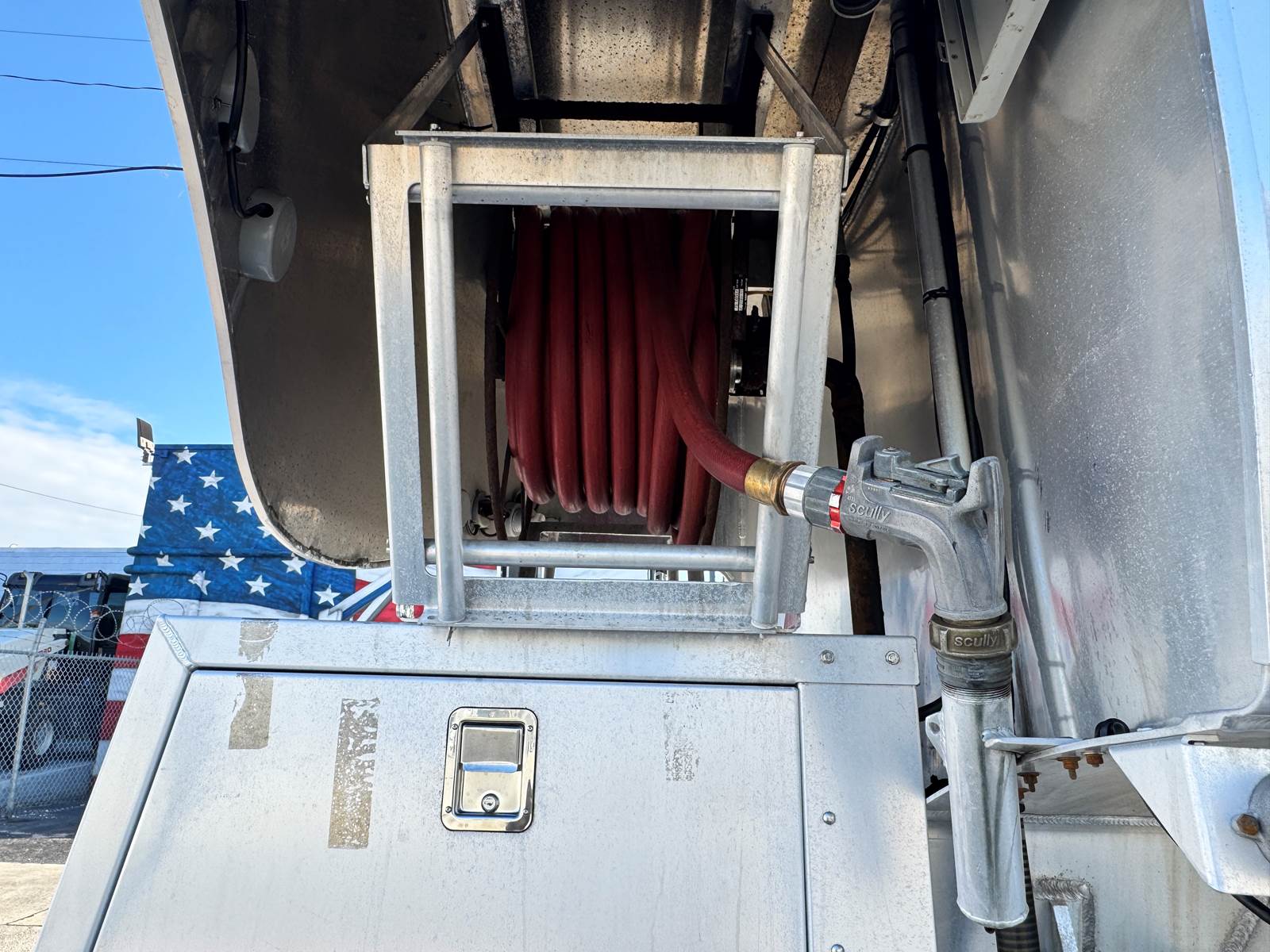 The truck is fitted with a Trans-Tech AB16-8678 aluminum tank body rated at 2,800 gallons and constructed to DOT 406 specifications. The single-compartment design is equipped with an M7 meter system, SCUL flow nozzle, and integrated liquid control system for precise fueling and fluid delivery. The tank features top access, a 19.2-inch steel frame, and air spring suspension for a smooth, stable ride even when fully loaded.