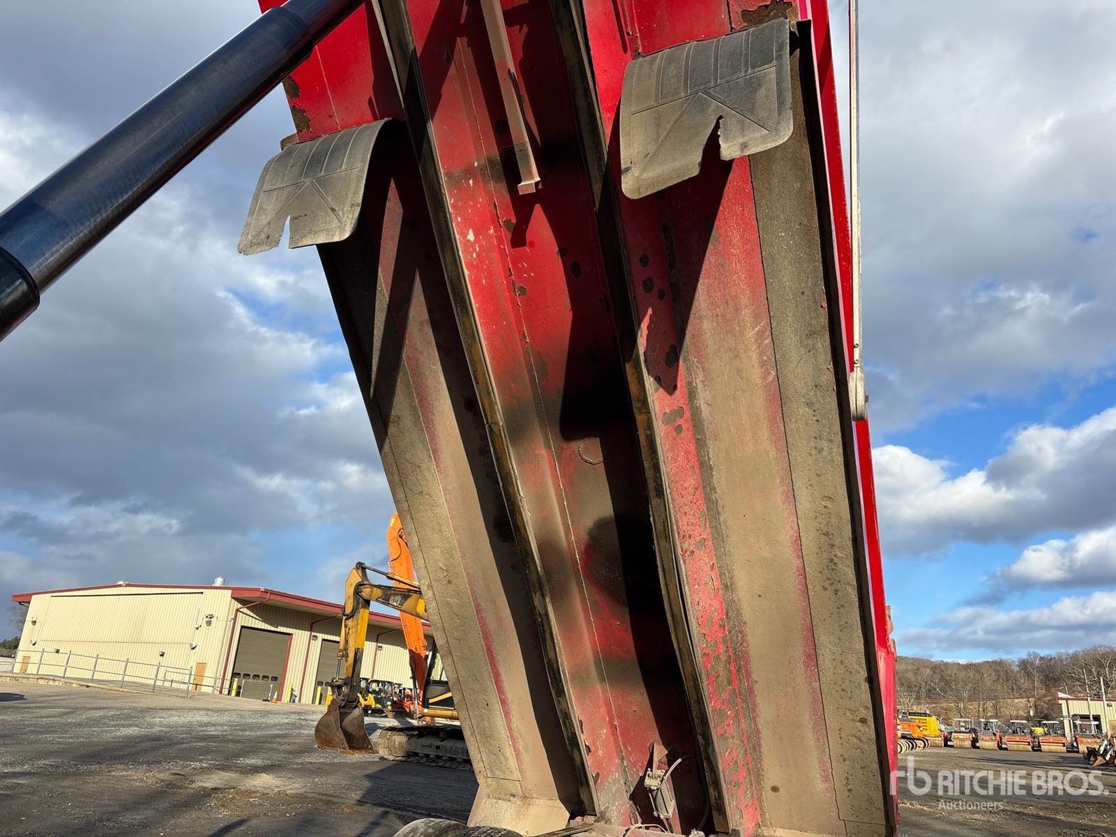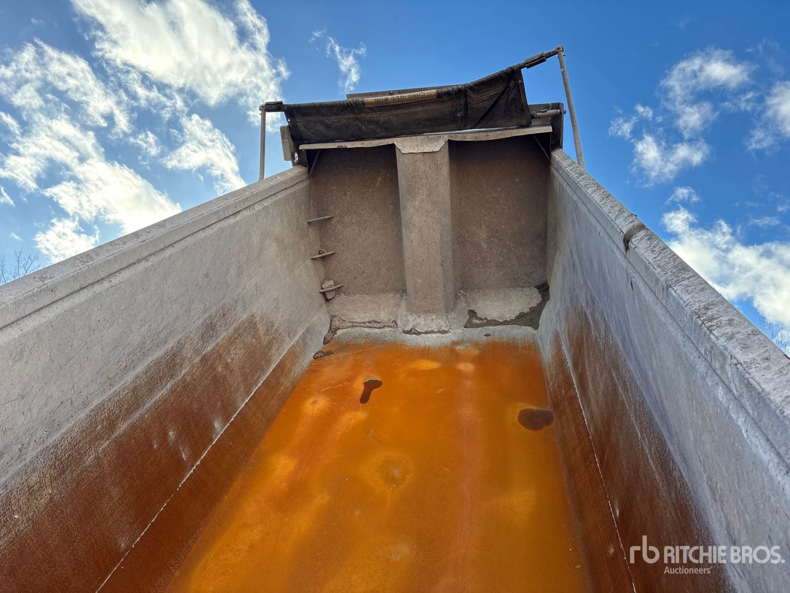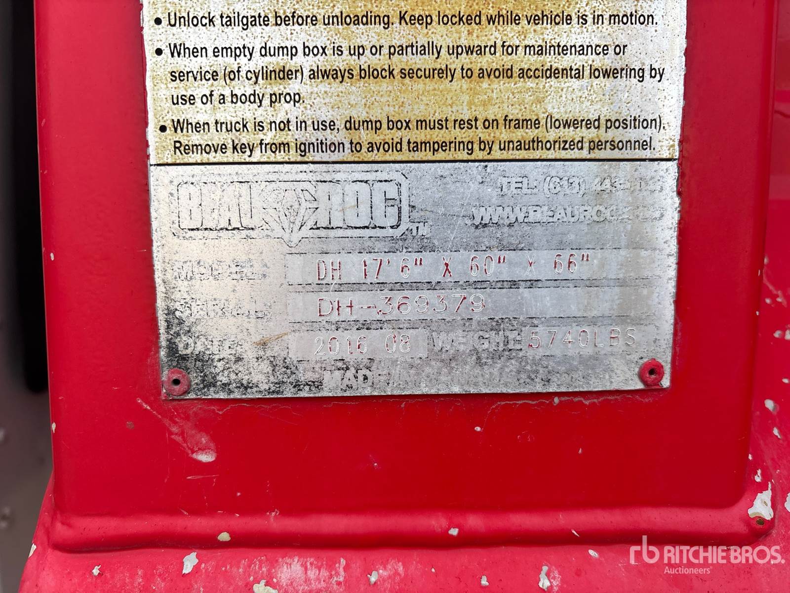 The dump body is manufactured by Beau-Roc and configured as a half-round steel body measuring approximately 17 feet 6 inches in length, 60 inches in width, and 66 inches in height, with an estimated 30-yard capacity. It is equipped with an electric tarp system, air-operated controls, and a rock-body configuration designed for abrasive materials. The truck features a double-frame chassis, walking beam suspension with Chalmers rubber over walking beam system, and a steerable pusher axle for enhanced load distribution and maneuverability.