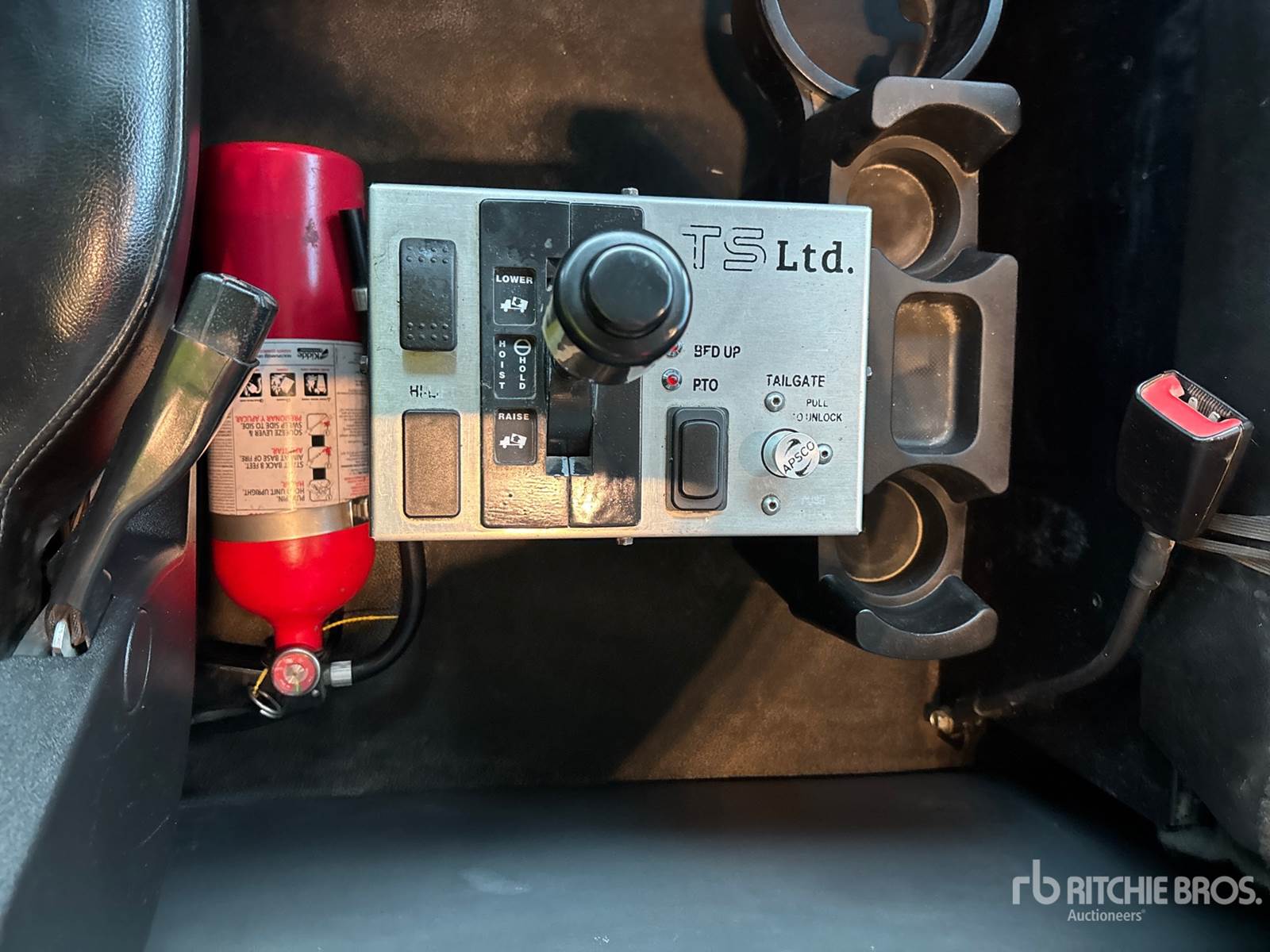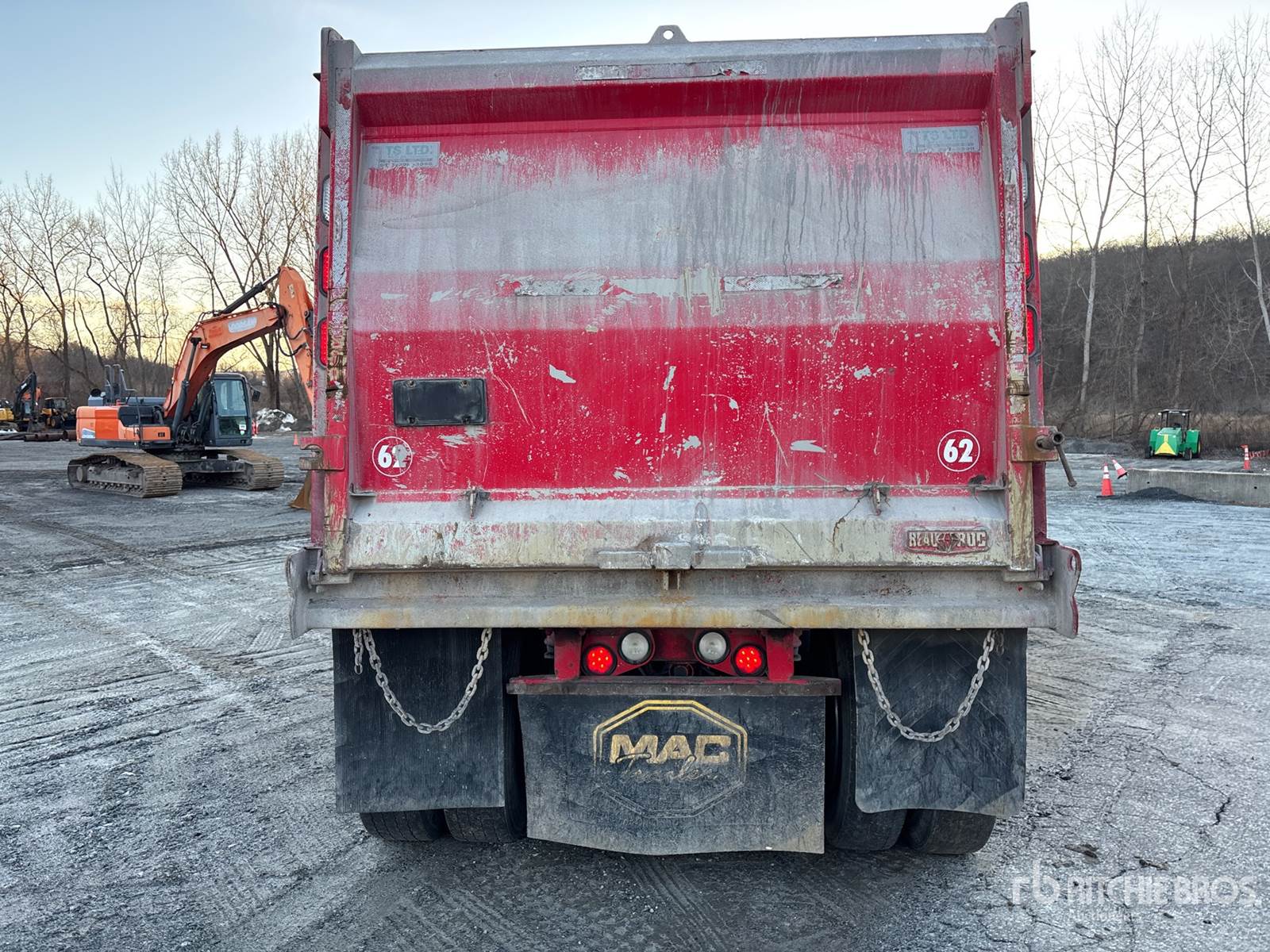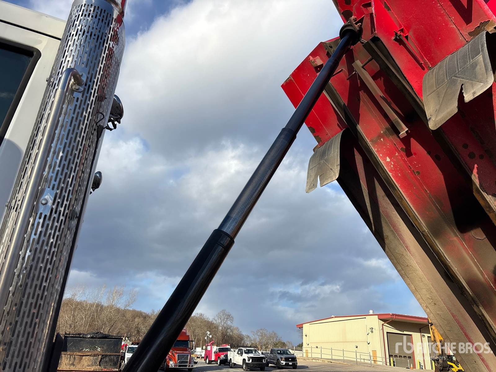 The dump body is manufactured by Beau-Roc and configured as a half-round steel body measuring approximately 17 feet 6 inches in length, 60 inches in width, and 66 inches in height, with an estimated 30-yard capacity. It is equipped with an electric tarp system, air-operated controls, and a rock-body configuration designed for abrasive materials. The truck features a double-frame chassis, walking beam suspension with Chalmers rubber over walking beam system, and a steerable pusher axle for enhanced load distribution and maneuverability.