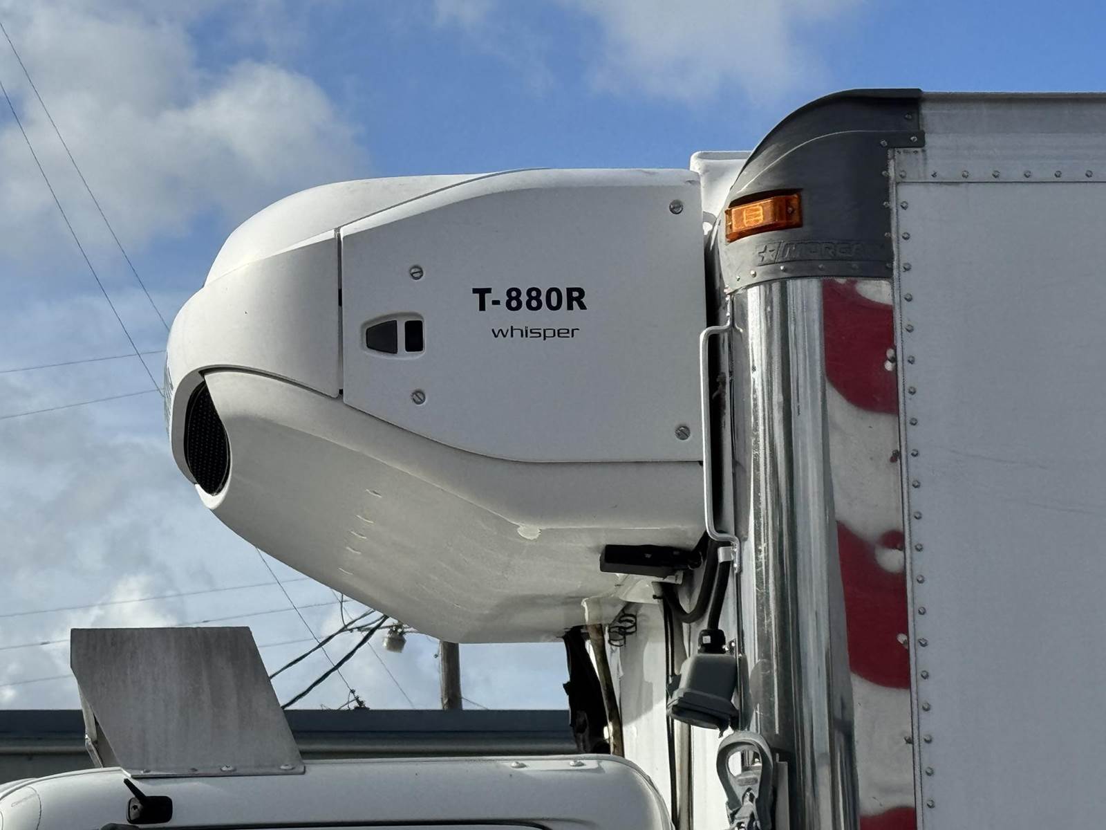 The truck features a 24-foot Morgan insulated body with dimensions of approximately 24' long x 96" wide x 97" high. The cargo area includes an anti-skid aluminum floor, a roll-up rear door, and a Thermo King T-880R standalone reefer unit with 9,406 hours and electric standby capability for flexible operation in docked conditions.