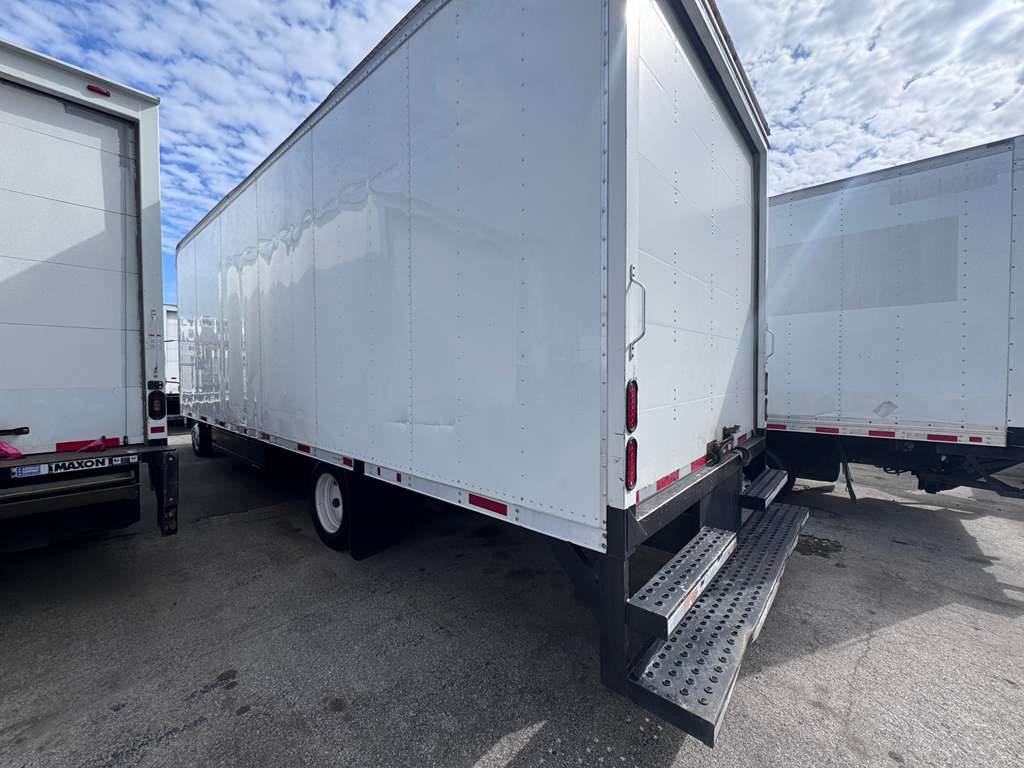 The dry box body is manufactured by AC Body Company and measures 24 feet in length with a 102-inch width and 96-inch interior height. It is constructed with aluminum materials and fitted with a roll-up rear door and wood flooring, providing durability and practicality for freight, delivery, and logistics applications. The exterior is finished in white, while the cab offers a gray regular interior with steel wheels, A/C, cruise control, power windows, and power locks.