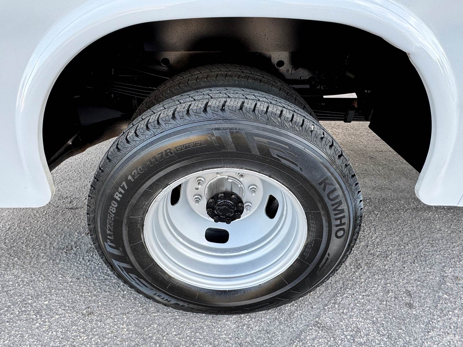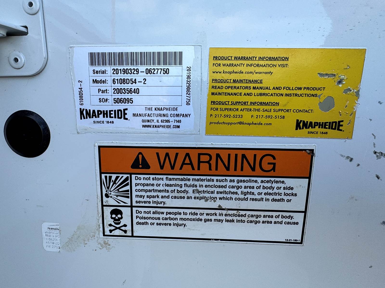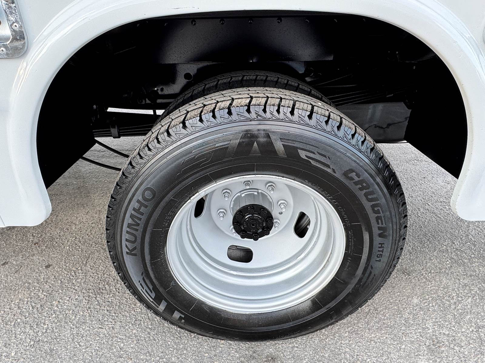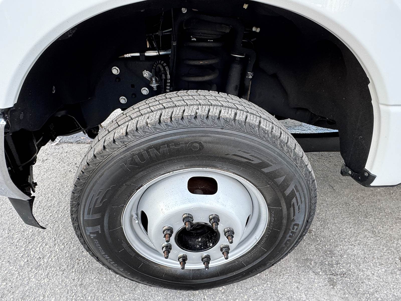 Fitted with a 9-foot Knapheide 6108D54-2 utility body, the truck features multiple lockable compartments for secure tool storage and an open bed design ideal for equipment and parts transport. The steel construction and integrated ladder rack provide durability and utility for daily heavy-duty operations. A spring hydraulic single rear suspension setup enhances load stability and comfort under weight.