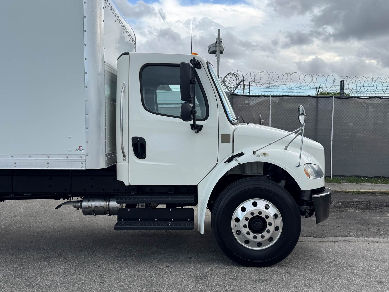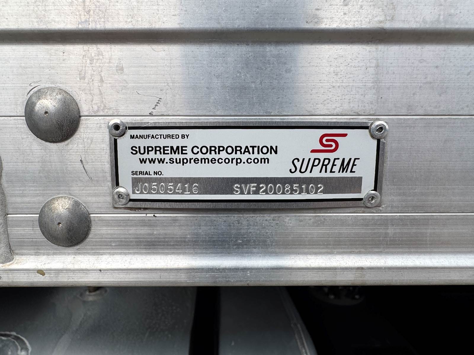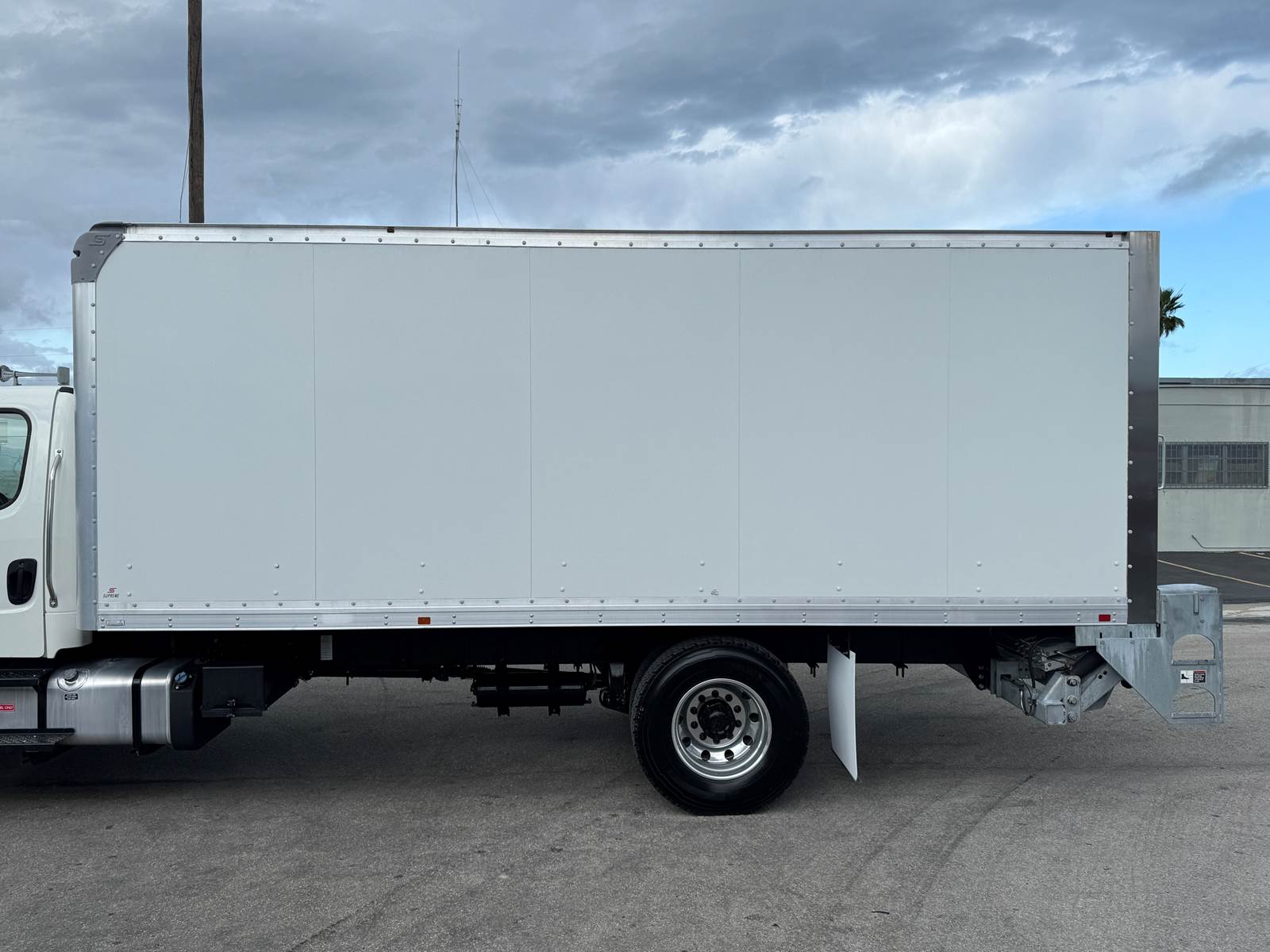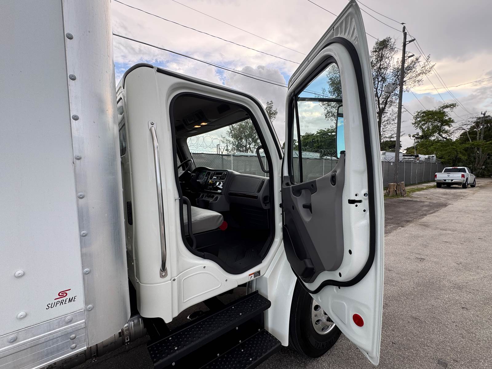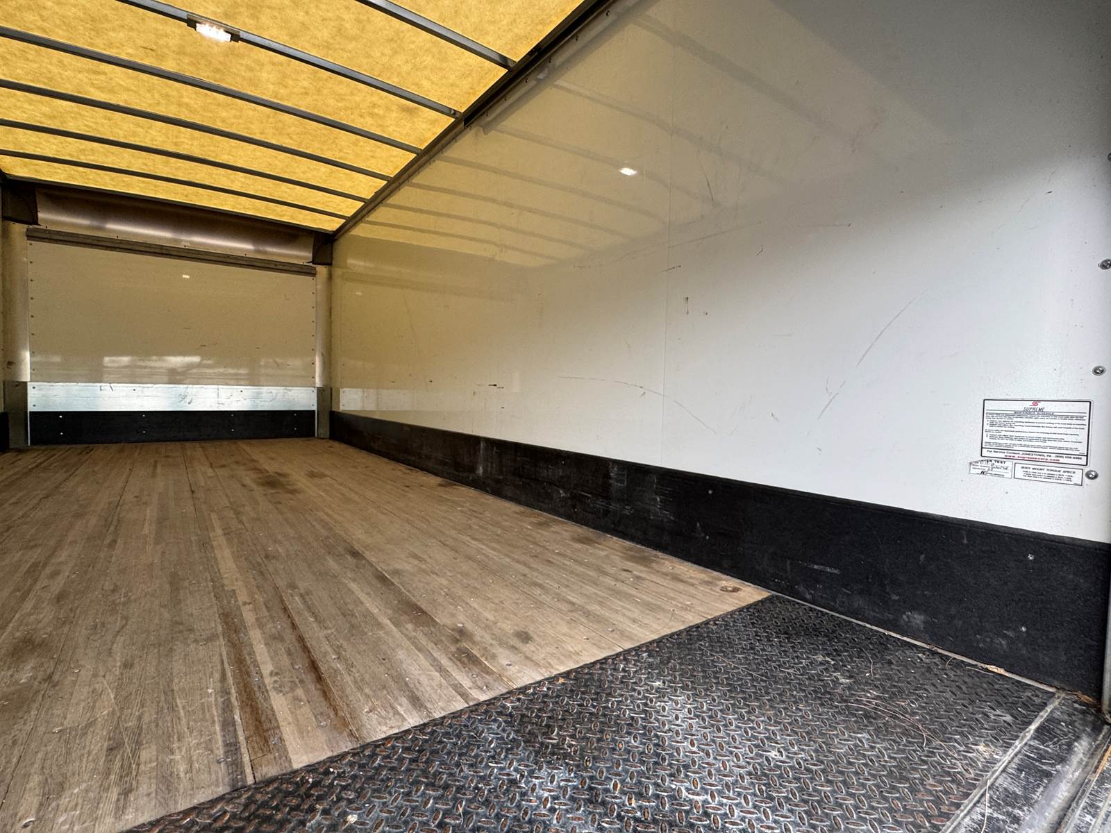 The dry box body is manufactured by Supreme (Model SVF20085102) and measures 20 feet in length, 102 inches in width, and 85 inches in interior height. The cargo area features a wood floor, Kemlite lining, and a translucent roof for added interior lighting. It is not insulated and does not include E-tracks. The rear door is a roll-up style.