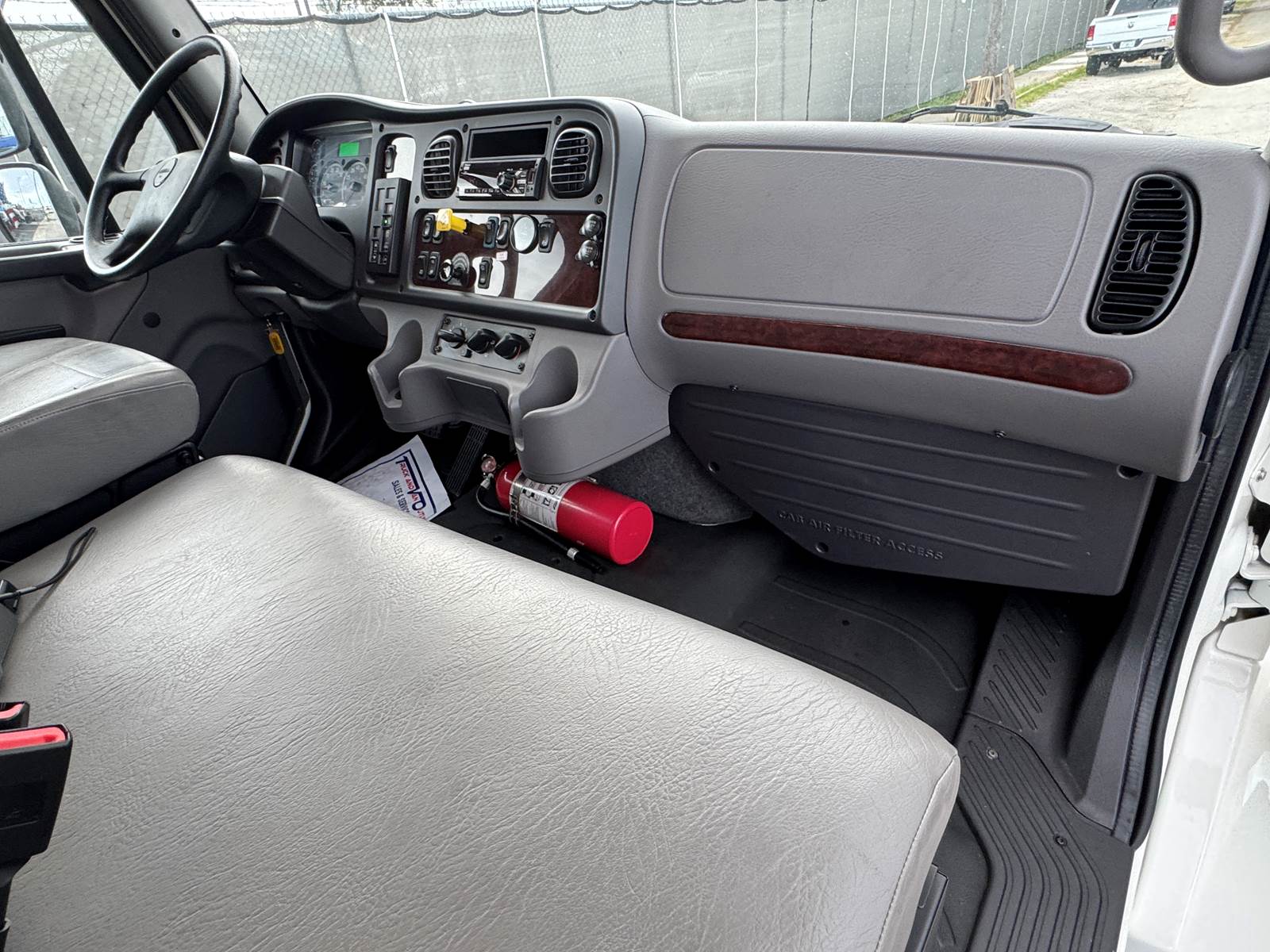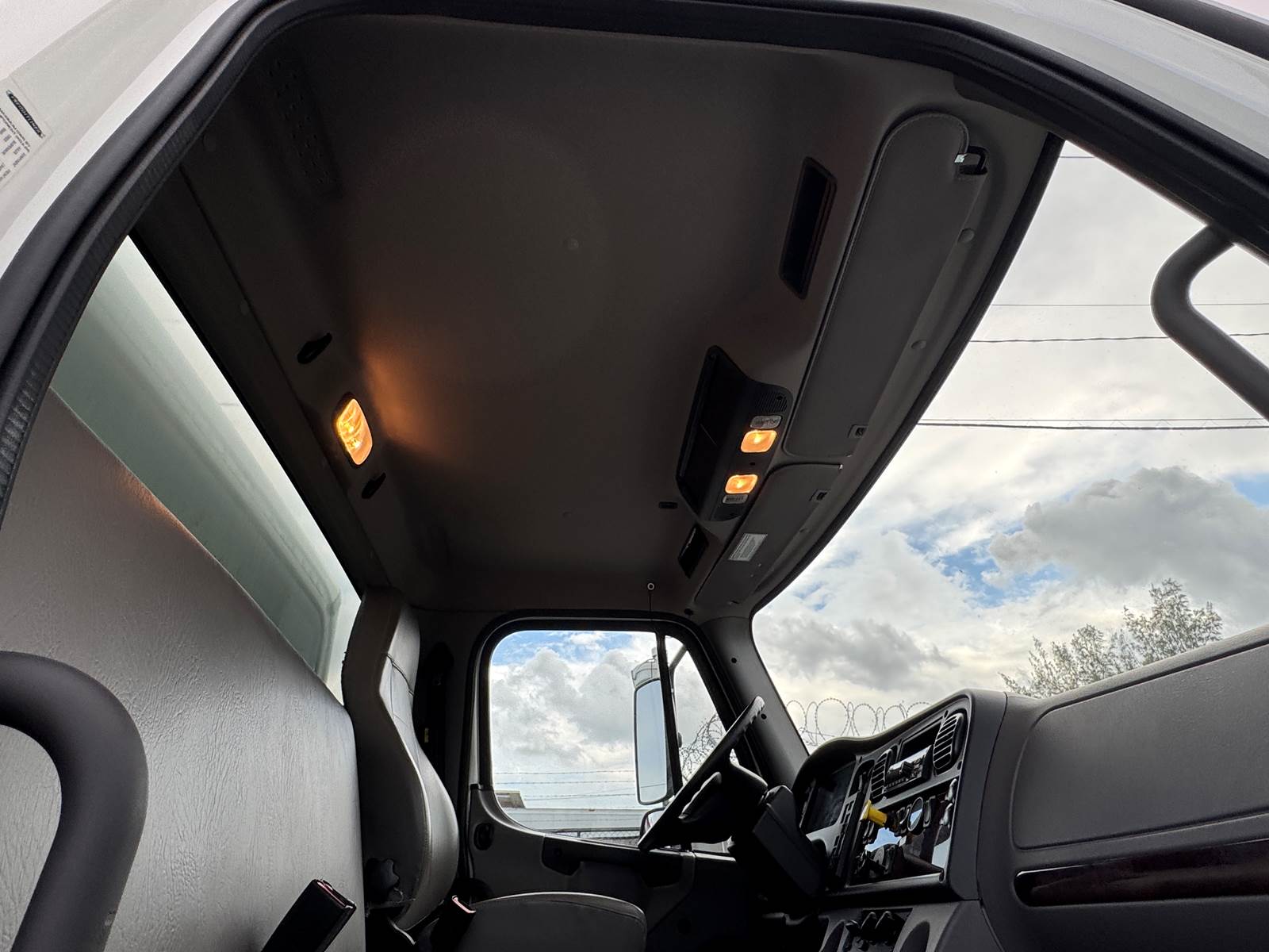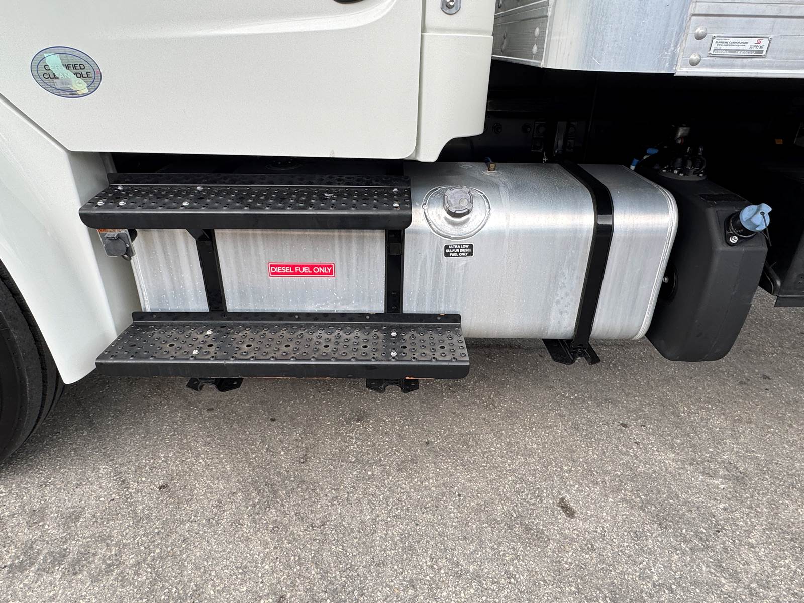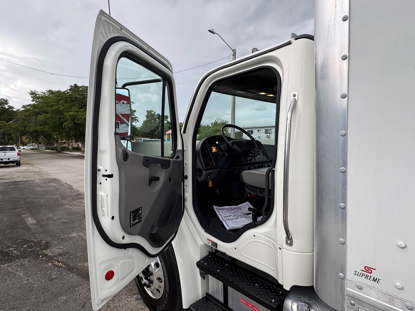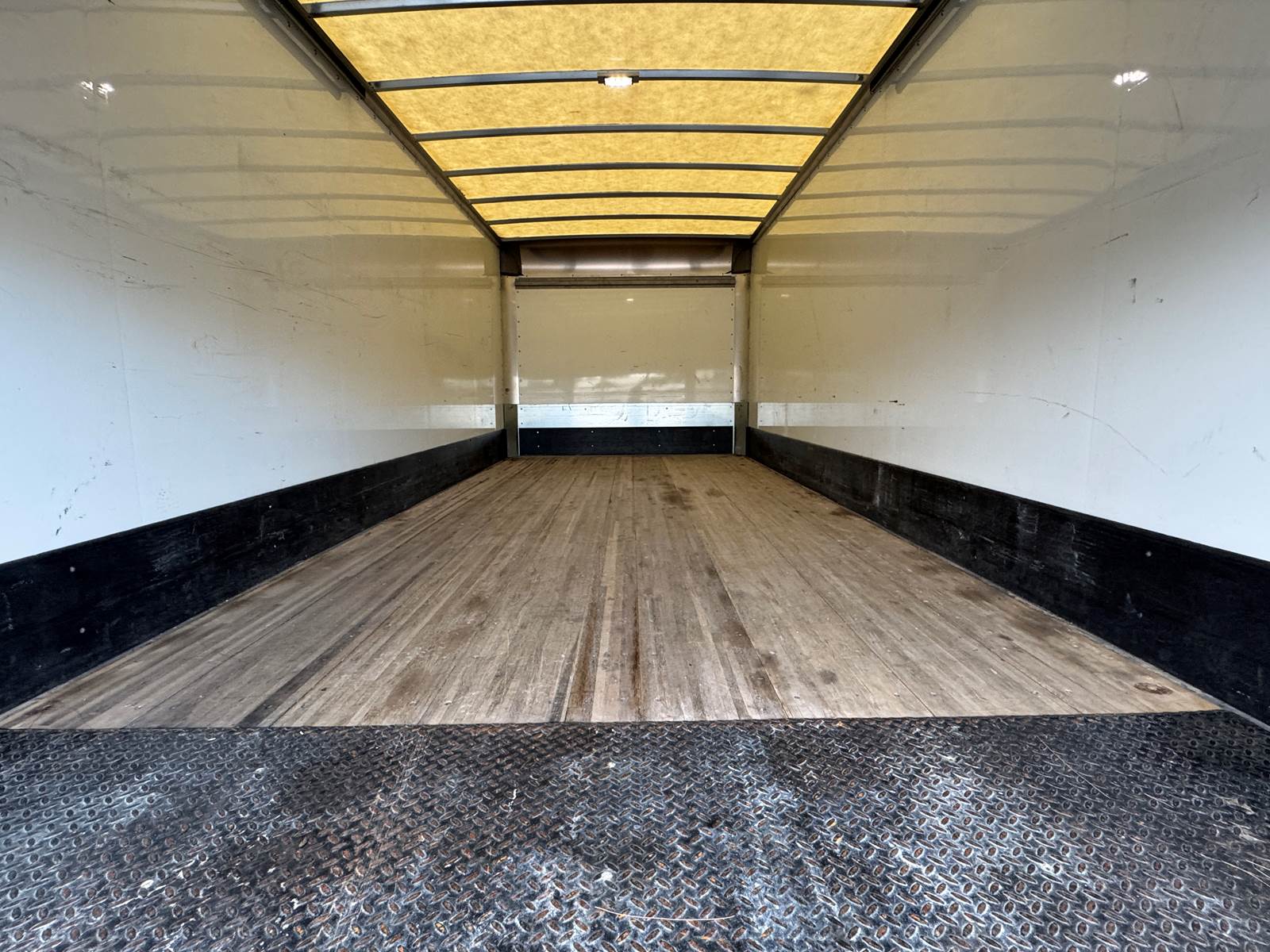 The dry box body is manufactured by Supreme (Model SVF20085102) and measures 20 feet in length, 102 inches in width, and 85 inches in interior height. The cargo area features a wood floor, Kemlite lining, and a translucent roof for added interior lighting. It is not insulated and does not include E-tracks. The rear door is a roll-up style.