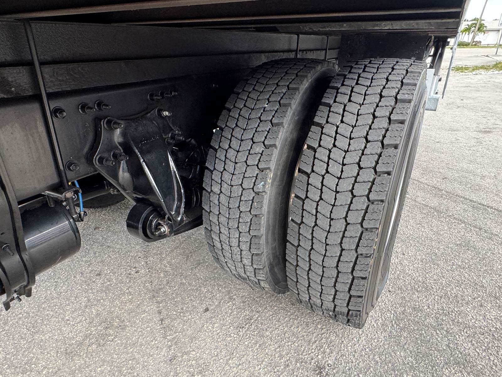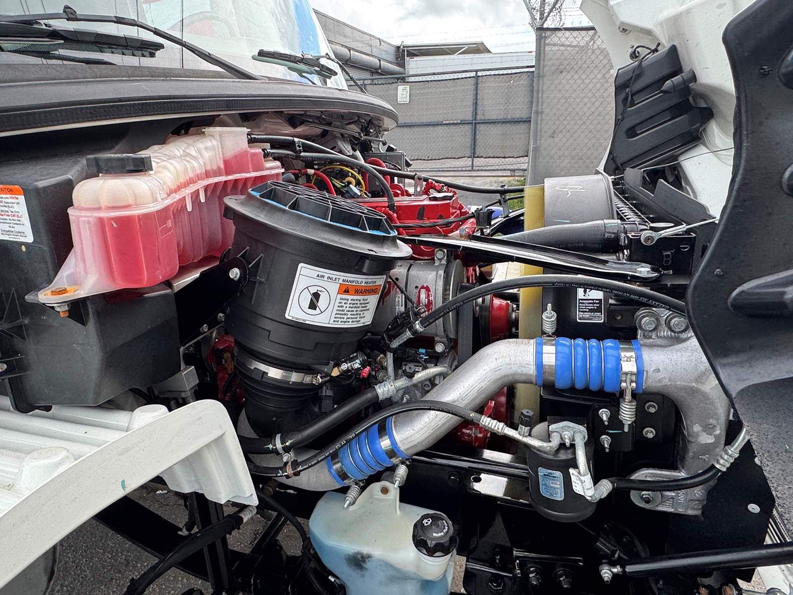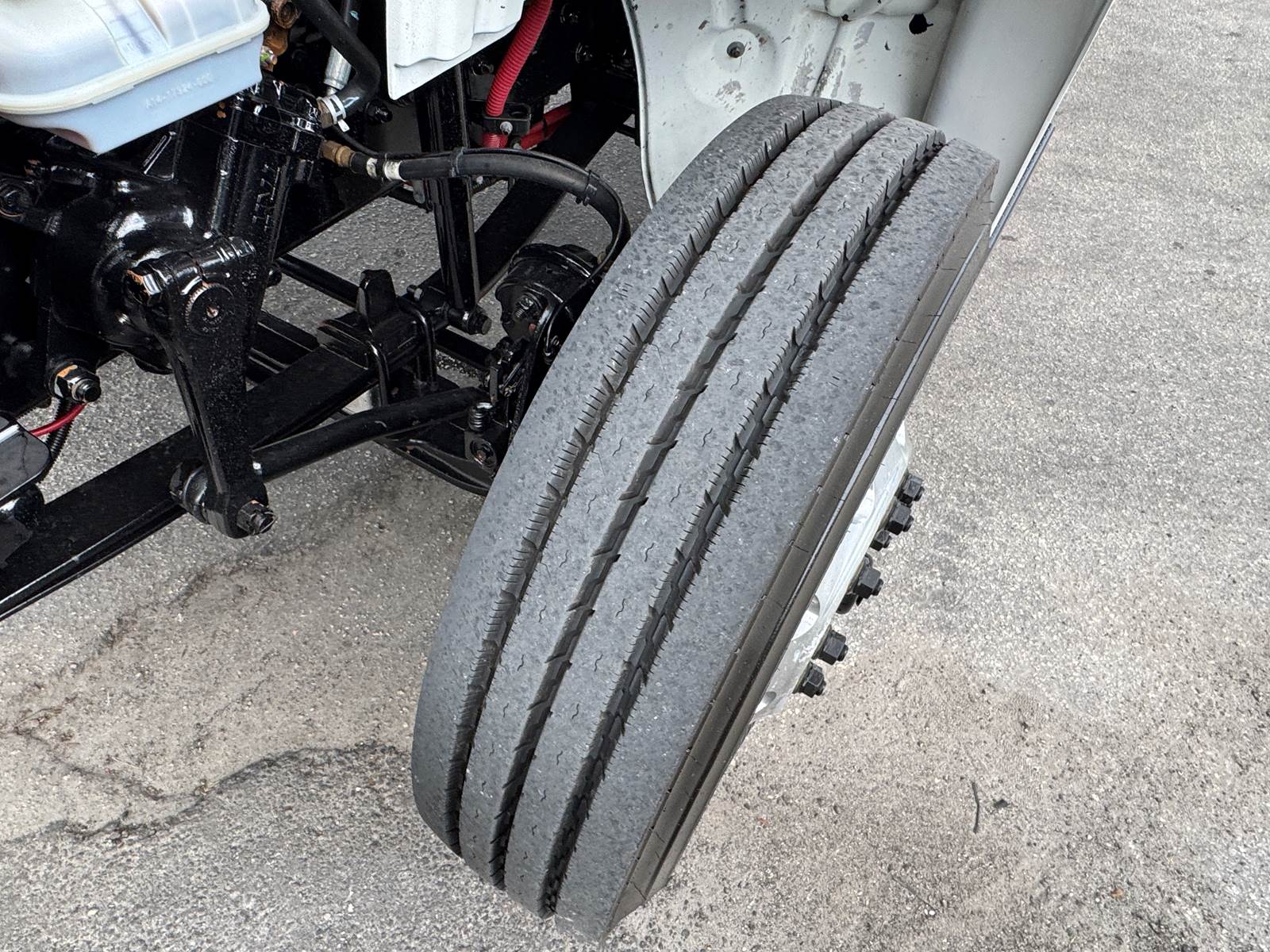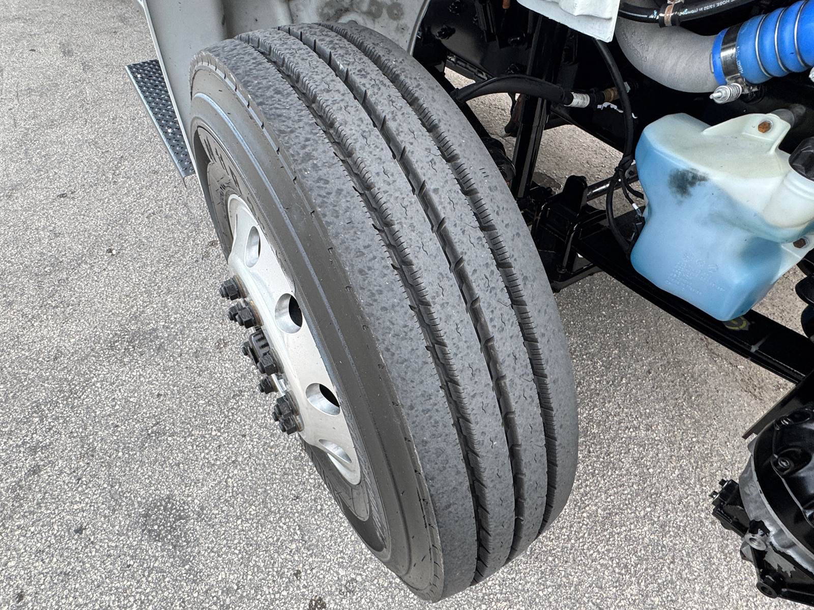 With a GVWR of 33,000 lbs, this truck falls within the Class 7 medium-duty category. Axle ratings include 12,000 lbs front axle capacity and 21,000 lbs rear axle capacity, supported by a 216-inch wheelbase. Fuel capacity is 80 gallons (diesel).