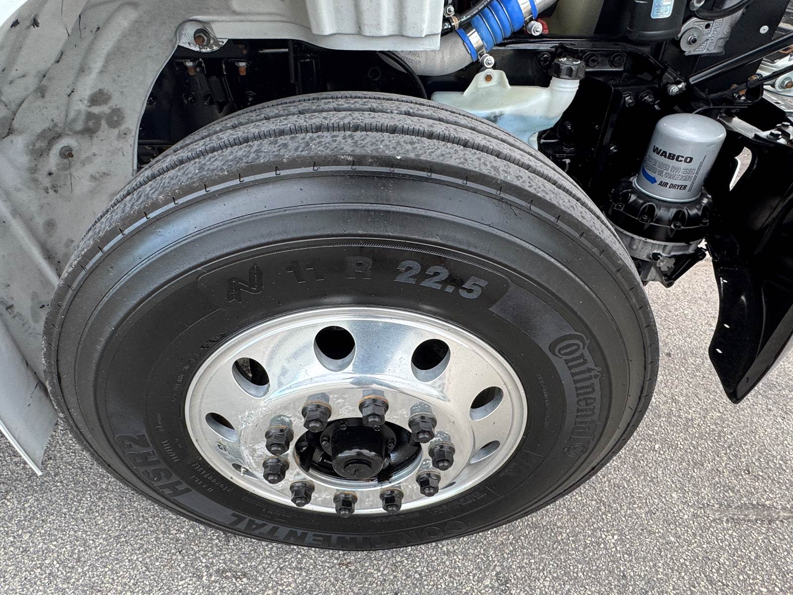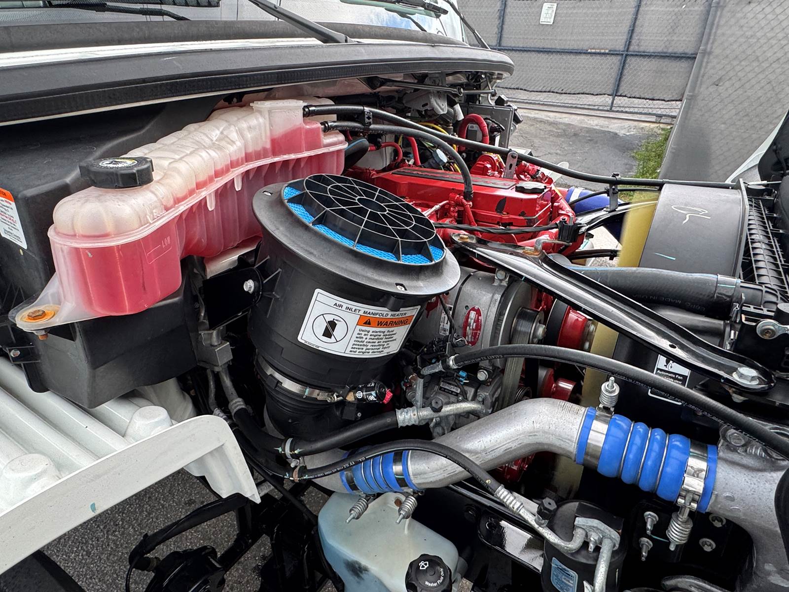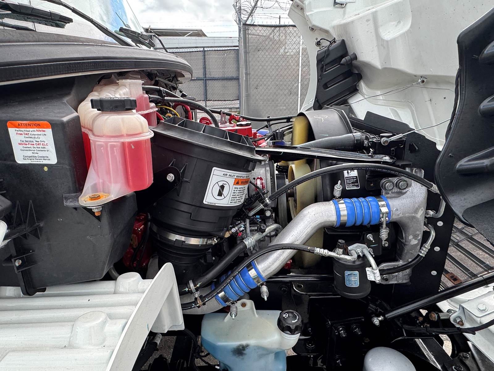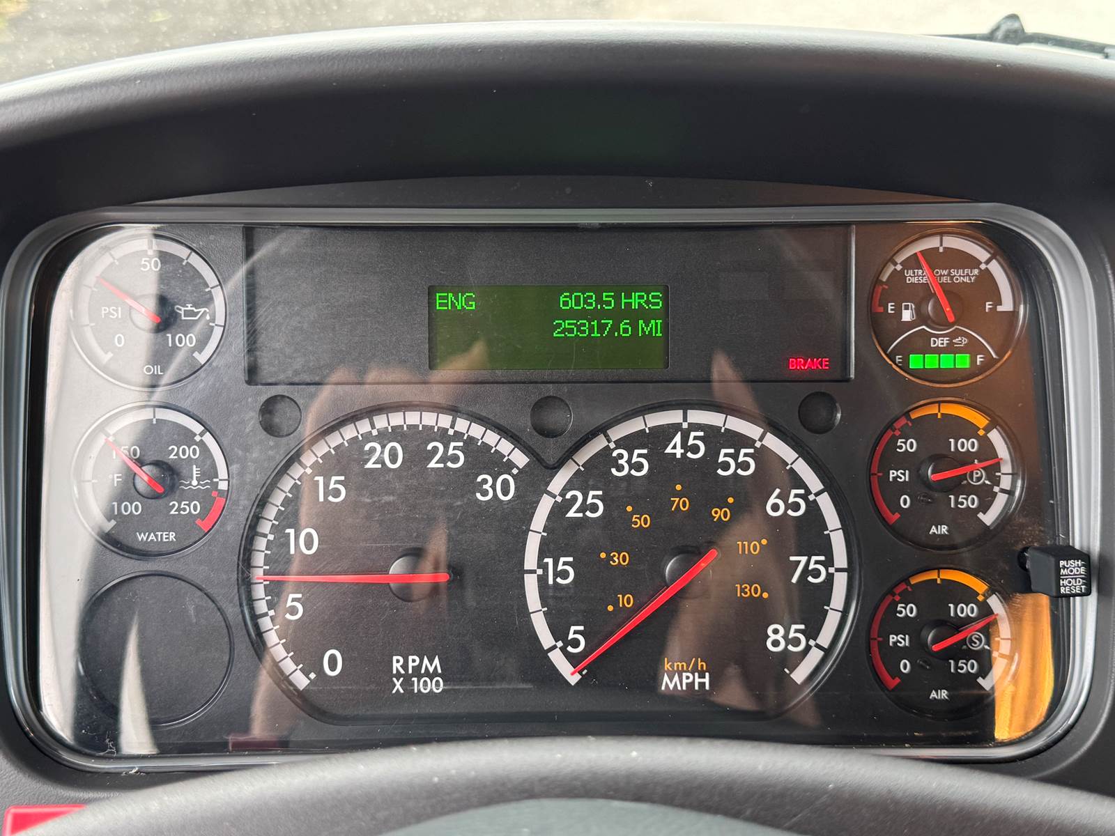 With a GVWR of 33,000 lbs, this truck falls within the Class 7 medium-duty category. Axle ratings include 12,000 lbs front axle capacity and 21,000 lbs rear axle capacity, supported by a 216-inch wheelbase. Fuel capacity is 80 gallons (diesel).