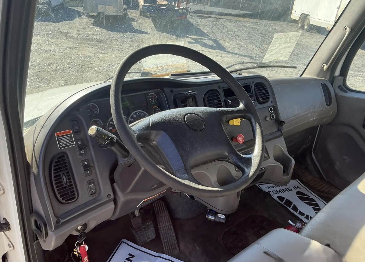 The truck rides on Freightliner spring suspension with an air brake system and utilizes a single rear axle configuration. It carries a 33,000 lb GVWR supported by a 13,220 lb front axle rating and a 21,000 lb rear axle rating, along with a 190-inch wheelbase and steel wheels, providing a stable and durable platform for heavy-duty utility work.