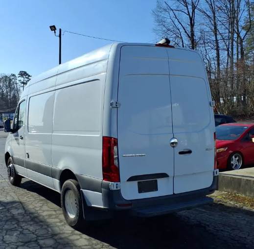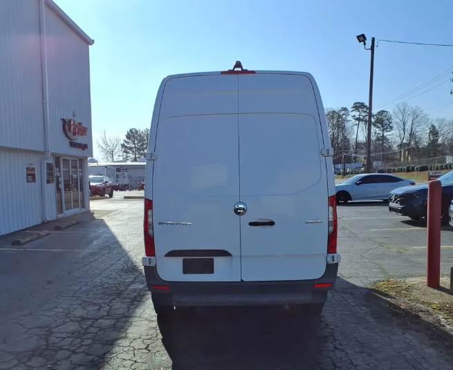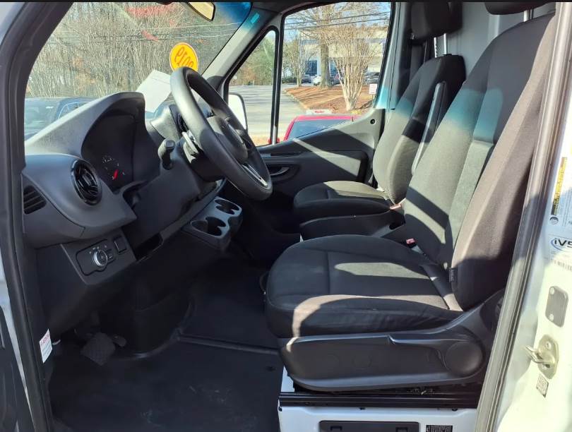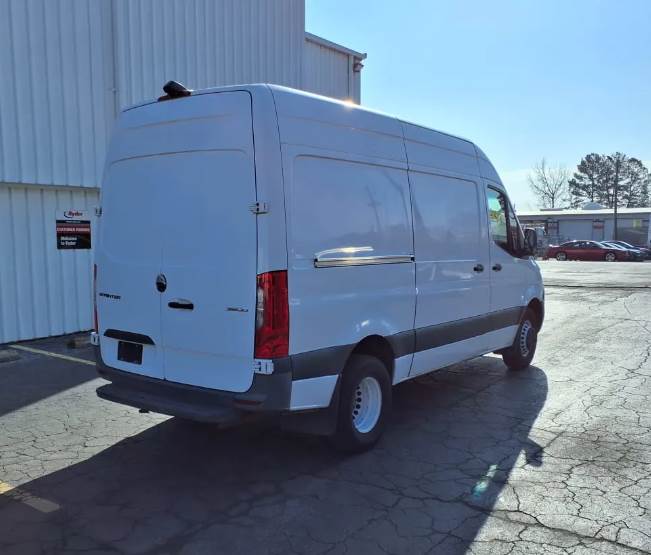 The van rides on Mercedes-Benz spring suspension with a hydraulic braking system and utilizes a single rear axle with dual rear wheel configuration, enhancing stability and load-carrying capability. It carries a 9,990 lb GVWR supported by a 5,445 lb front axle rating and a 7,060 lb rear axle rating, along with a 144-inch wheelbase and all-steel construction, making it both durable and highly maneuverable for delivery applications.