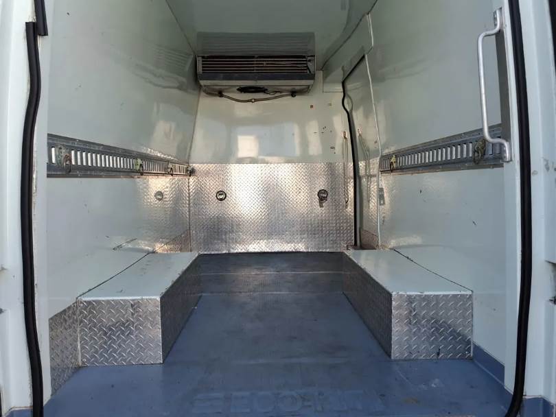The refrigerated cargo area is insulated and constructed with aluminum and Kemlite interior lining for durability, sanitation, and temperature retention. The unit is equipped with a Carrier Integra 30S engine-driven refrigeration system, providing consistent cooling performance during operation. The cargo space is accessible through full rear swing doors and a sliding curbside door, allowing efficient loading and unloading in tight urban environments. The high roof configuration provides increased interior height, improving usability and cargo handling.