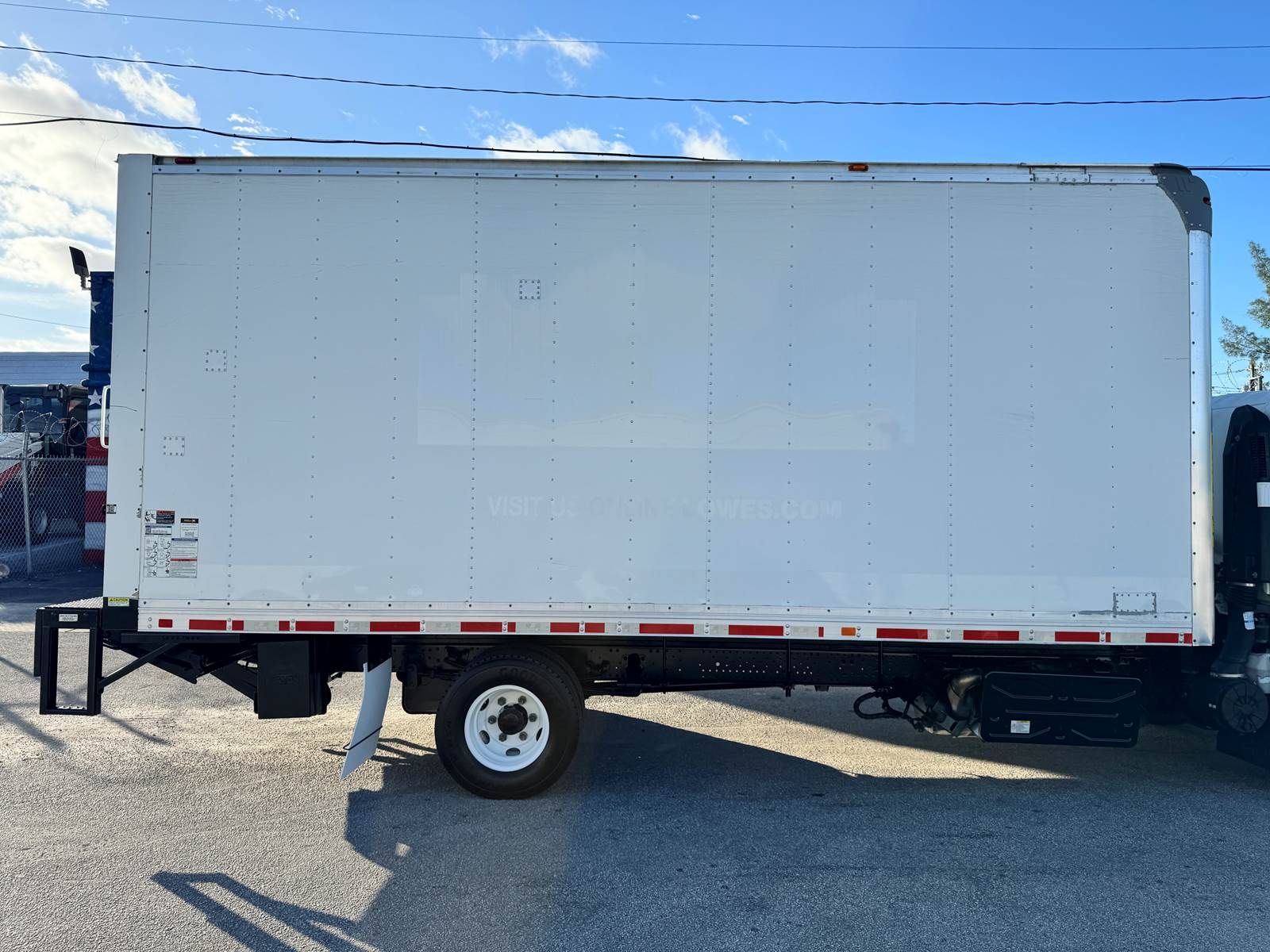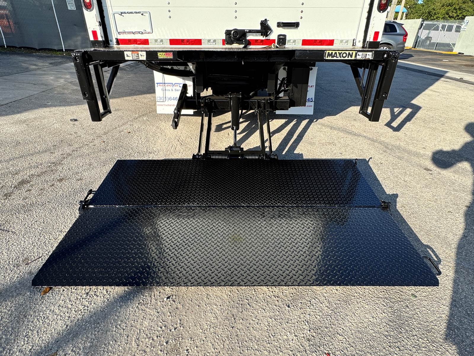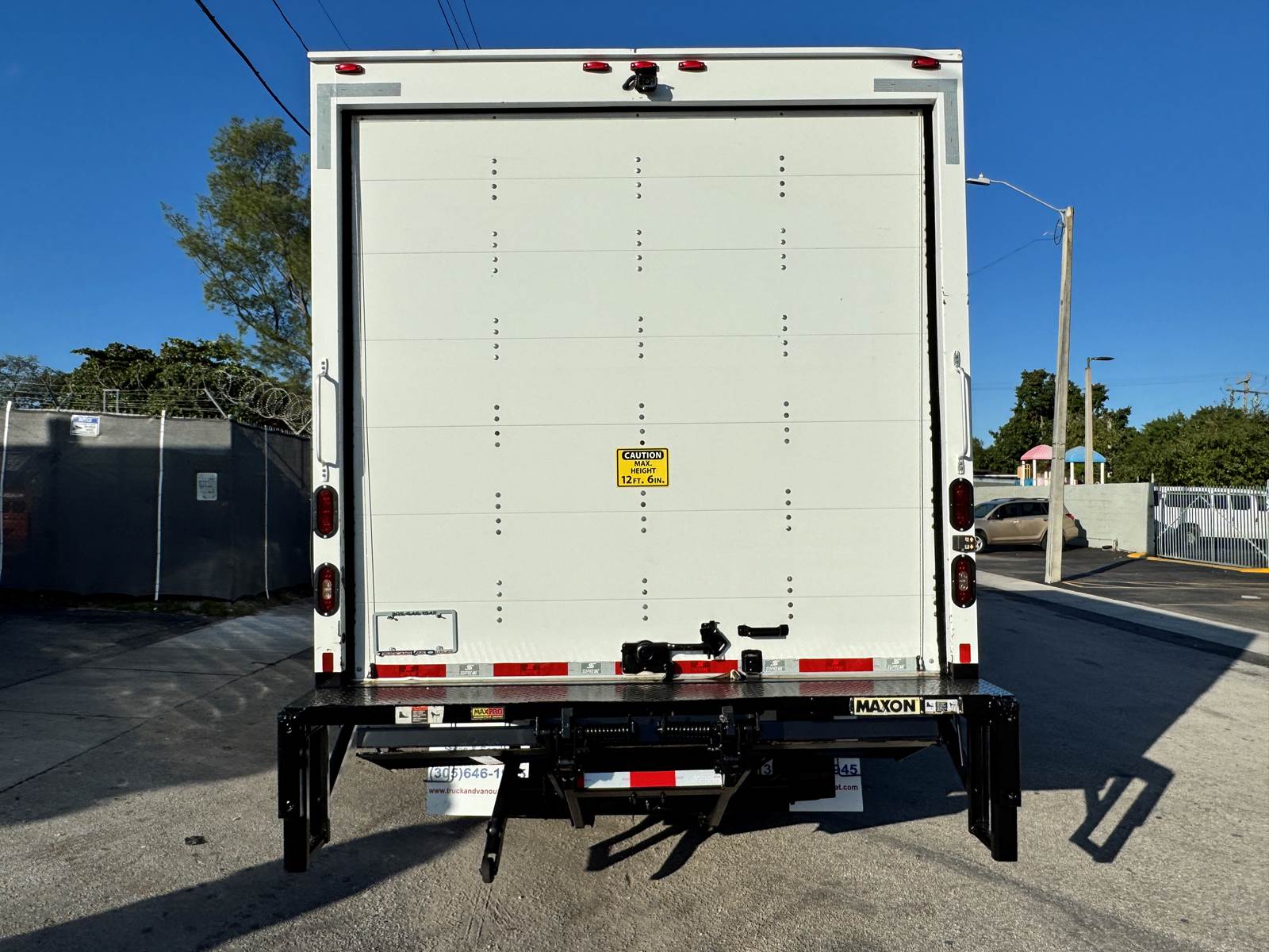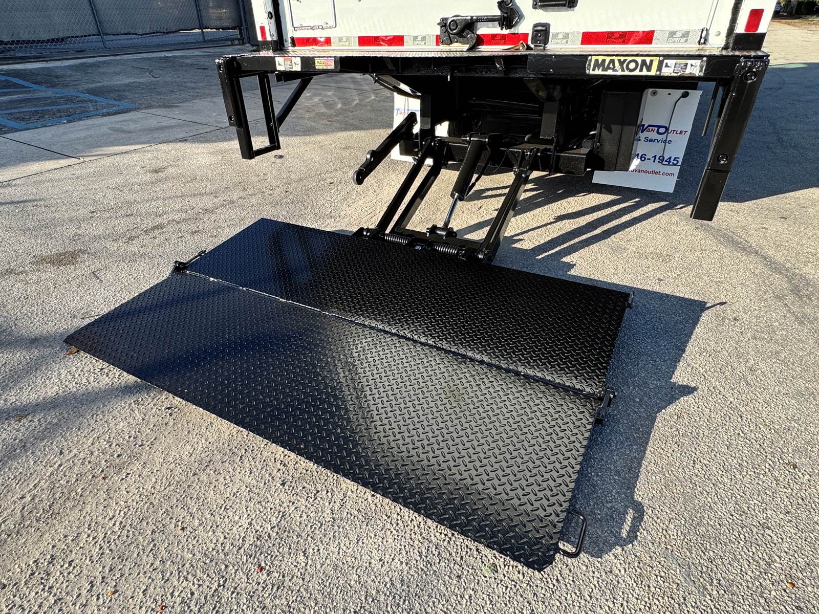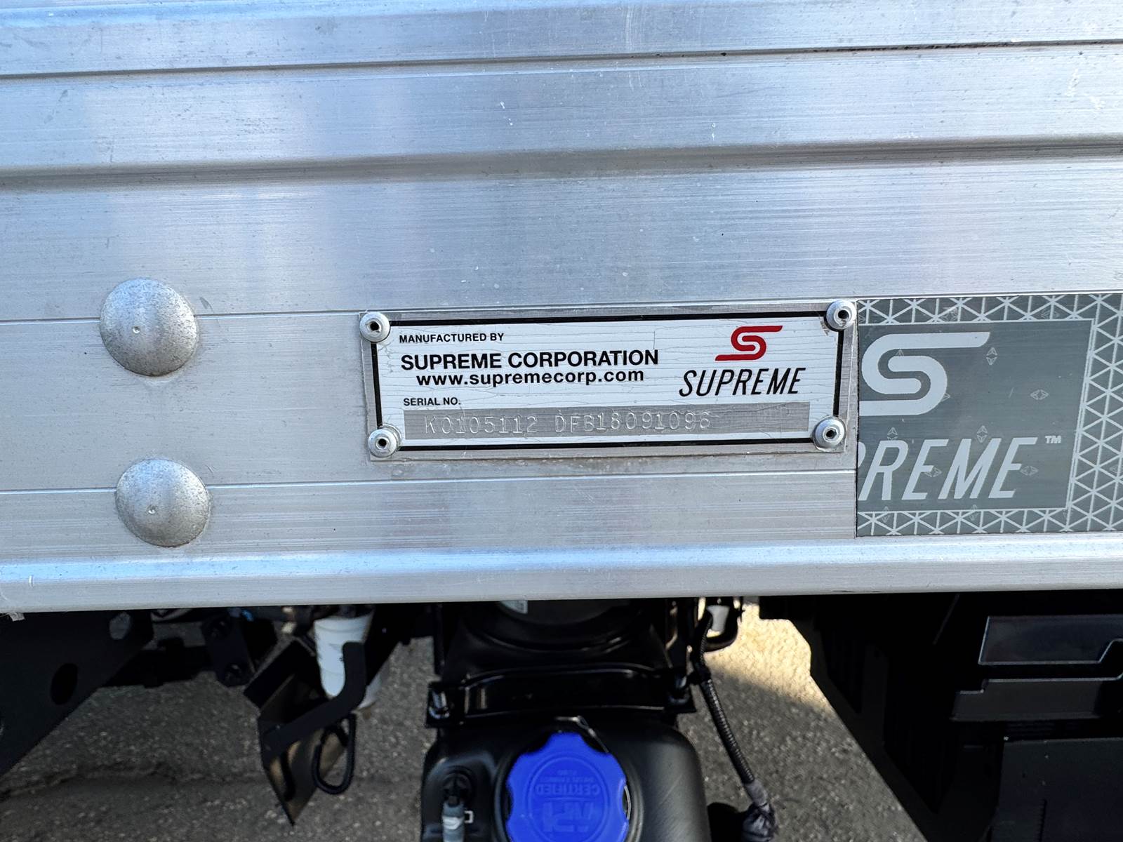 The truck features an 18-foot Supreme SVA1891096 dry van body with a hardwood floor, roll-up rear door, and translucent roof that enhances visibility inside the cargo space. Measuring 96” wide by 91” high, the box offers generous capacity for local and regional delivery routes. The Maxon TE-25 tuck-under liftgate, rated at 2,500 lbs, ensures reliable and efficient cargo loading for pallets, equipment, or heavy freight.