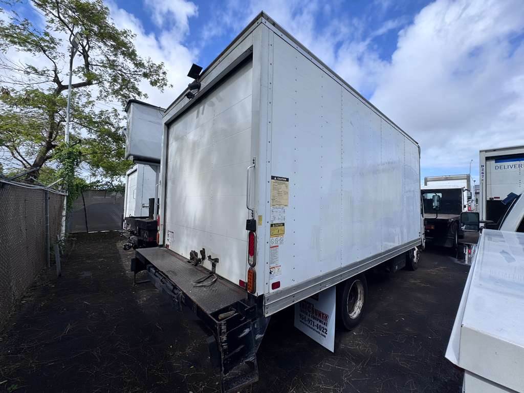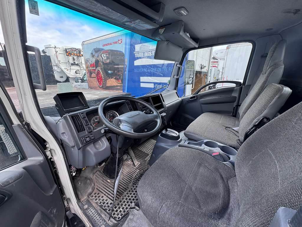The truck rides on Isuzu spring suspension with hydraulic brakes and utilizes a single rear axle configuration. It carries a 16,000 lb GVWR supported by a 6,630 lb front axle rating and an 11,020 lb rear axle rating, along with a 150-inch wheelbase and steel wheels, offering a stable and practical delivery platform.