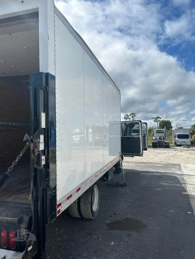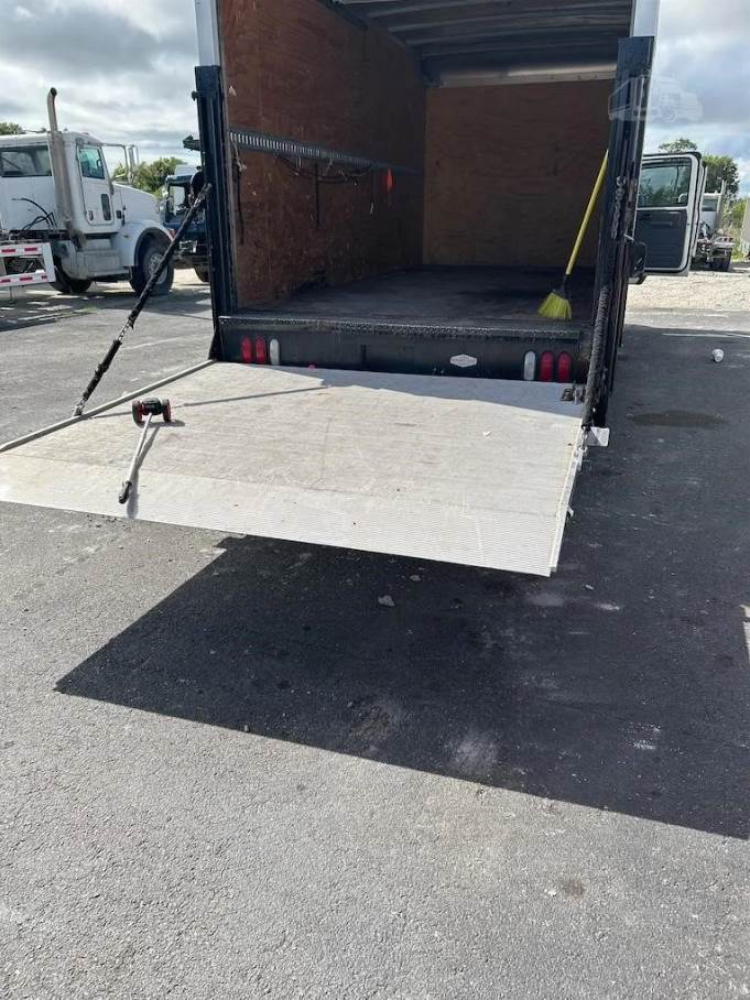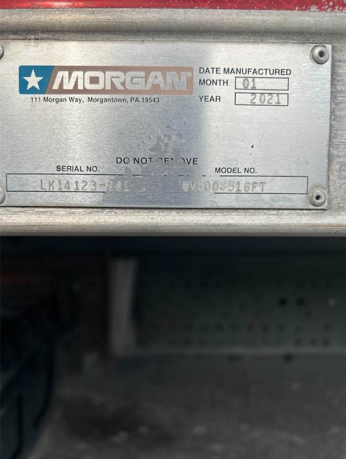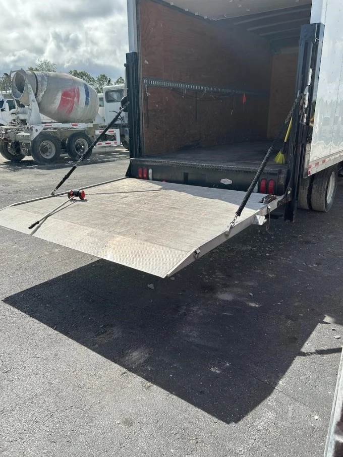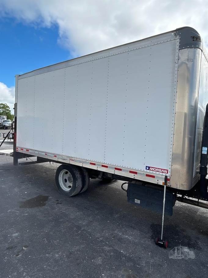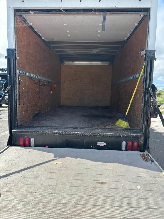 The cargo body is a 16-foot Morgan dry box (Model GVSD08516FT) measuring approximately 96 inches in width and 85 inches in interior height. The cargo area features a durable wood floor with plywood interior lining and is equipped with one row of aluminum E-track for cargo securement. The rear of the truck includes a roll-up door for easy access and a rail-style liftgate (Model 89-30EA55) rated at 3,000 lbs, allowing efficient loading and unloading of palletized goods and heavy materials.