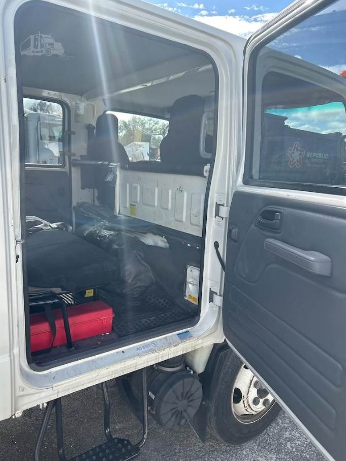 Finished in white with a gray crew cab interior, this truck provides seating for multiple passengers, making it especially valuable for crews that need to transport both personnel and equipment to job sites. The truck is equipped with air conditioning, cruise control, power windows, and power door locks, ensuring comfort and convenience during operation.