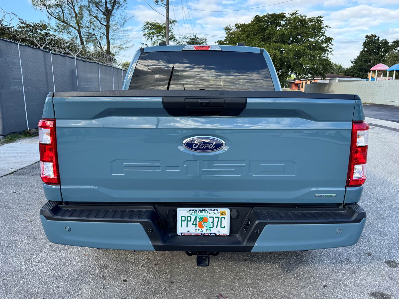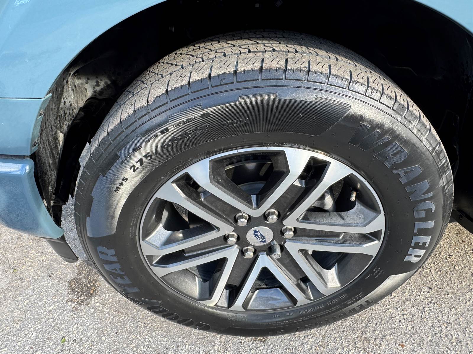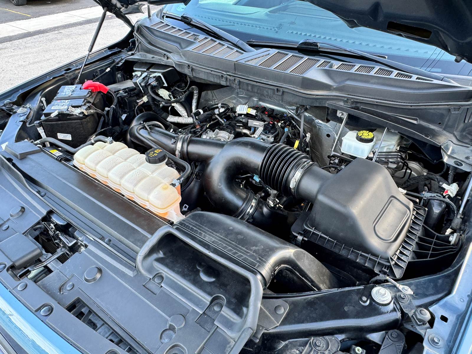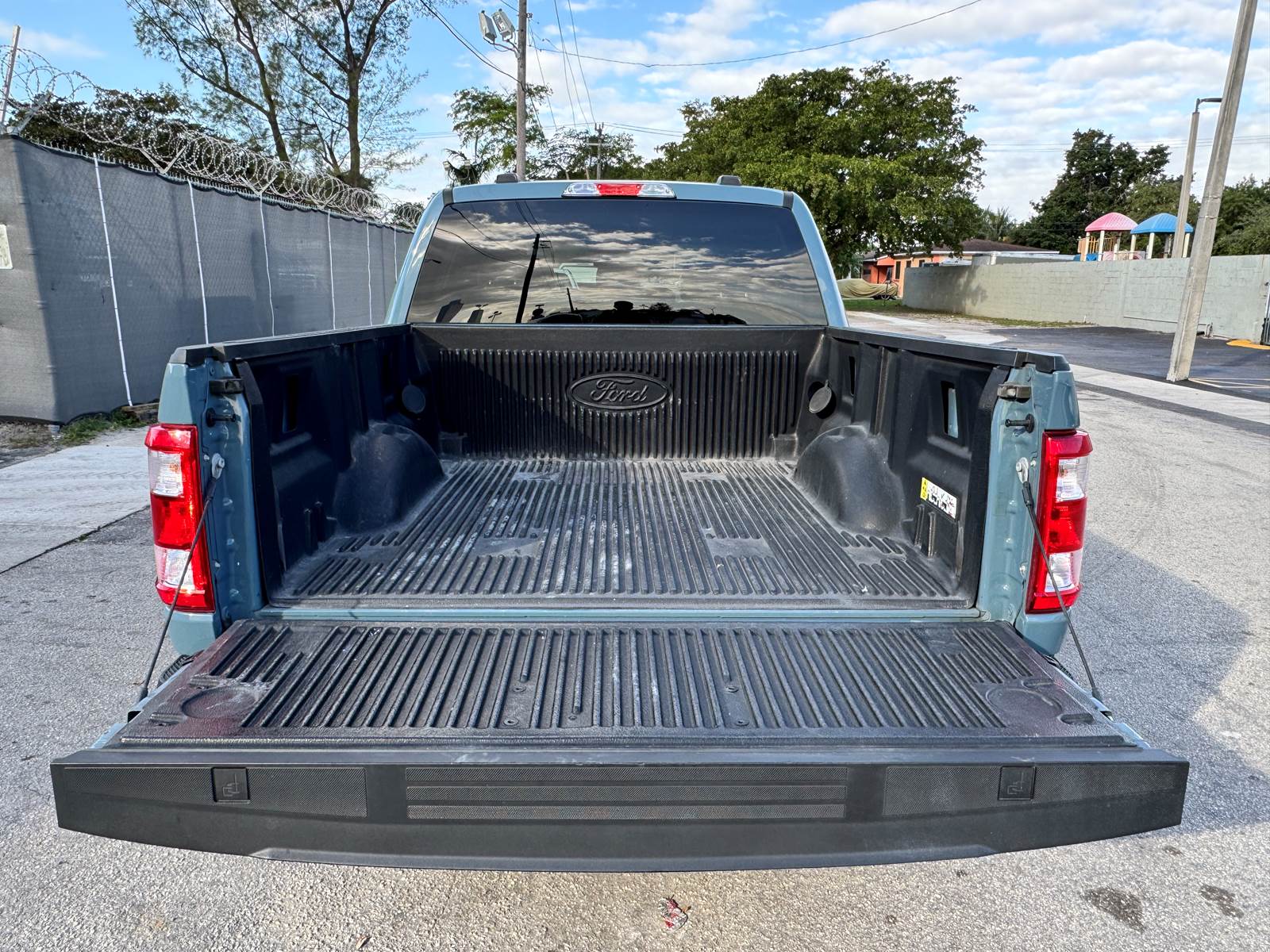 The aluminum bed measures 5.5 feet in length and is matched with an aluminum body finished in Area 51 Blue. The wheelbase measures 145 inches, supported by aluminum wheels and platform running boards. The cab features a black interior and includes A/C, cruise control, power windows, and power locks. With a GVWR of 6,400 lbs, front axle weight rating of 3,150 lbs, rear axle weight rating of 3,400 lbs, and a 26-gallon gasoline fuel tank, this F-150 is well-suited for daily driving and light hauling.