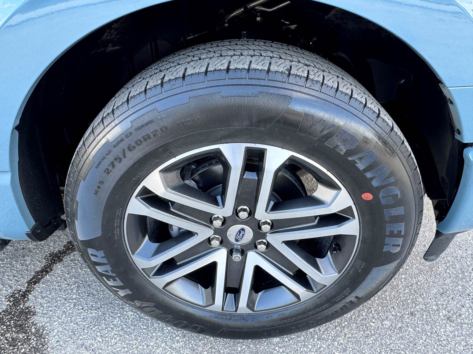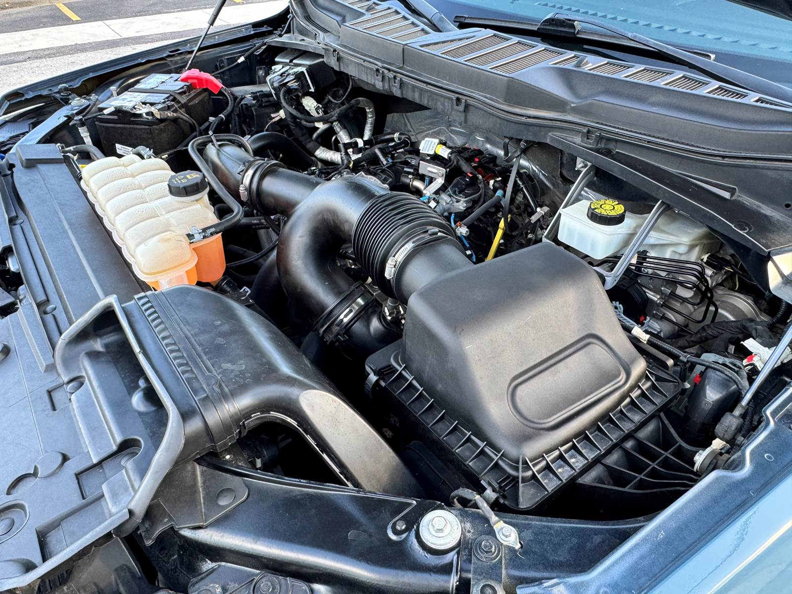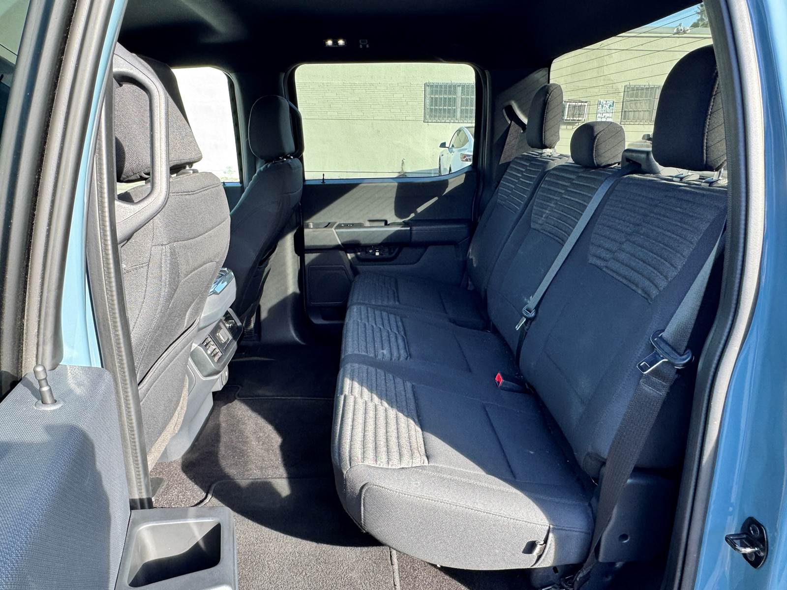 The aluminum bed measures 5.5 feet in length and is matched with an aluminum body finished in Area 51 Blue. The wheelbase measures 145 inches, supported by aluminum wheels and platform running boards. The cab features a black interior and includes A/C, cruise control, power windows, and power locks. With a GVWR of 6,400 lbs, front axle weight rating of 3,150 lbs, rear axle weight rating of 3,400 lbs, and a 26-gallon gasoline fuel tank, this F-150 is well-suited for daily driving and light hauling.