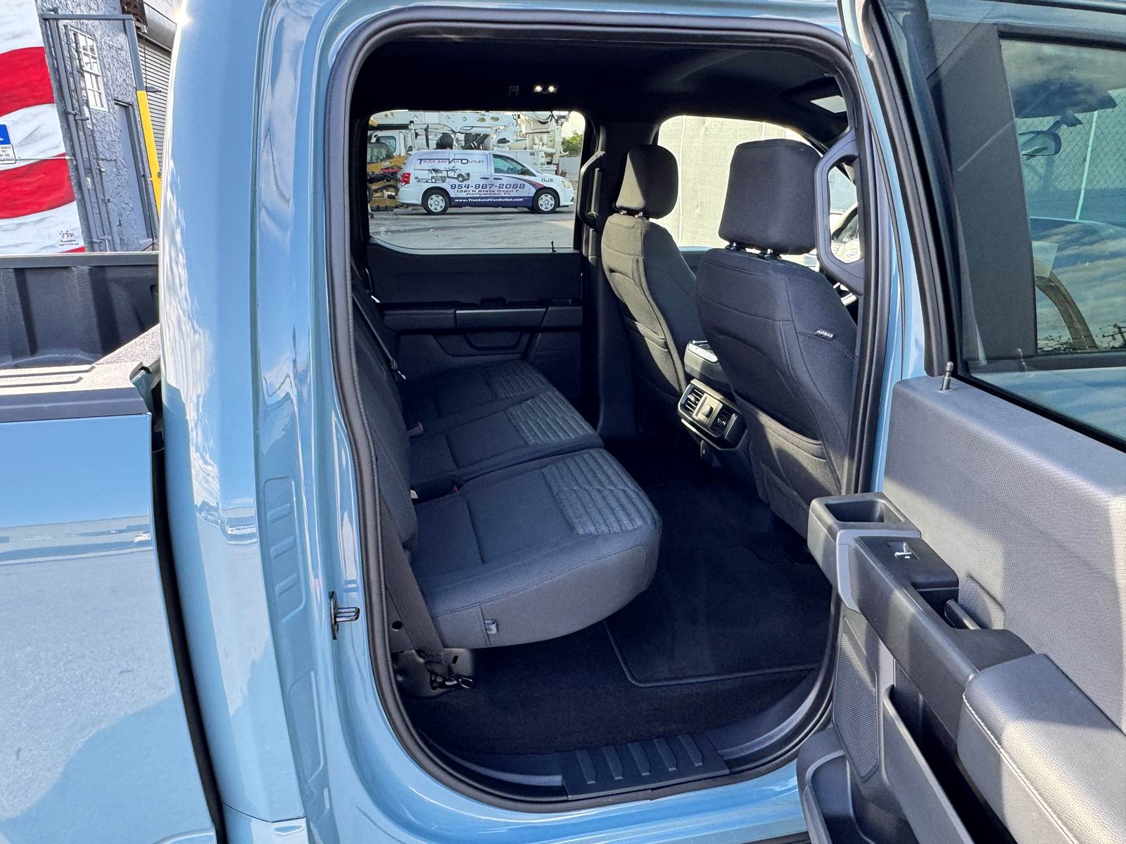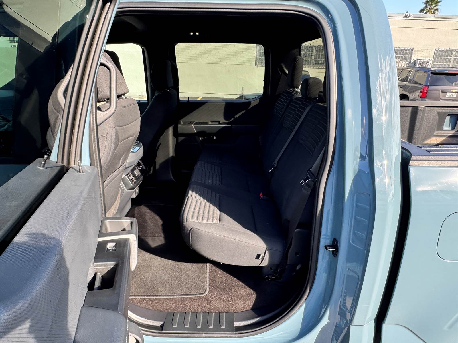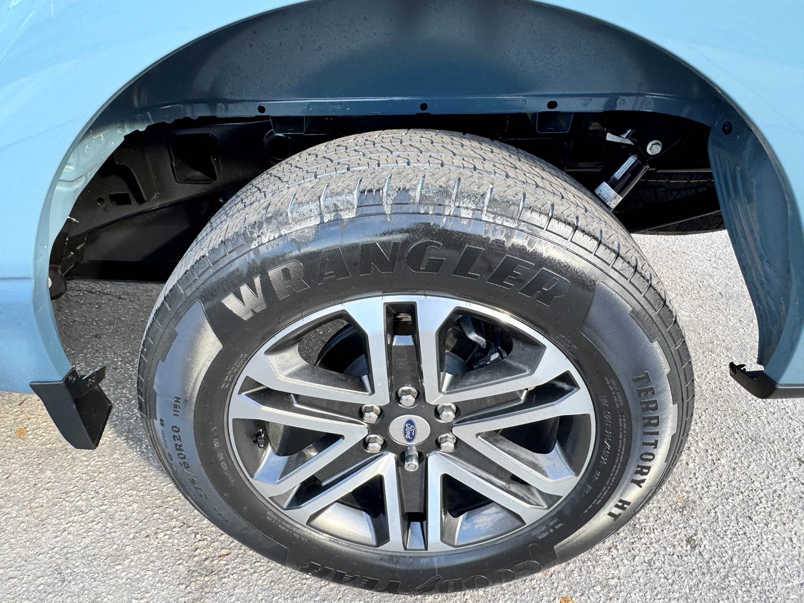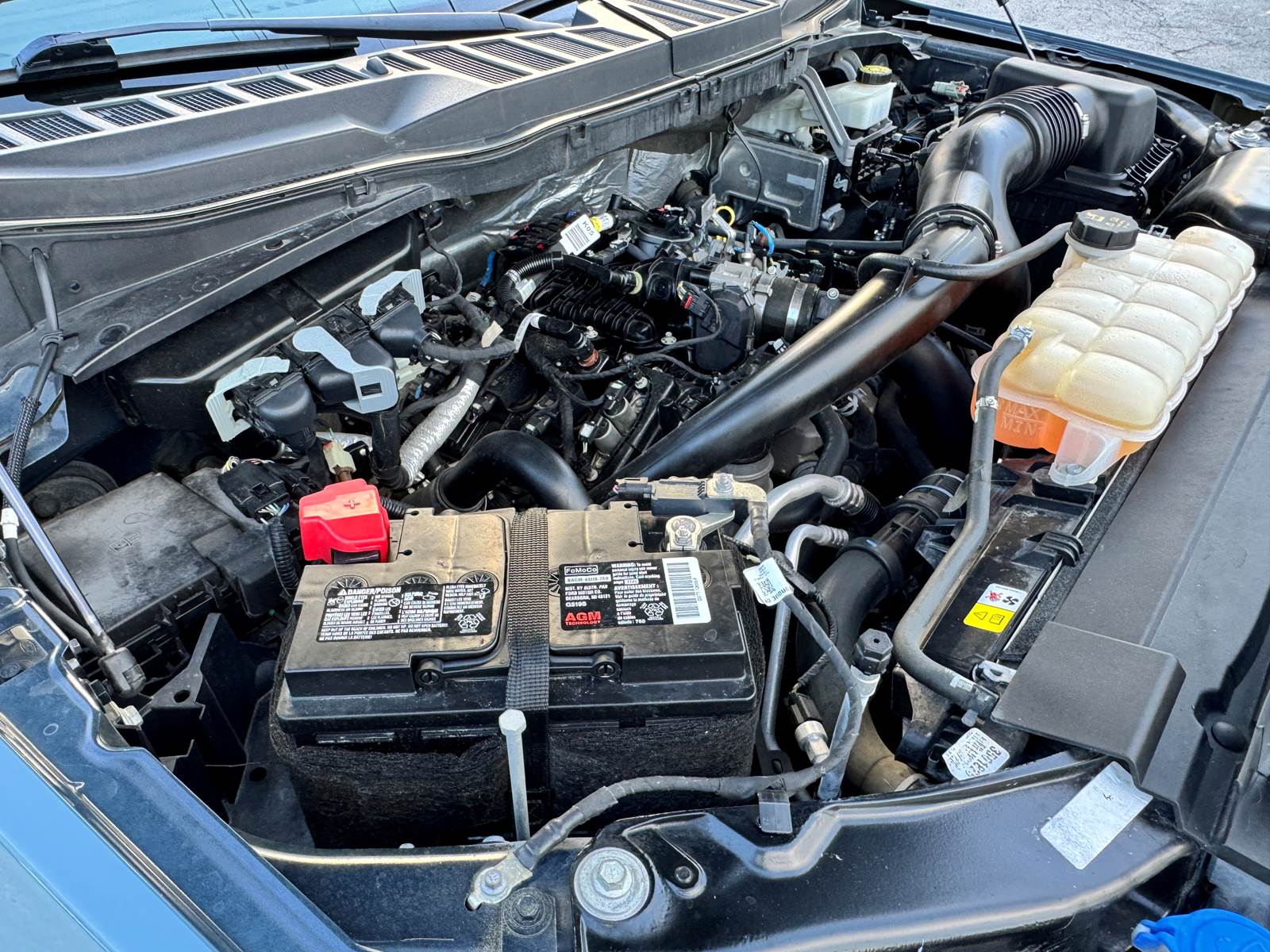 The aluminum bed measures 5.5 feet in length and is matched with an aluminum body finished in Area 51 Blue. The wheelbase measures 145 inches, supported by aluminum wheels and platform running boards. The cab features a black interior and includes A/C, cruise control, power windows, and power locks. With a GVWR of 6,400 lbs, front axle weight rating of 3,150 lbs, rear axle weight rating of 3,400 lbs, and a 26-gallon gasoline fuel tank, this F-150 is well-suited for daily driving and light hauling.