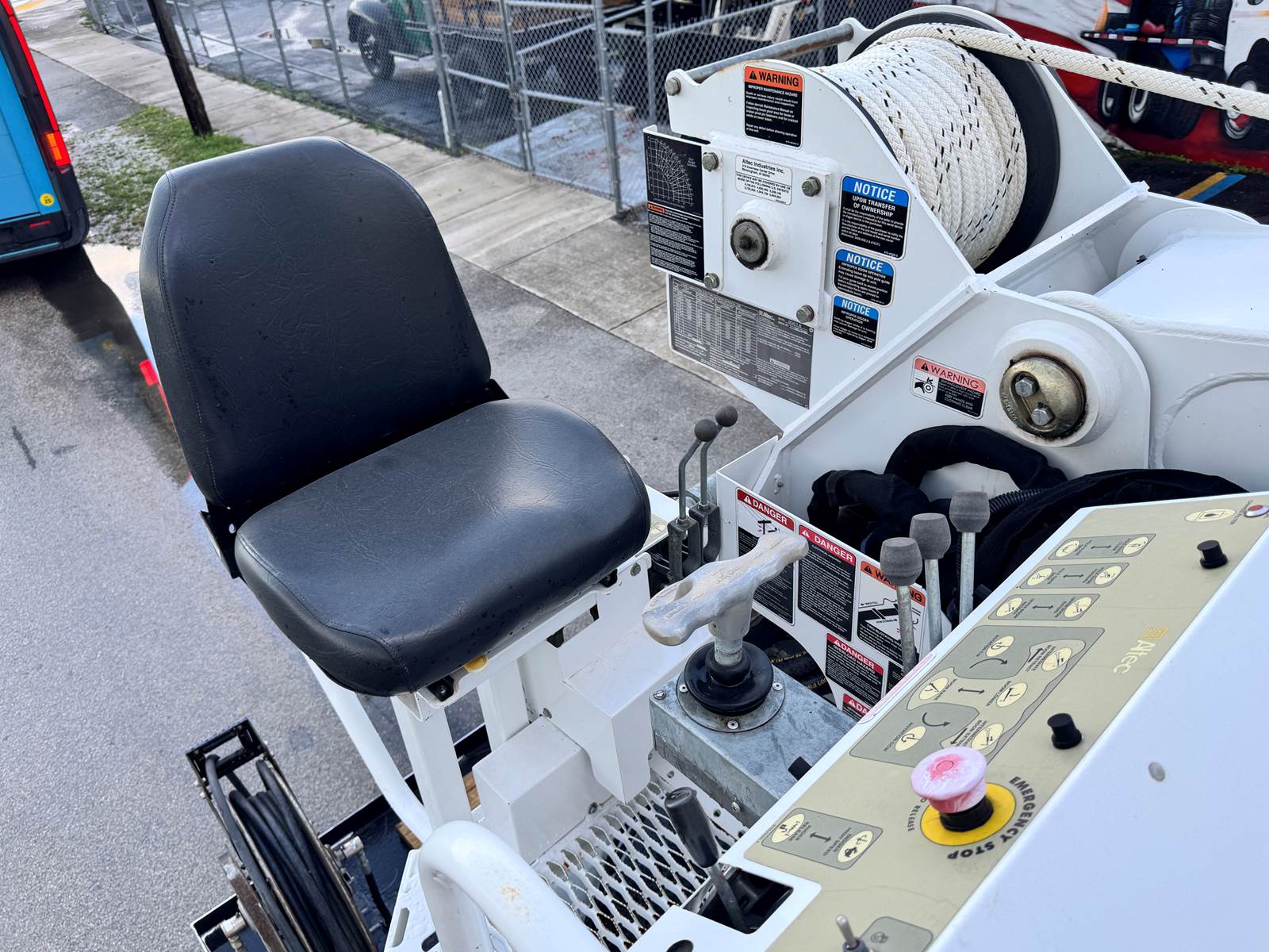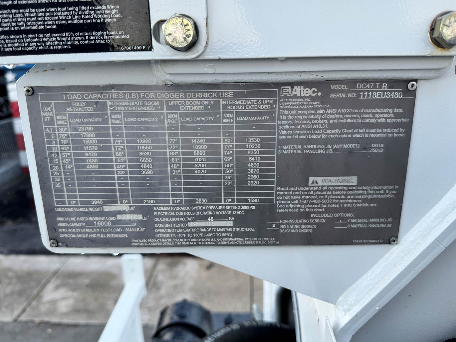 The Altec DC47-TR digger derrick features a 23,790 lb maximum lift capacity, 47’ sheave height, and 37.3’ reach from the centerline of rotation. Outfitted with a 2-speed digger, heel winch, pole guides, four hydraulic outriggers, and a three-section hydraulic boom, it delivers exceptional lifting, digging, and pole-handling capabilities. Continuous rotation, a multi-lever control station with riding seat, and a 46 kV electrical insulation rating further enhance its safety and functionality for demanding field use.
