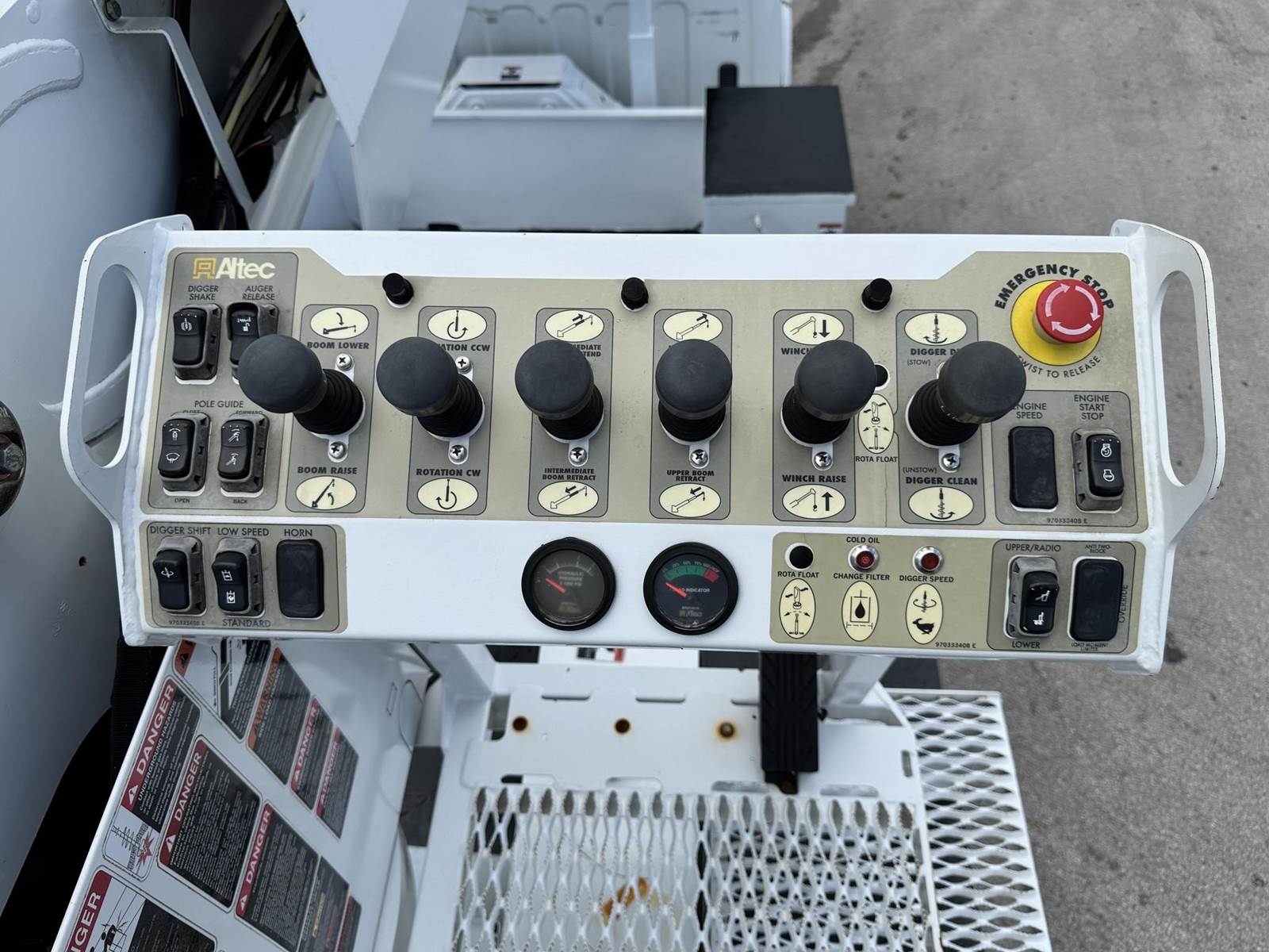 The Altec DM47B-TR derrick offers a 47-foot sheave height, 37.3-foot horizontal reach, and a maximum lifting capacity of 23,790 lbs. Features include a 3-section telescopic boom, 2-speed digger, 18-inch auger, continuous rotation, and a seated multi-lever operator control station for precision and comfort. The unit is electrically insulated to 46kV (Category C), equipped with pole grabs, a heel winch, and supported by four hydraulic outriggers for maximum stability during operation.