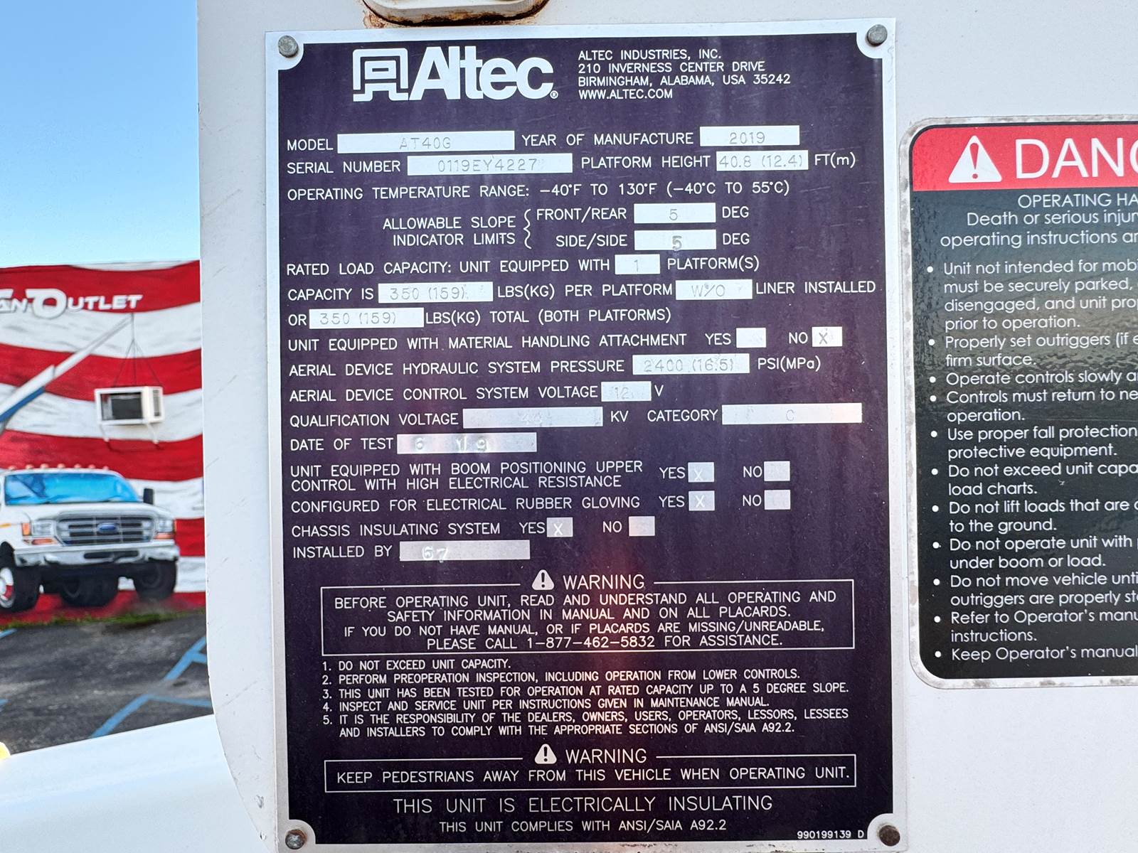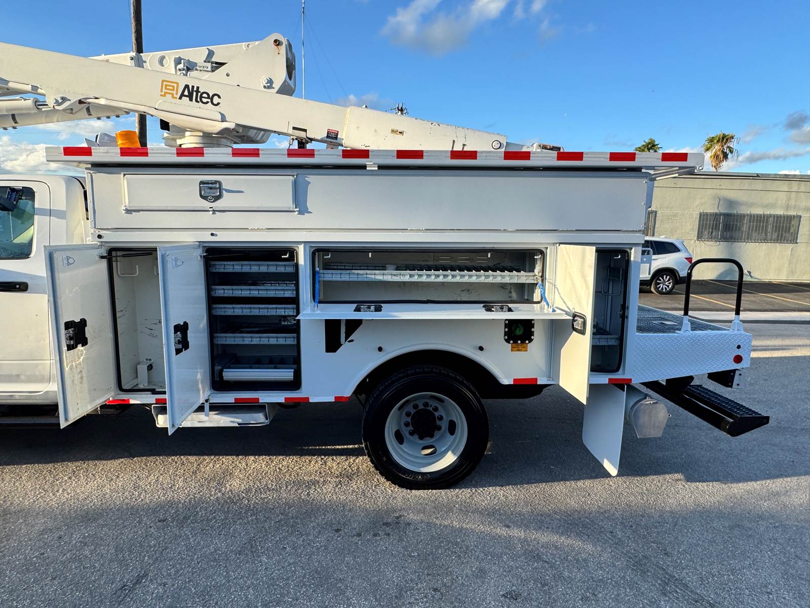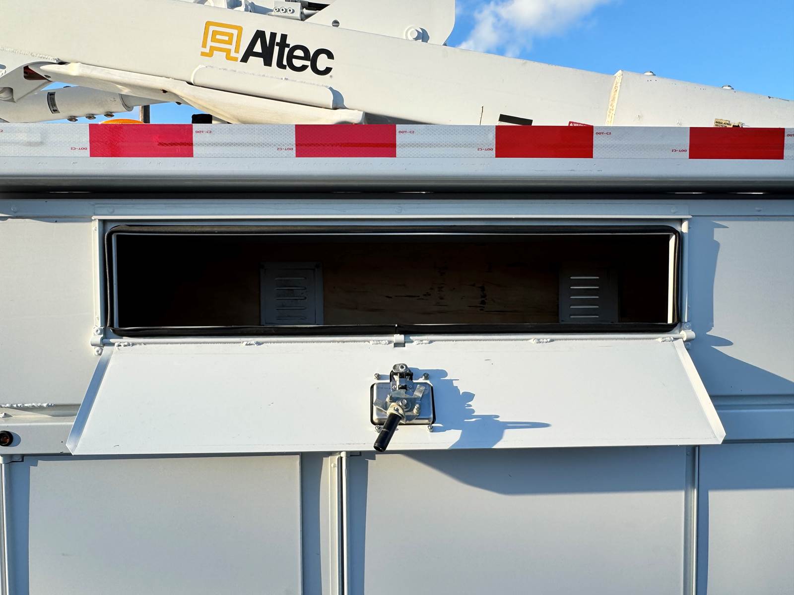 The Altec AT40G boom system delivers a 45.6’ working height, 40.6’ ground-to-platform measurement, and 29.7’ maximum side reach. Features include continuous rotation, Altec ISO-Grip control system, hydraulic platform leveling, and a 180° platform rotator. A side-mounted one-man platform with a 350 lb capacity, dual vertical outriggers, and a 46 kV insulation rating ensure safe and productive operation in the field. Added benefits such as a power inverter and power equipment package enhance functionality, while the chrome appearance package provides a professional presentation.